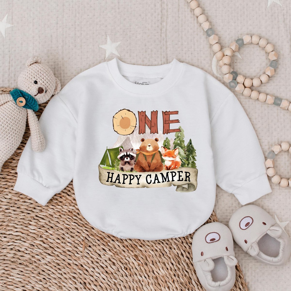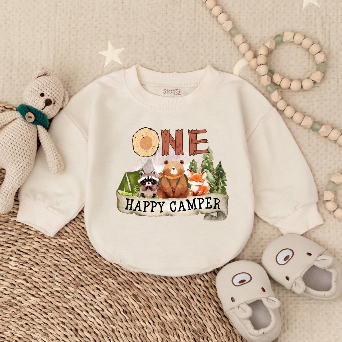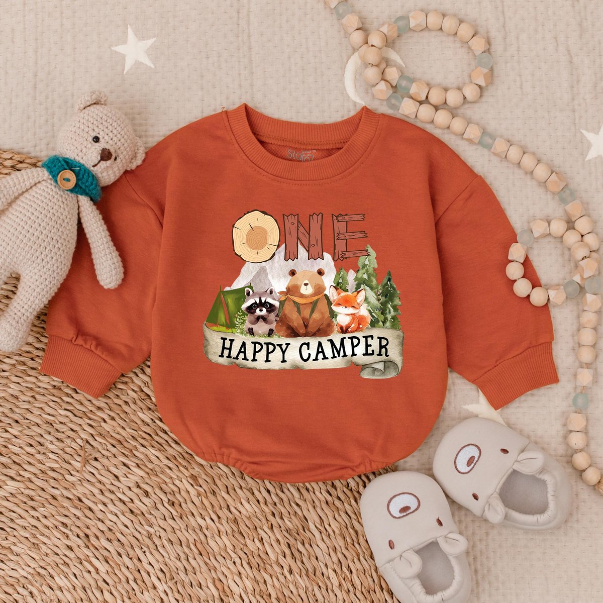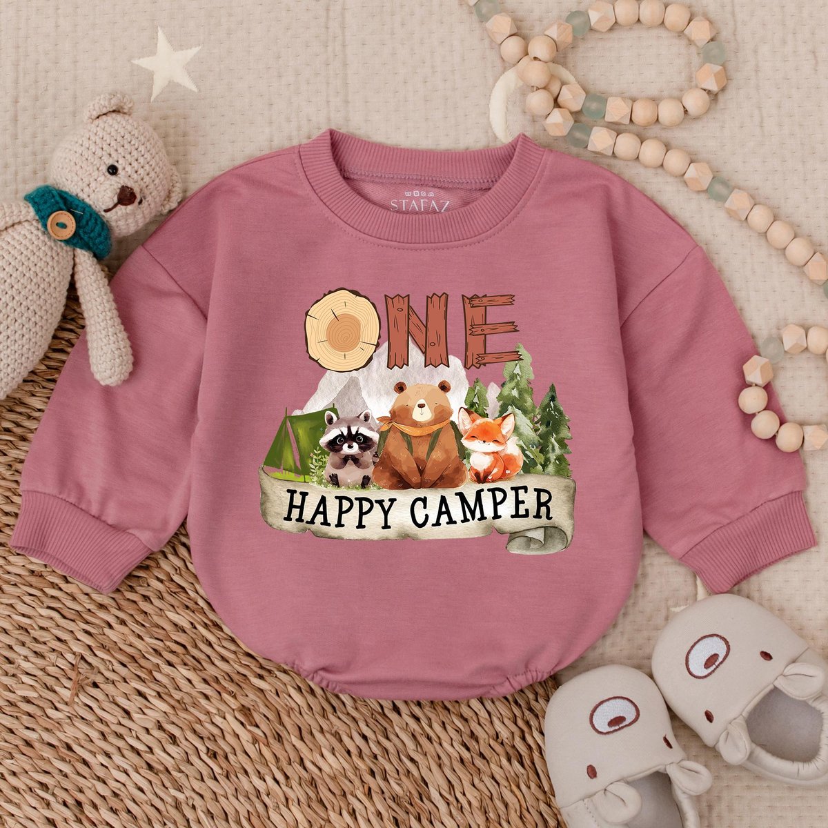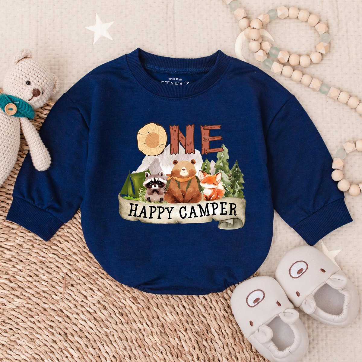 One Happy Camper Bubble Romper Camping 1st Birthday Bodysuit Boys First Birthday Outfit Adventure Bi