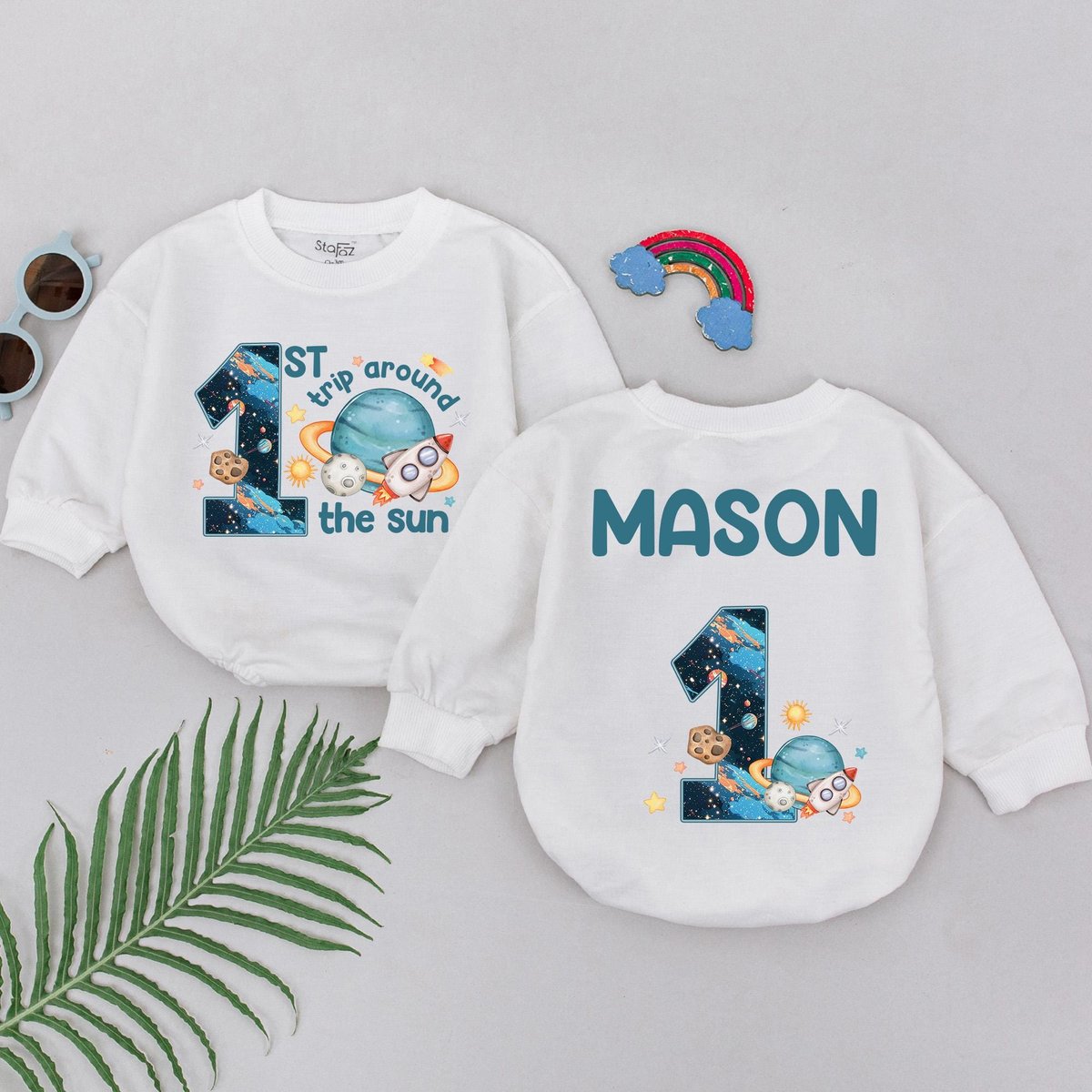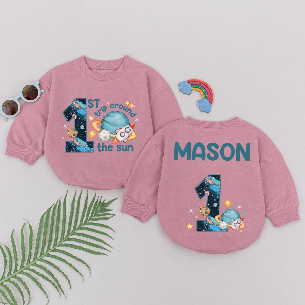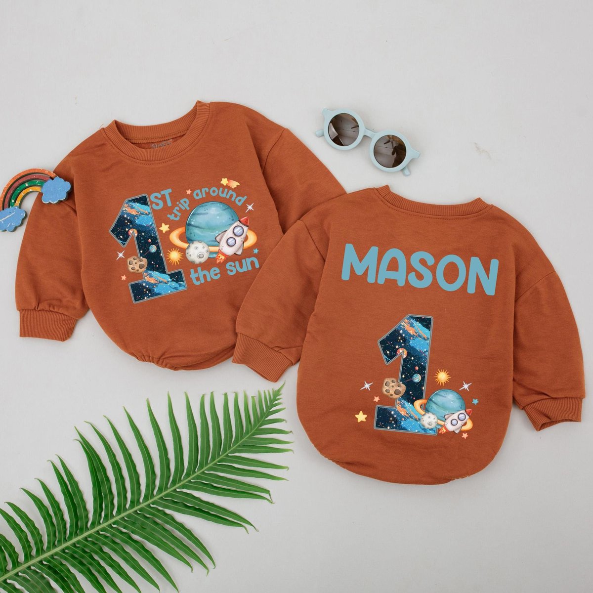 Personalized 1st Trip Around the Sun Bubble Romper Space Birthday Outfit Baby Boy Birthday Romper As