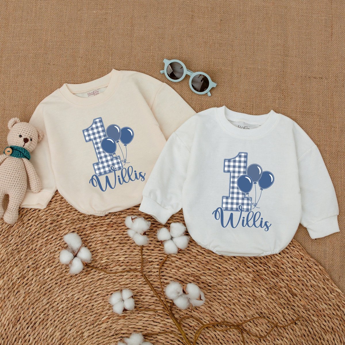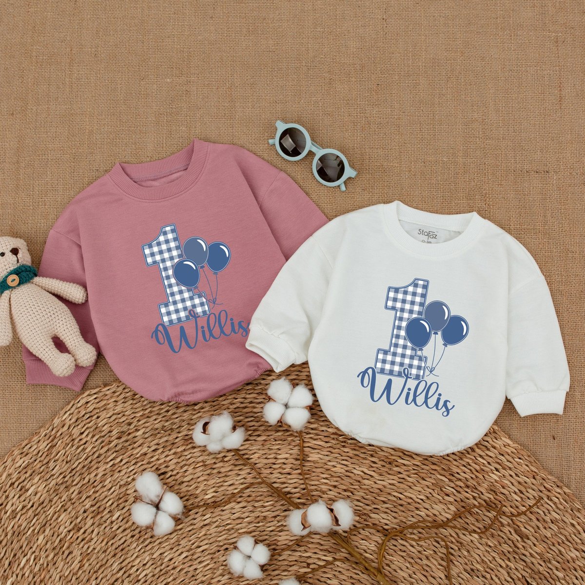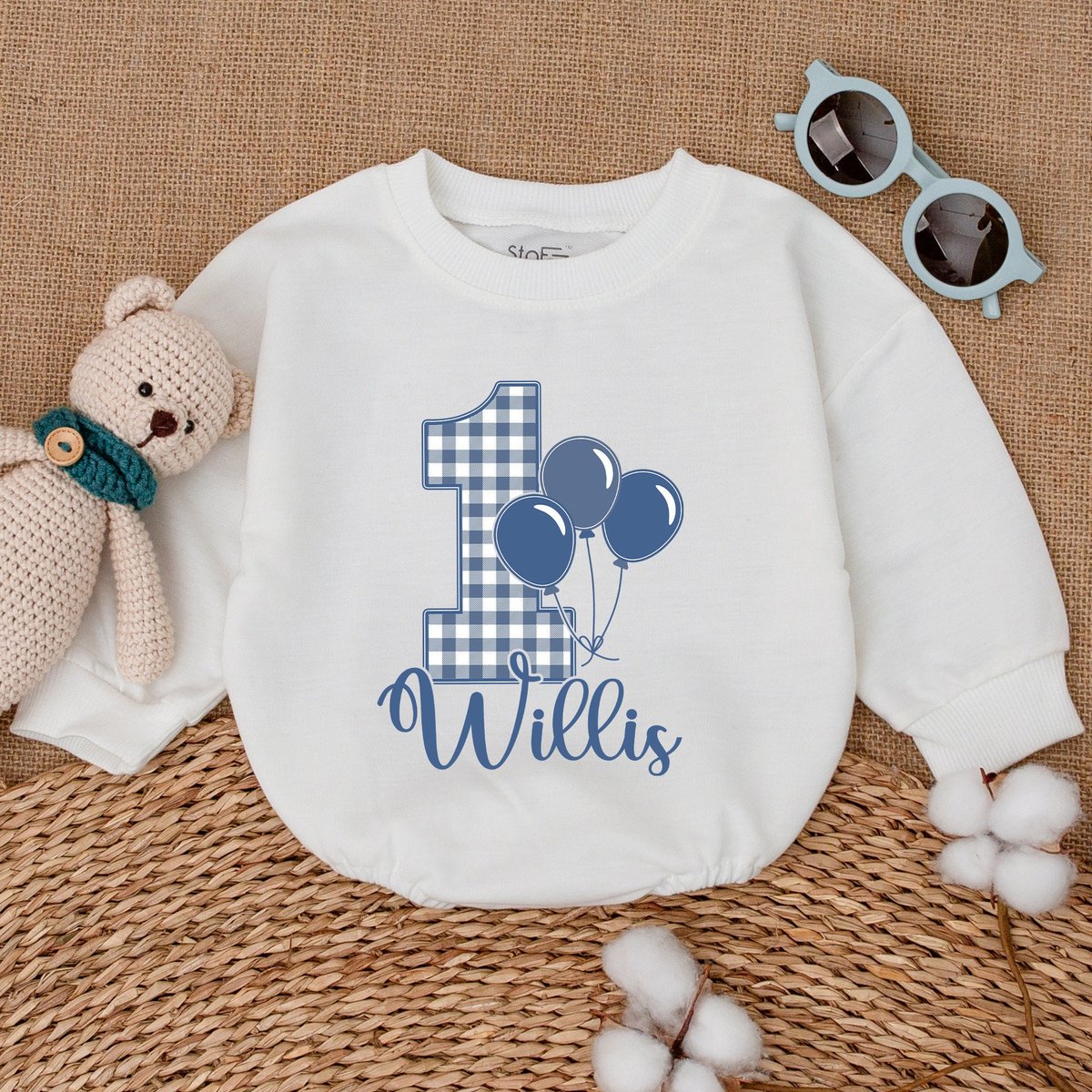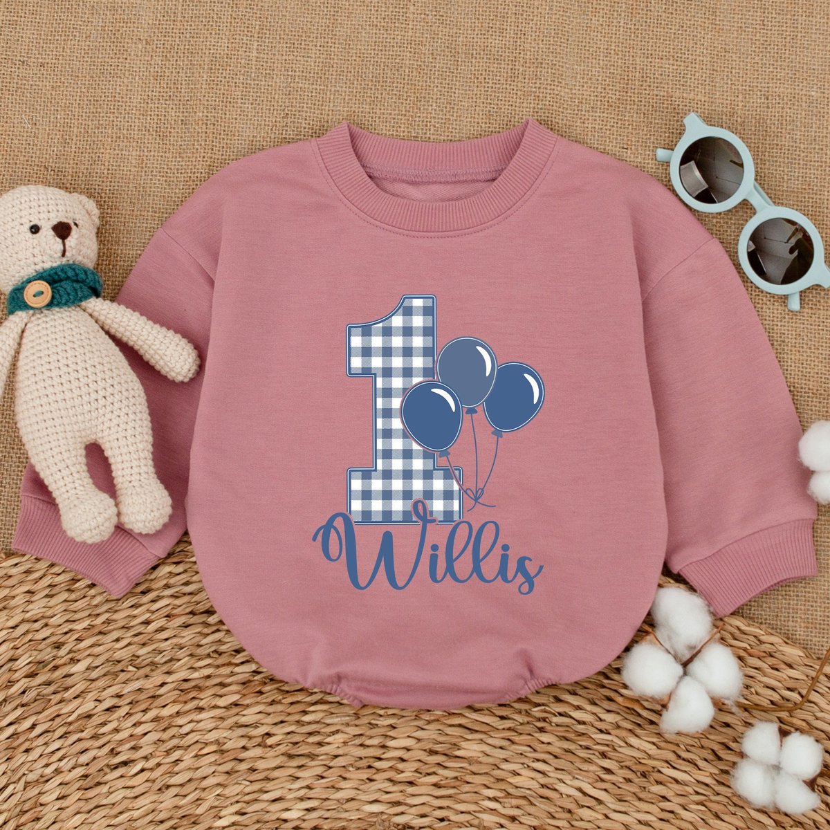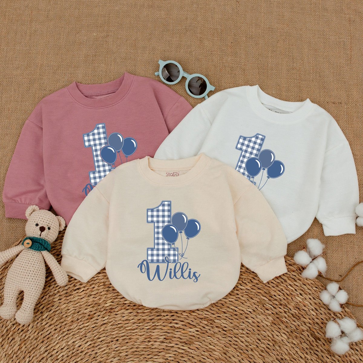 Personalized Balloon Bunch Birthday Romper Blue Gingham Balloon Birthday Bodysuit Smash Cake Outfit 168