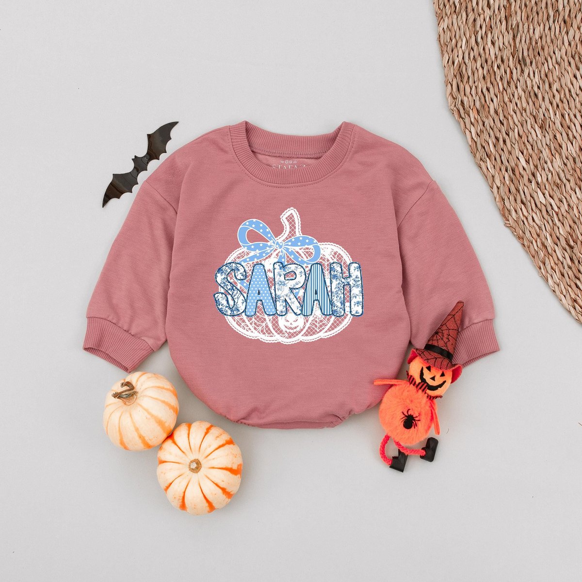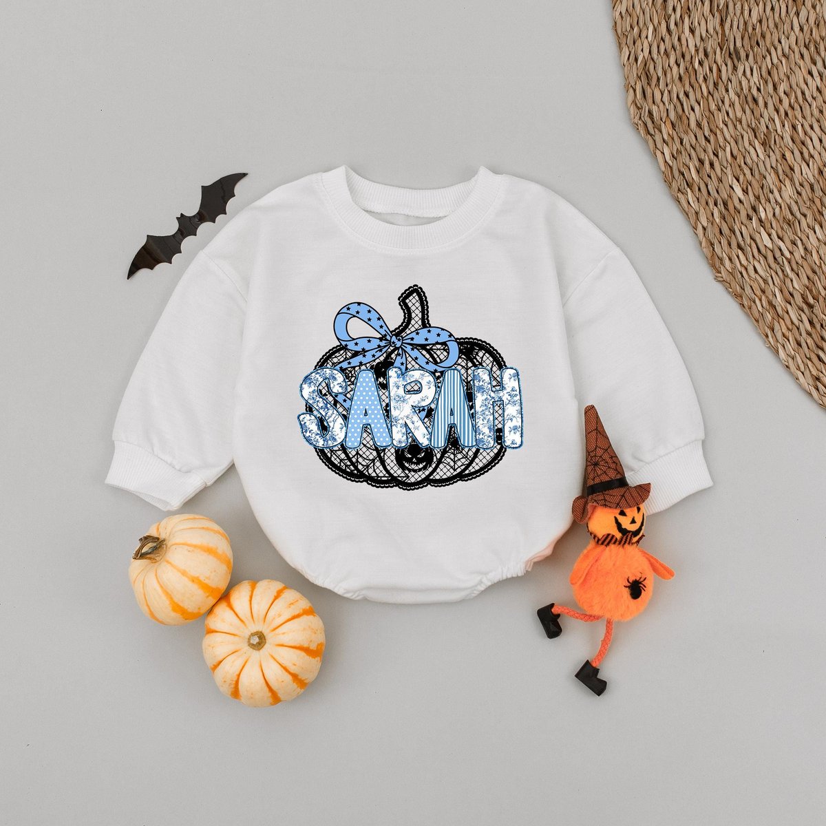 Personalized Black Lace Pumpkin Blue Bow Baby Romper Custom Newborn Halloween Bodysuit Pumpkin Seaso