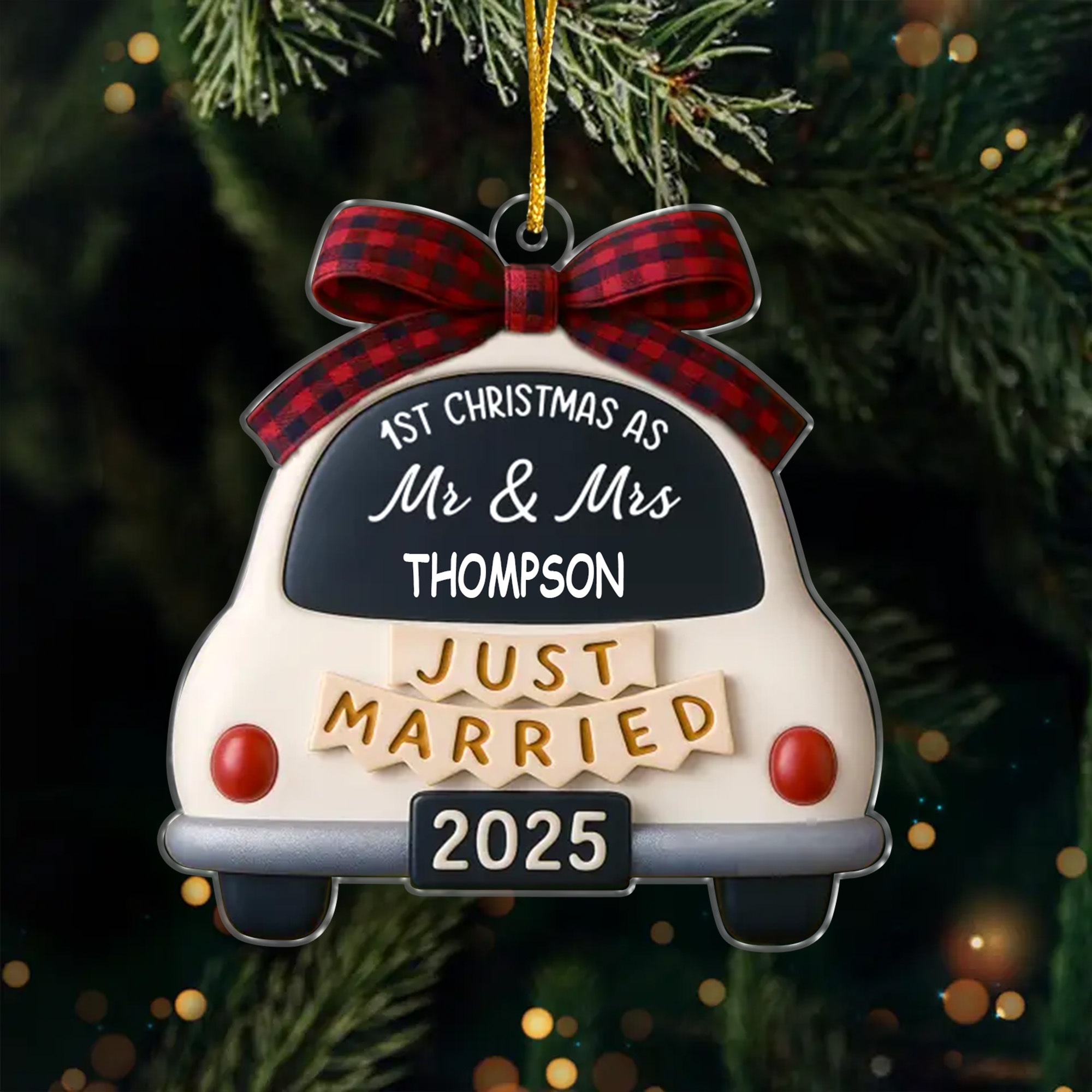 Personalized Just Married Car Ornament Acrylic with Plaid Bow First Christmas Gift for Mr Mrs 2025-ASO-OVIN0