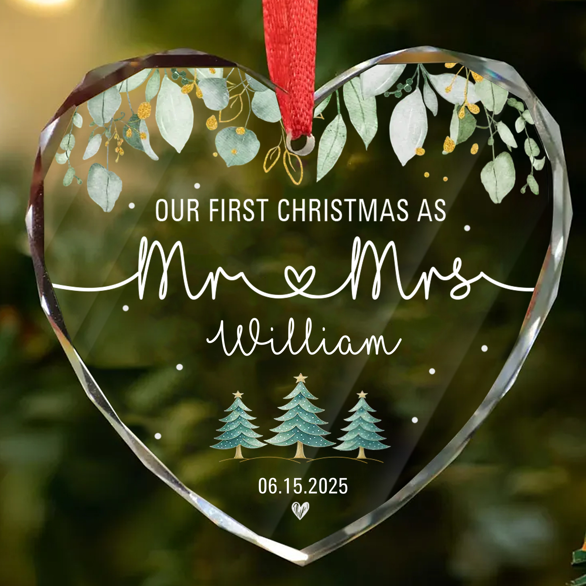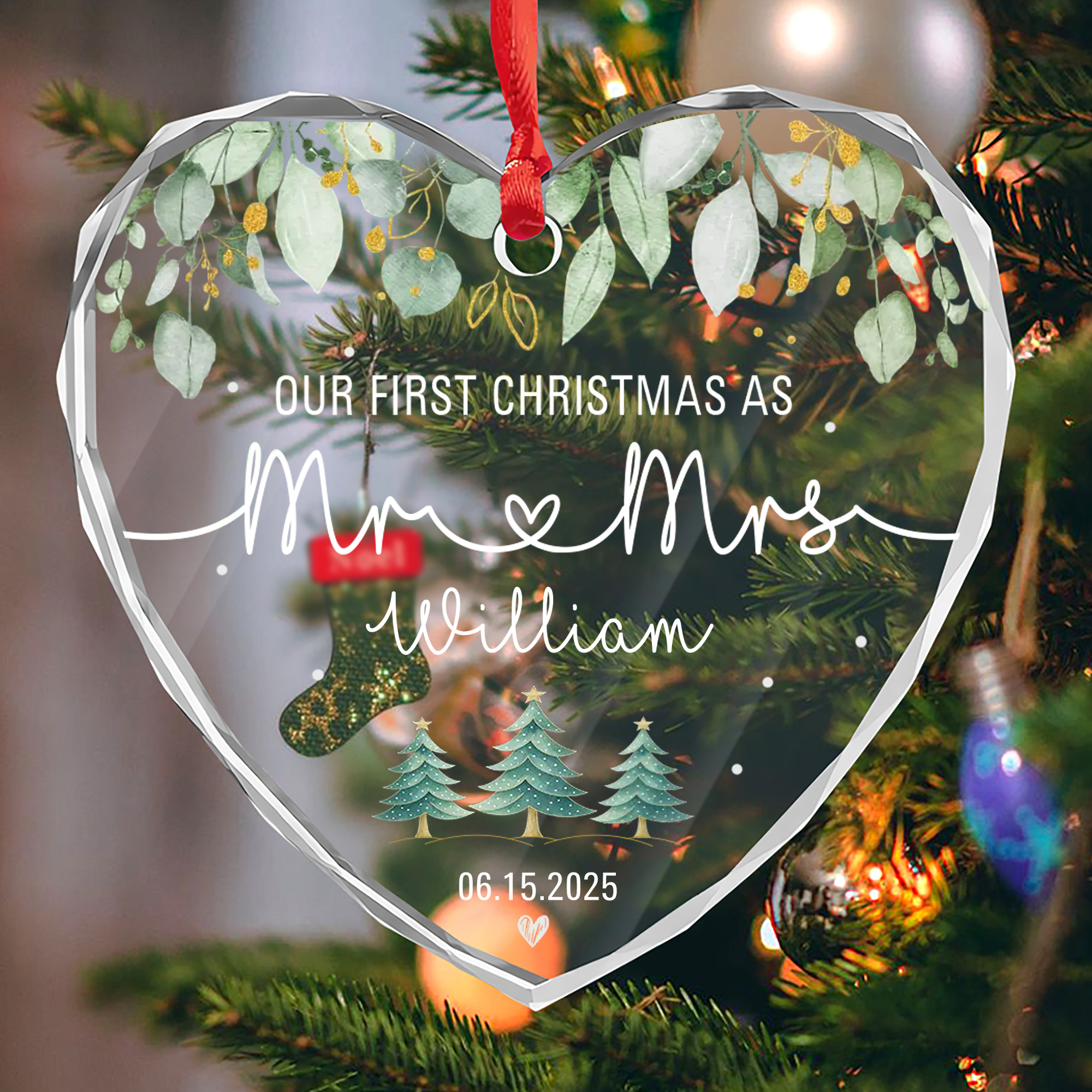 Personalized Mr & Mrs Ornament with Date – Faceted Glass Heart – Our First Christmas Gift for Couples 2025-HGLO-419AP