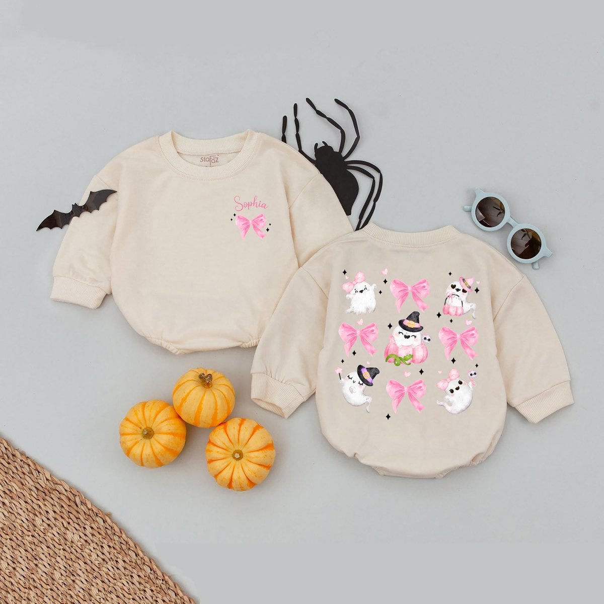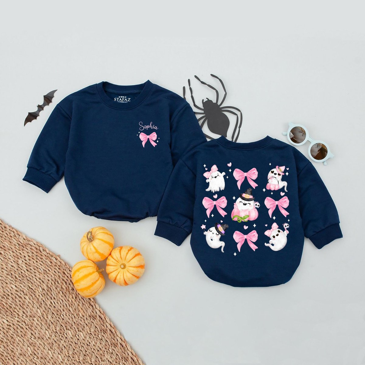 Personalized Name Bow Halloween Kids Bubble Romper Ghost With Pink Bow Baby Romper Spooky Girly Hall