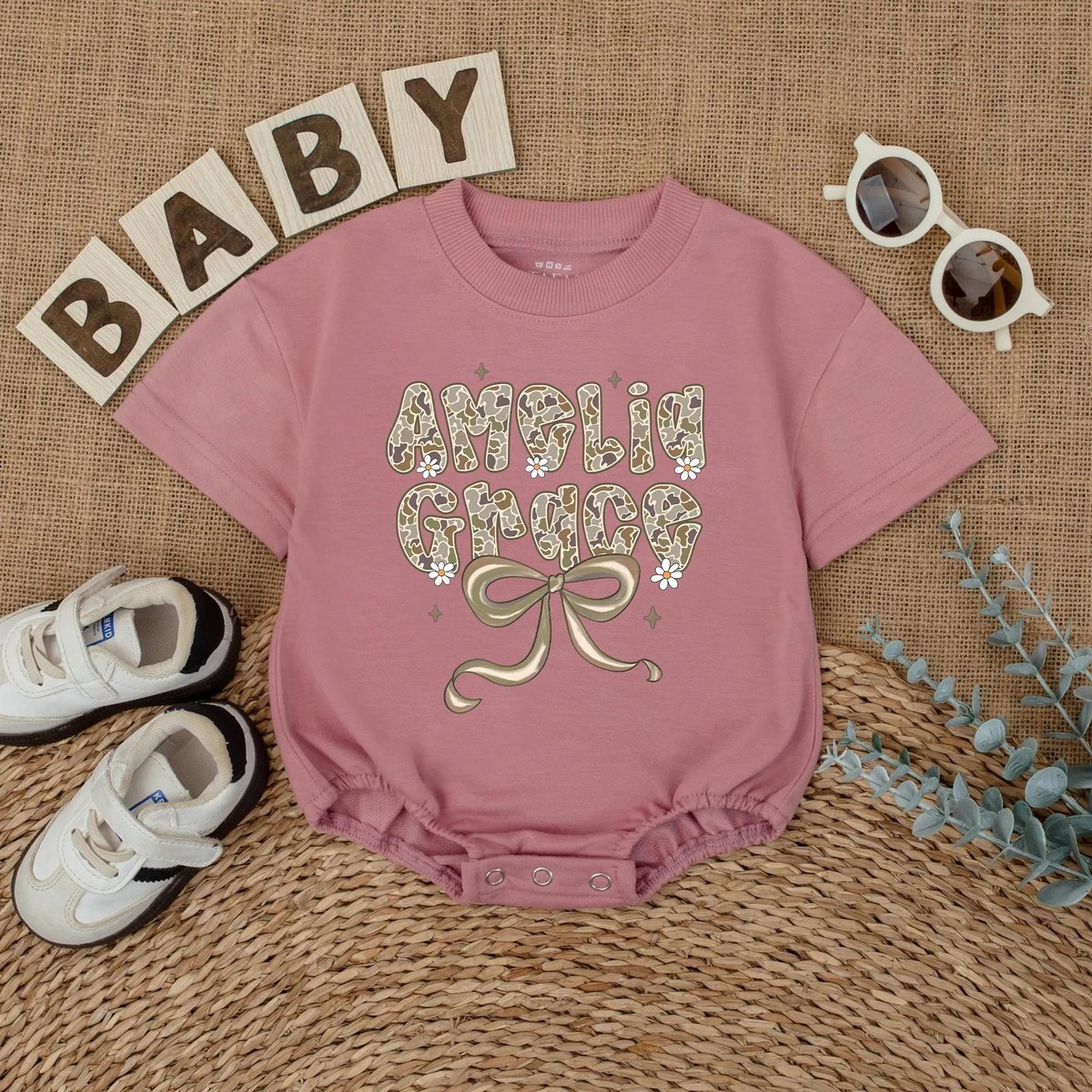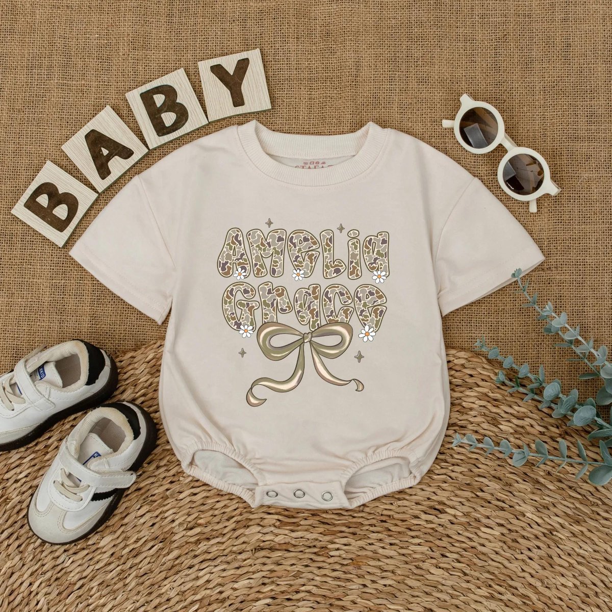 Personalized Name Camo Bow Bubble Romper for Baby Girls Custom Hunting Baby Outfit Newborn Coming Ho 436