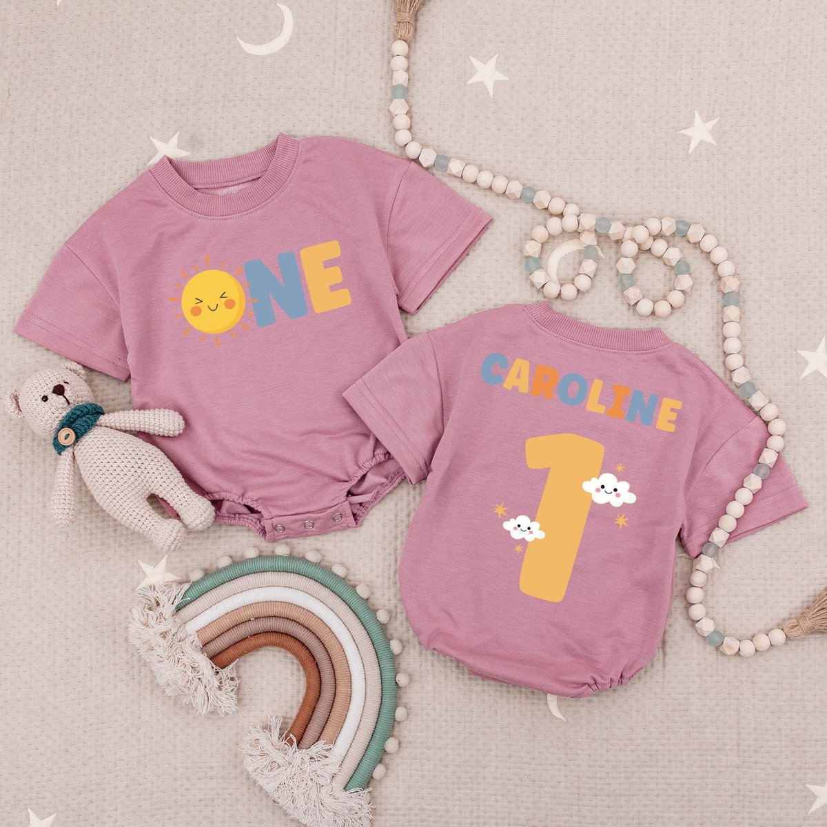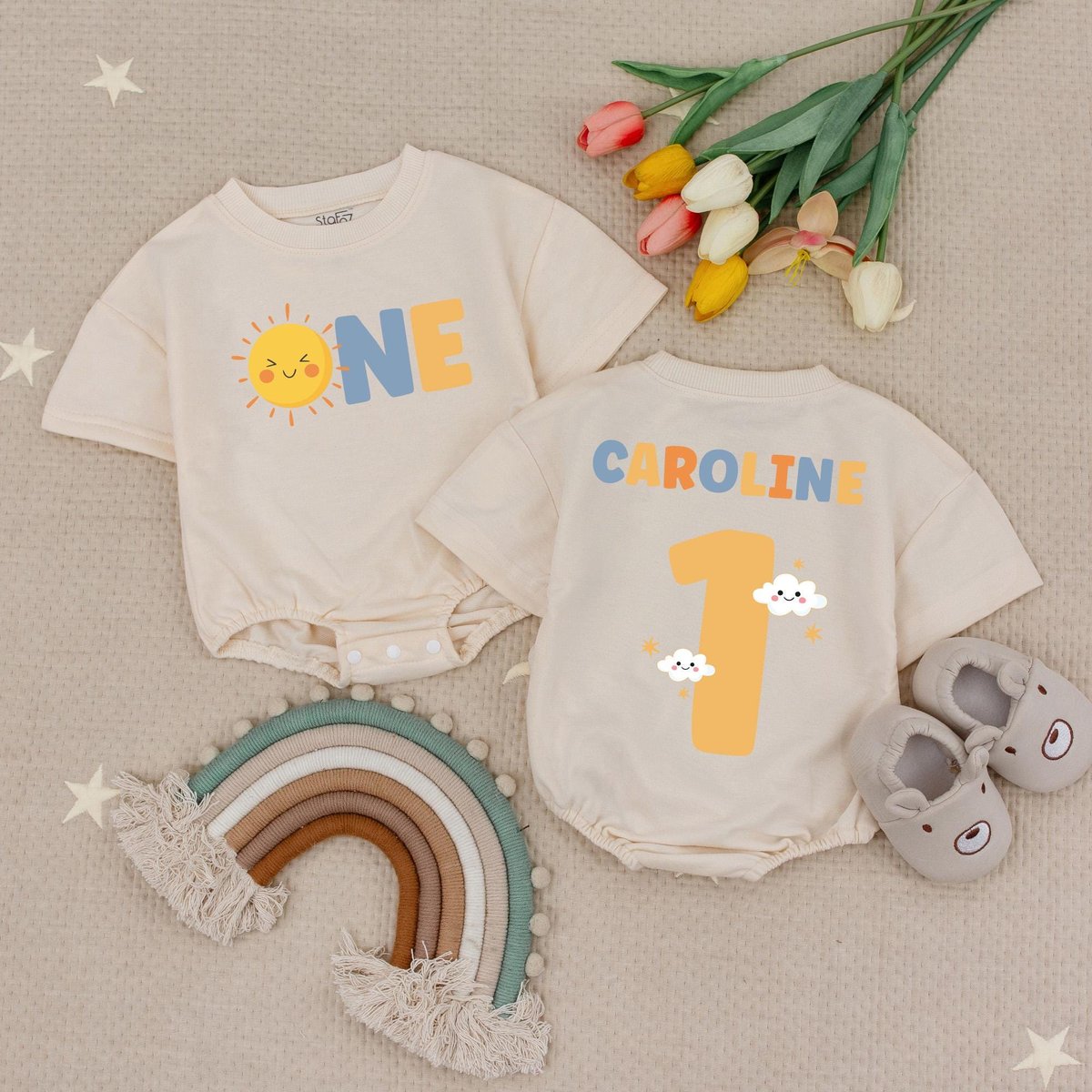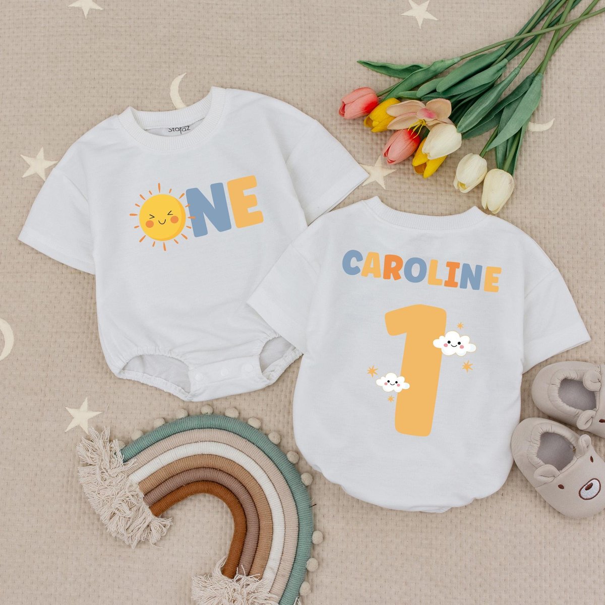Personalized Name First Birthday Sun Baby Romper Sunshine Birthday Bodysuit Boho Sun 1st Birthday Ba