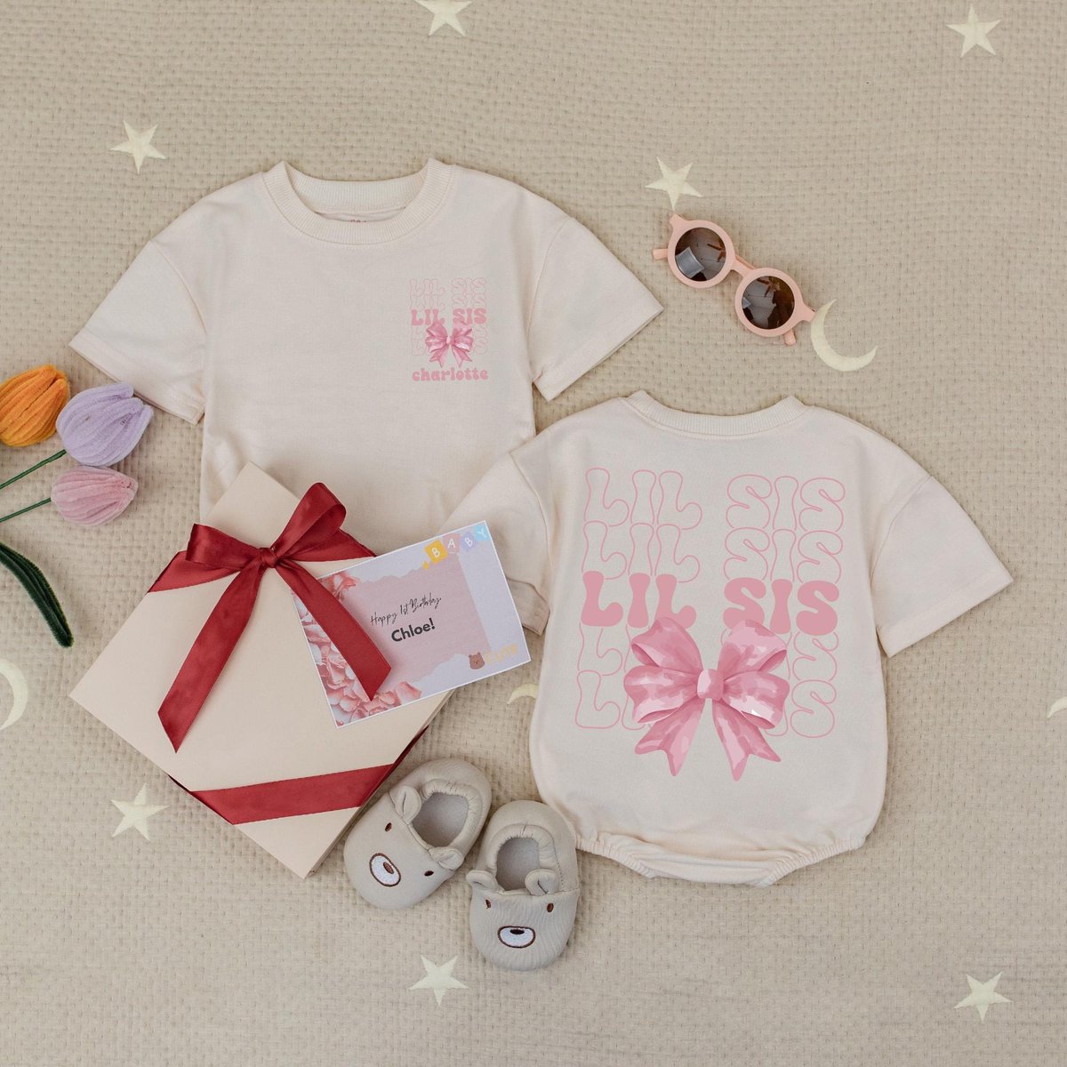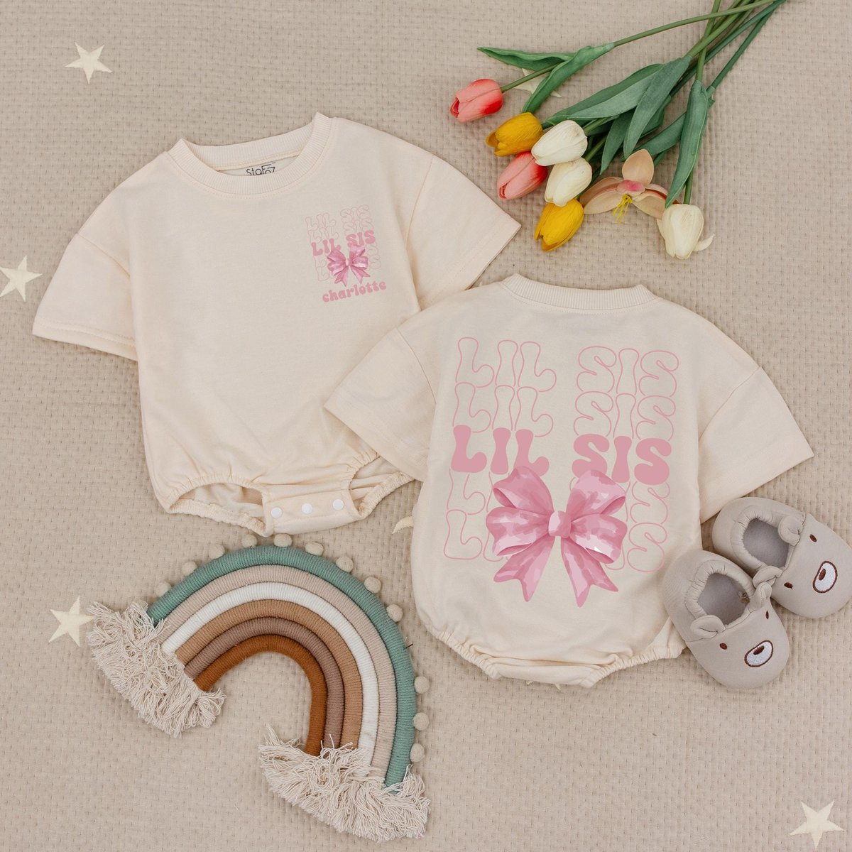 Personalized Name Little Sister Bubble Romper Lil Sis Pink Bow Baby Romper Custom Name Little Sis Ba