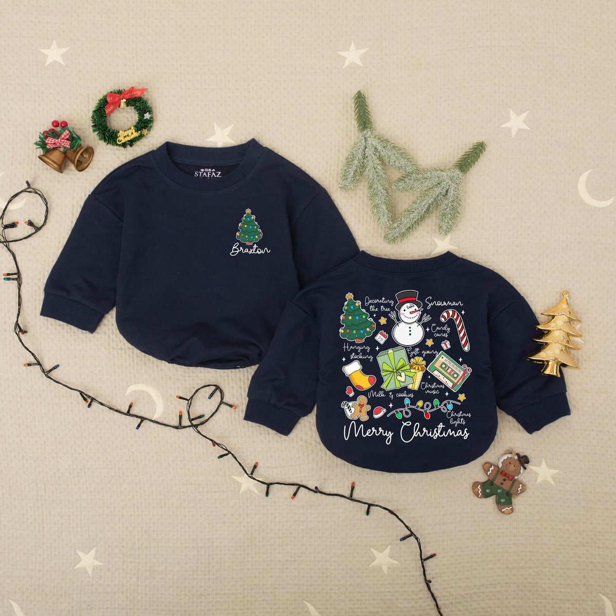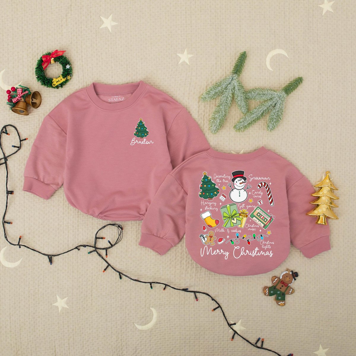 Personalized Name Merry Christmas Bubble Romper Cute Holiday Bodysuit Baby Shower Gift First Christm