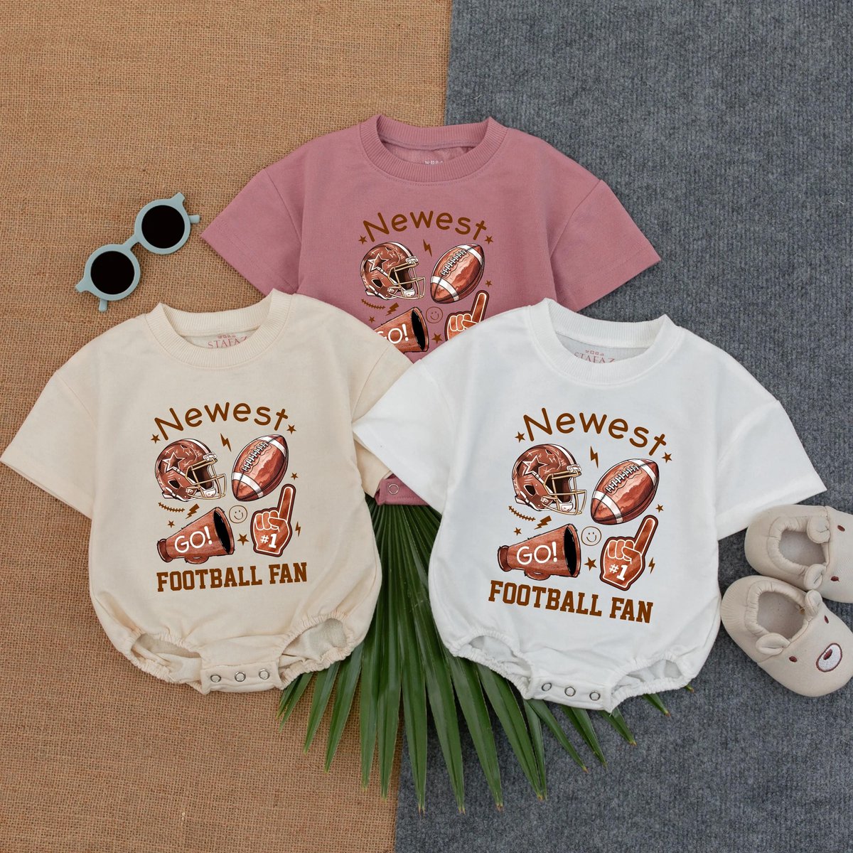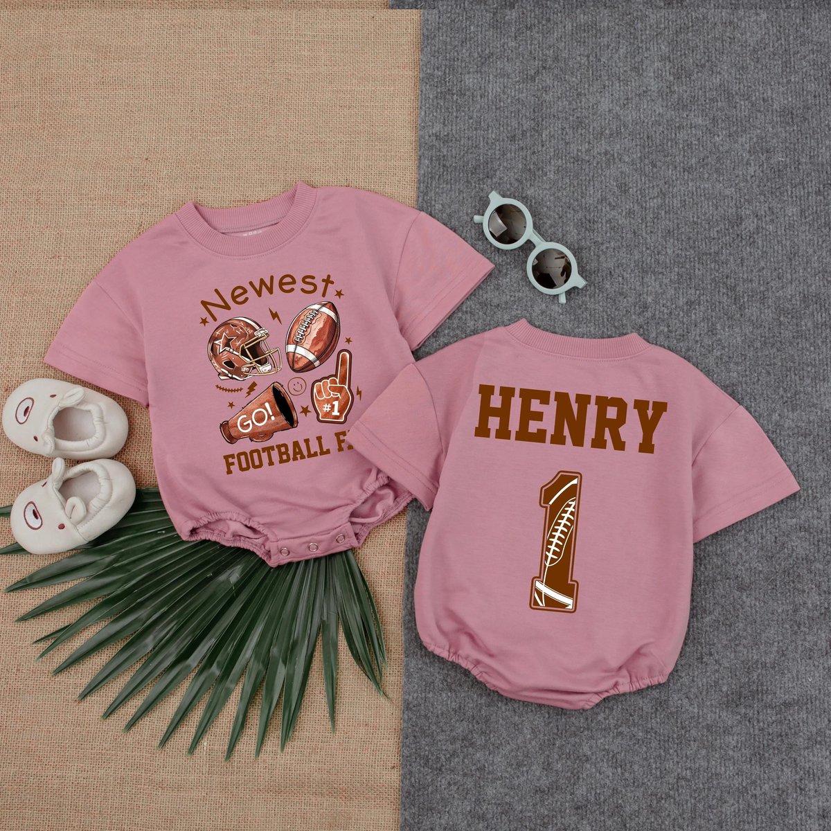 Personalized Newest Football Fan Baby Romper Custom Name and Number Game Day Baby Bodysuit First Bir 434