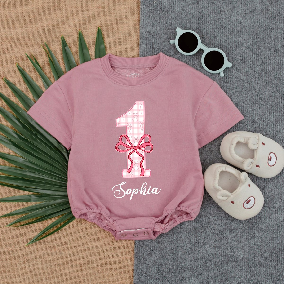 Personalized Pink Bow Checker First Birthday Romper Summer Short Sleeve Bubble Romper Cute Baby Girl 431
