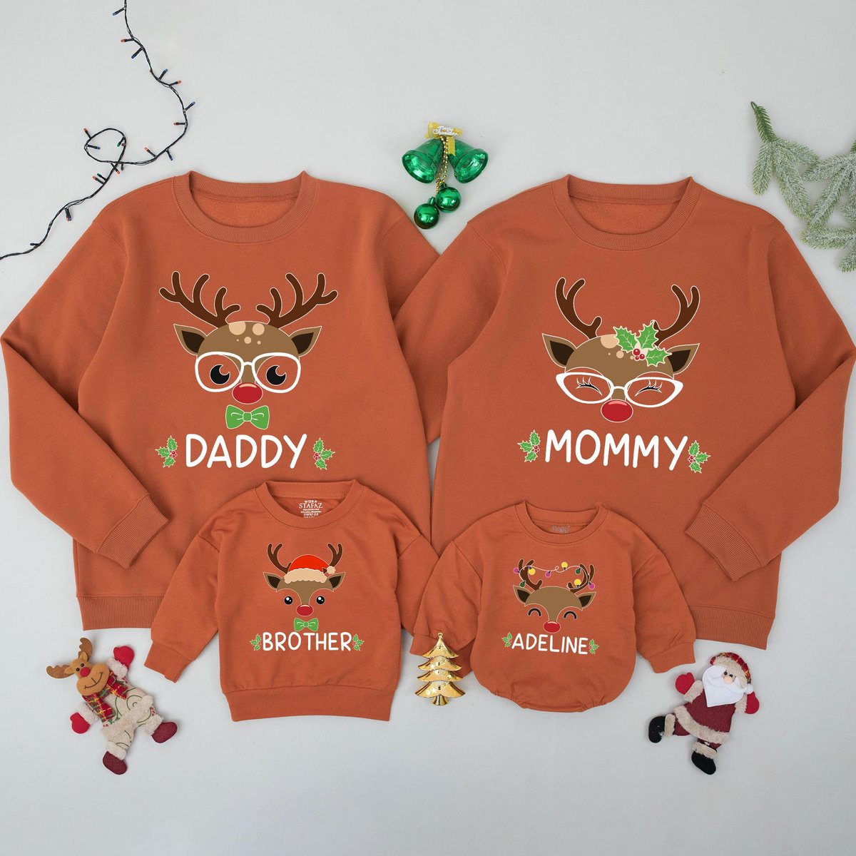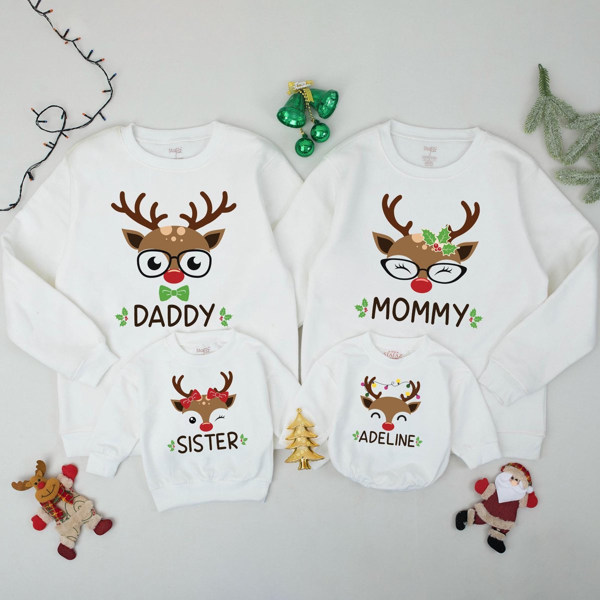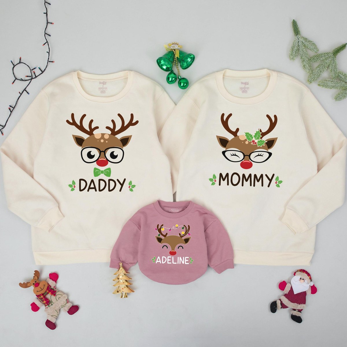 Personalized Reindeer Family Christmas Sweatshirts Matching Xmas Sweaters Custom Family Name Outfits 437