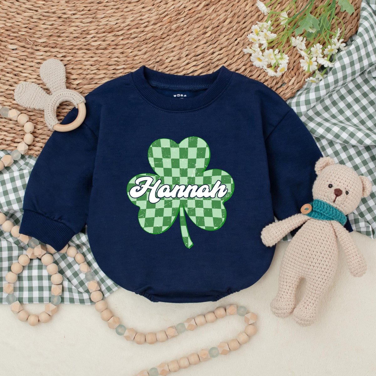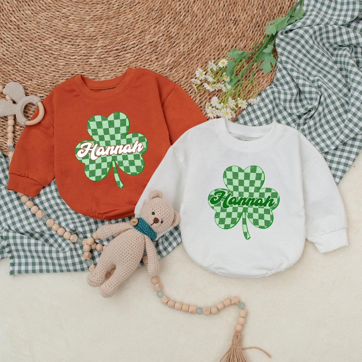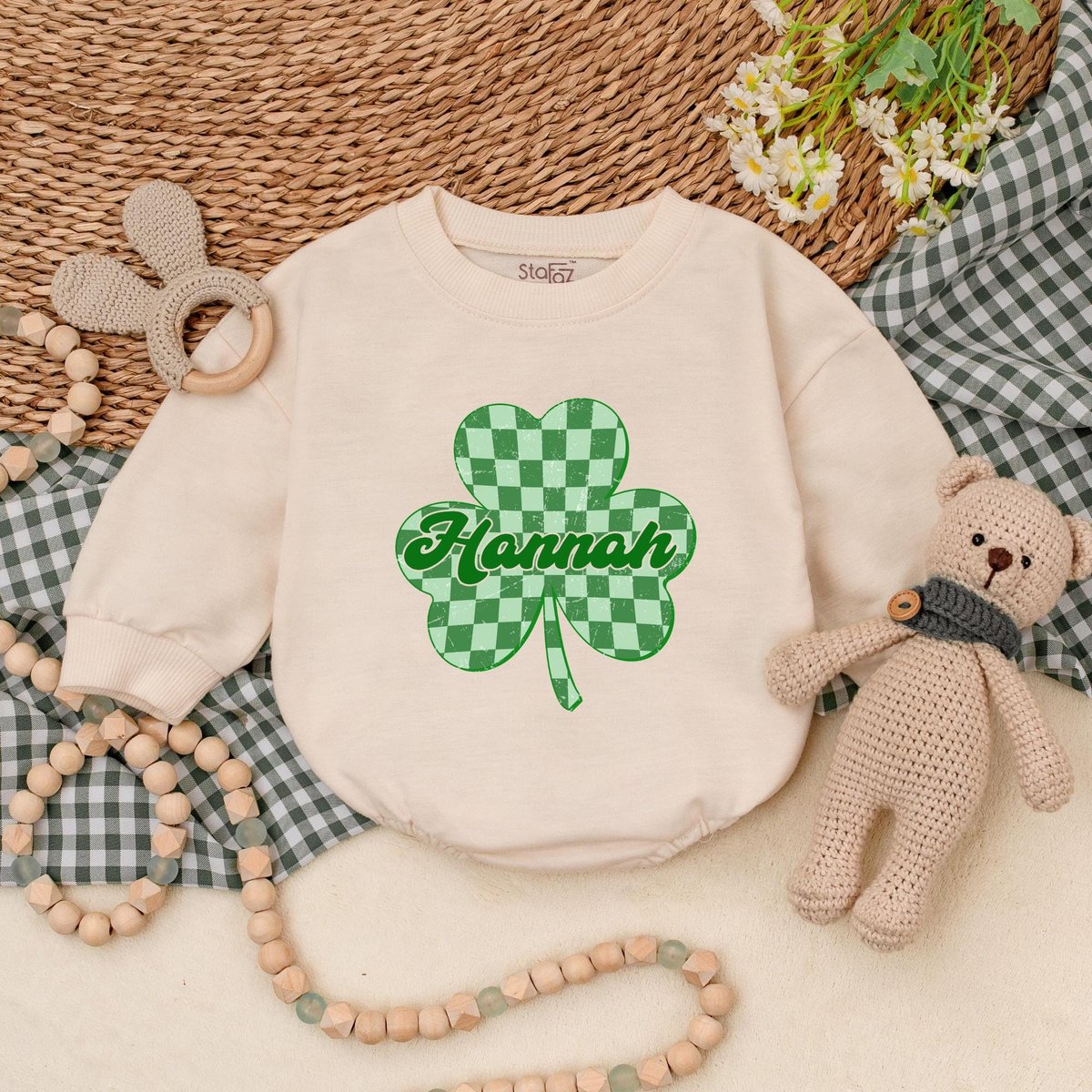 Personalized Retro Checkered Green Clover Baby Romper Custom St Patrick’s Day Bodysuit Baby Patrick 186