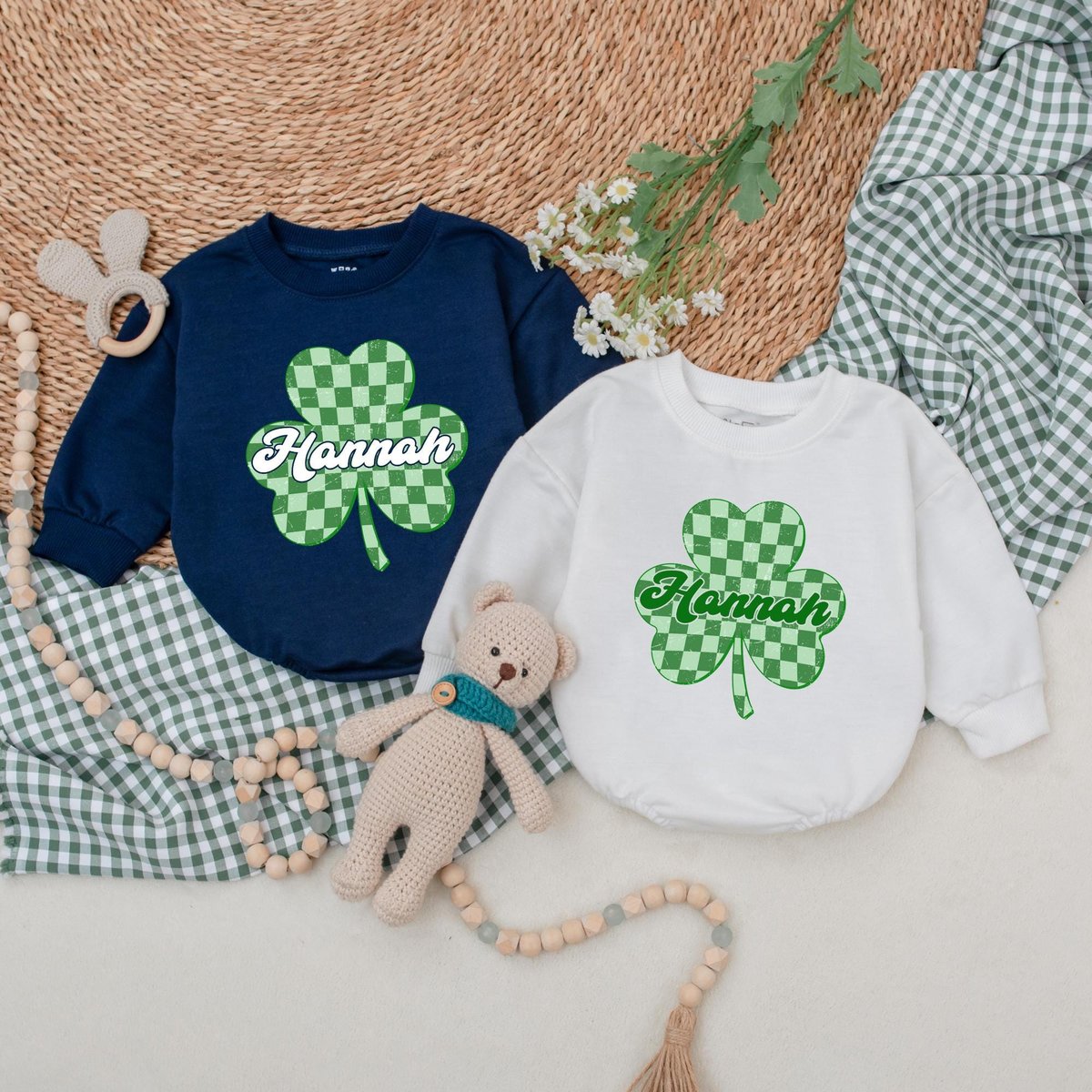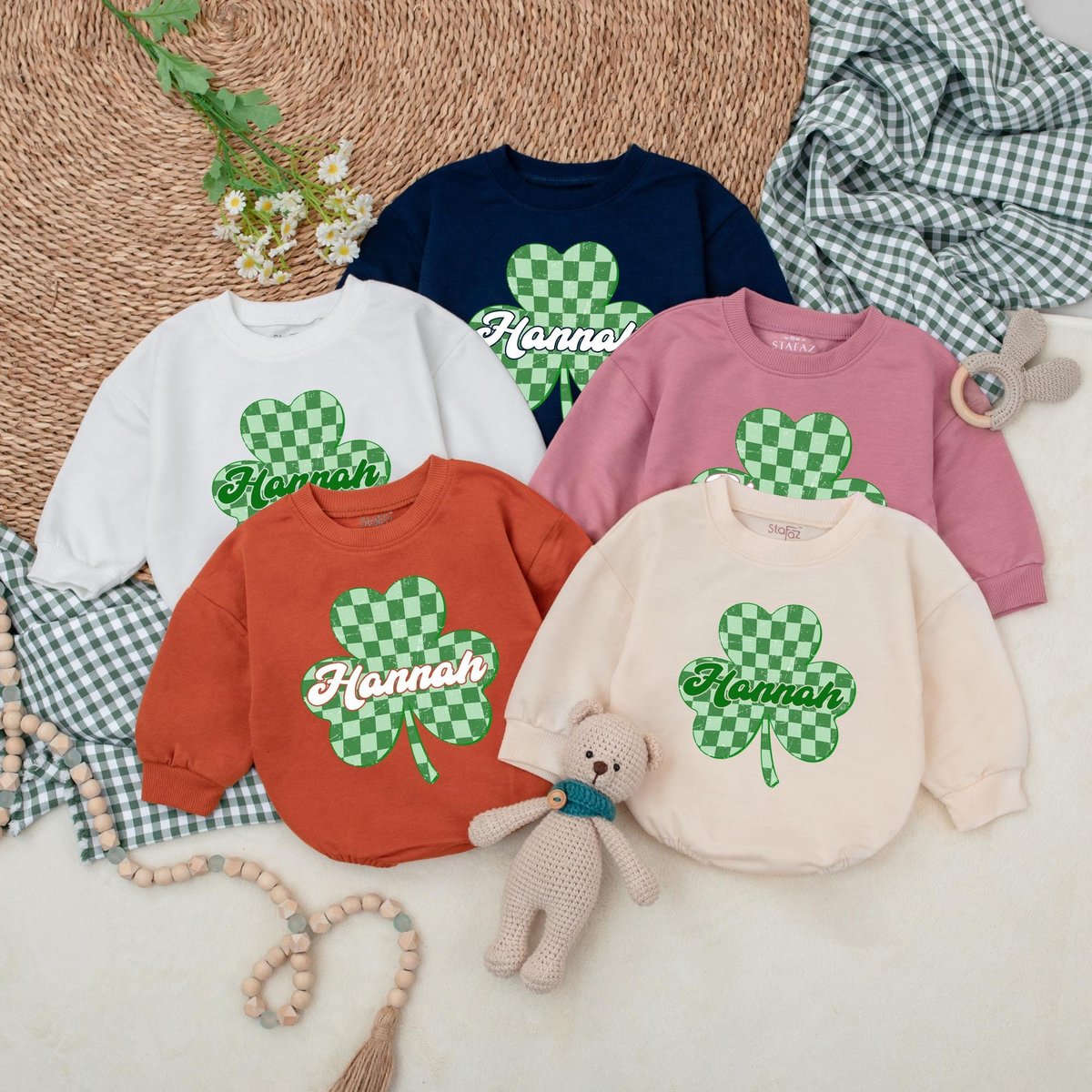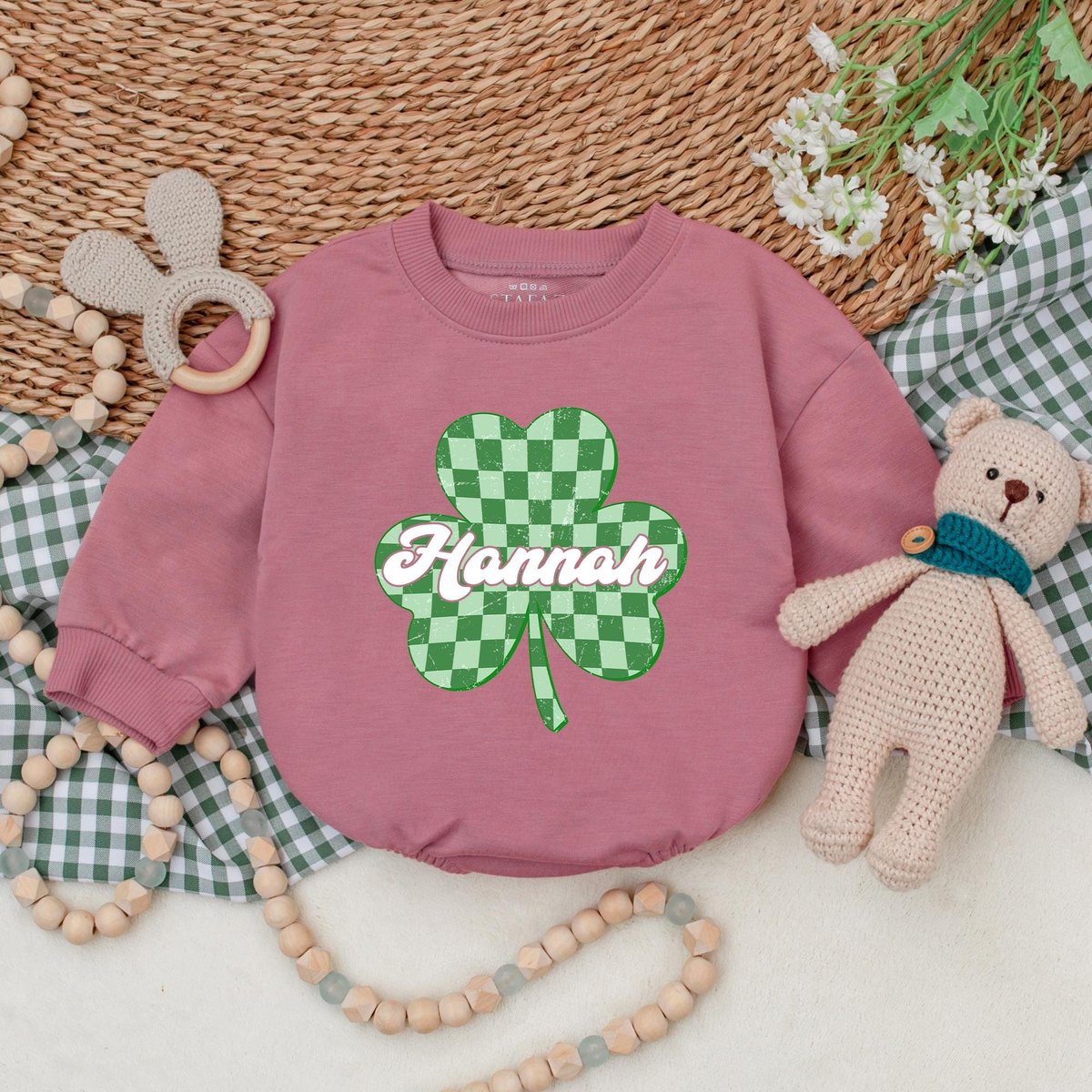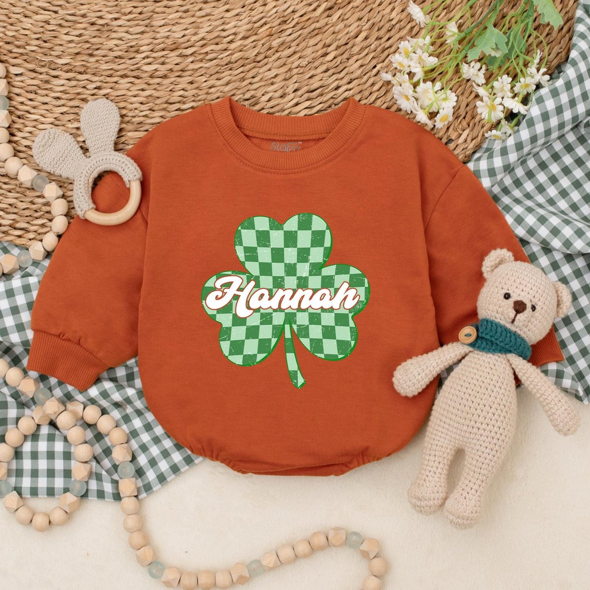 Personalized Retro Checkered Green Clover Baby Romper Custom St Patrick’s Day Bodysuit Baby Patrick 186