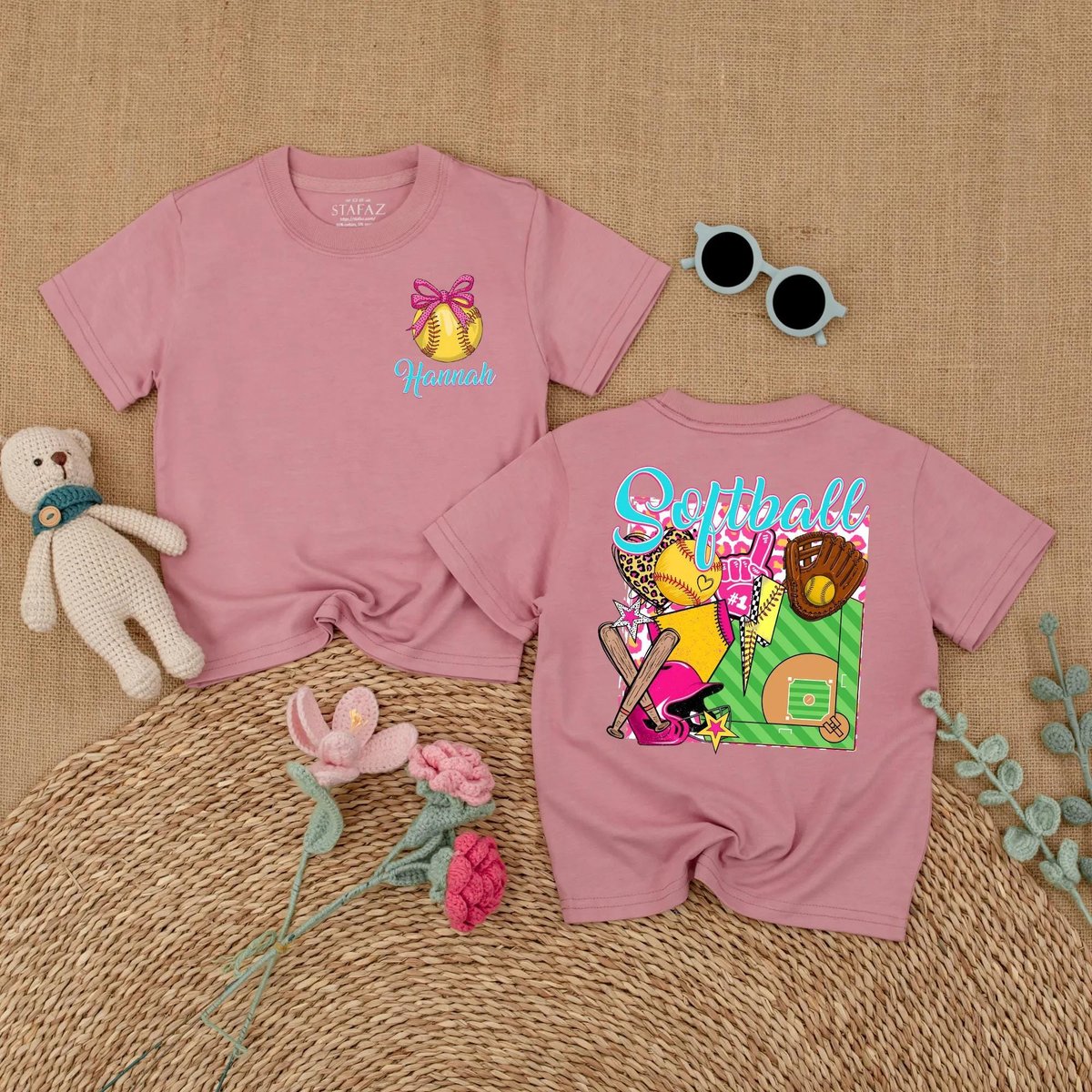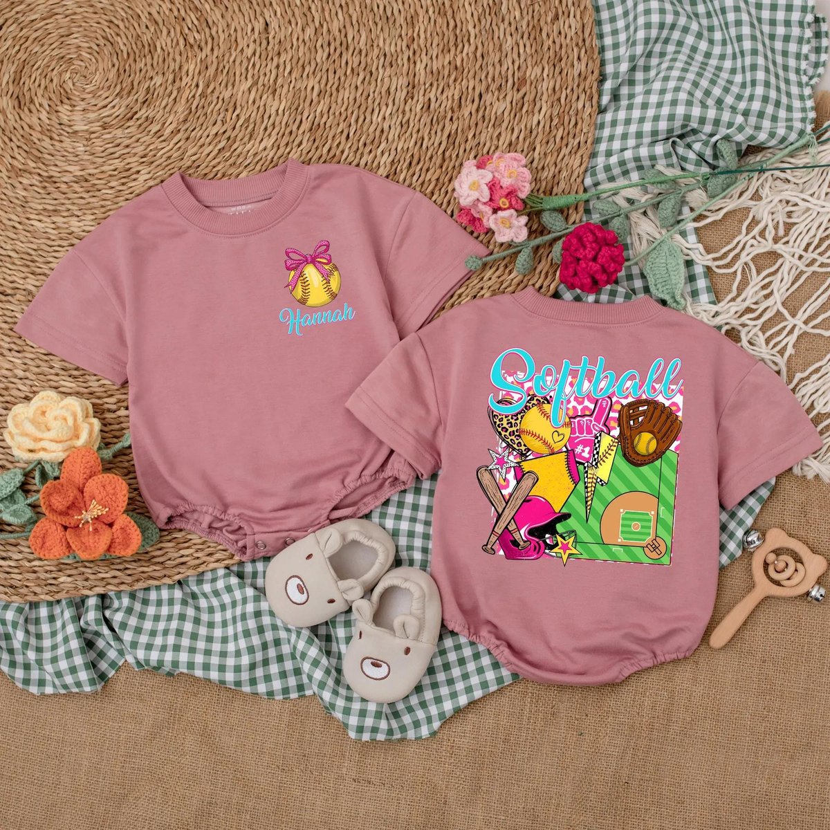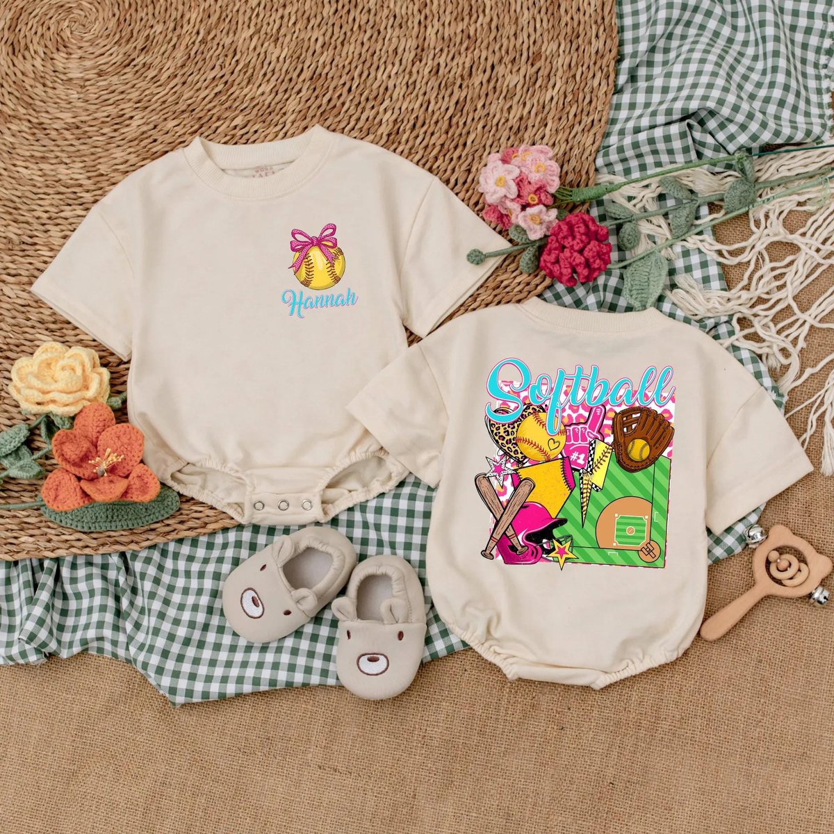 Personalized Softball Baby Girl Bubble Romper Softball Pink Bow Baby Bodysuit Game Day Outfit for Gi 189