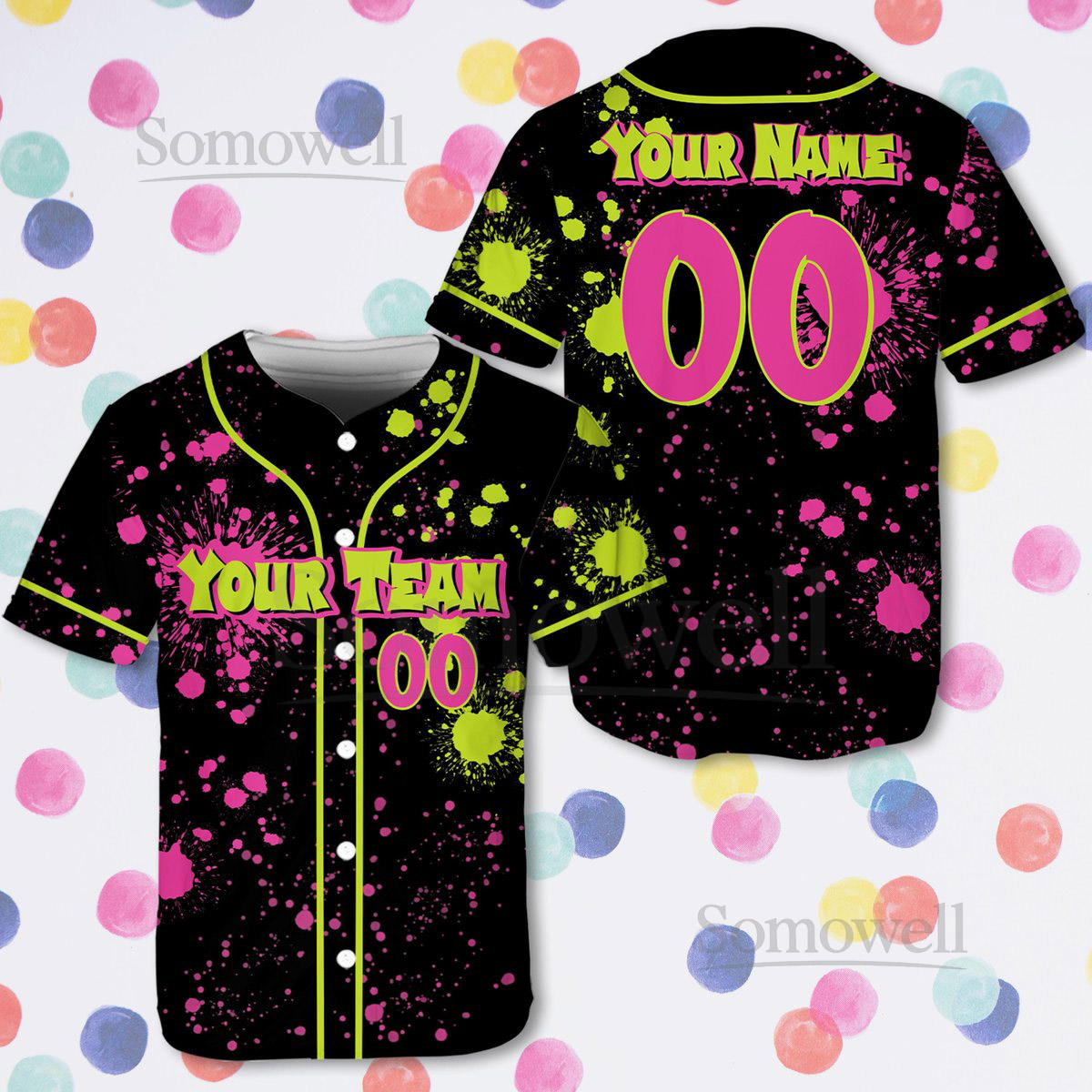 Personalized Team Name Number Baseball Jersey Adult Kid Youth Custom Neon Splatter Jersey Pink Black Paint Splatter Shirt Sport Uniform_704