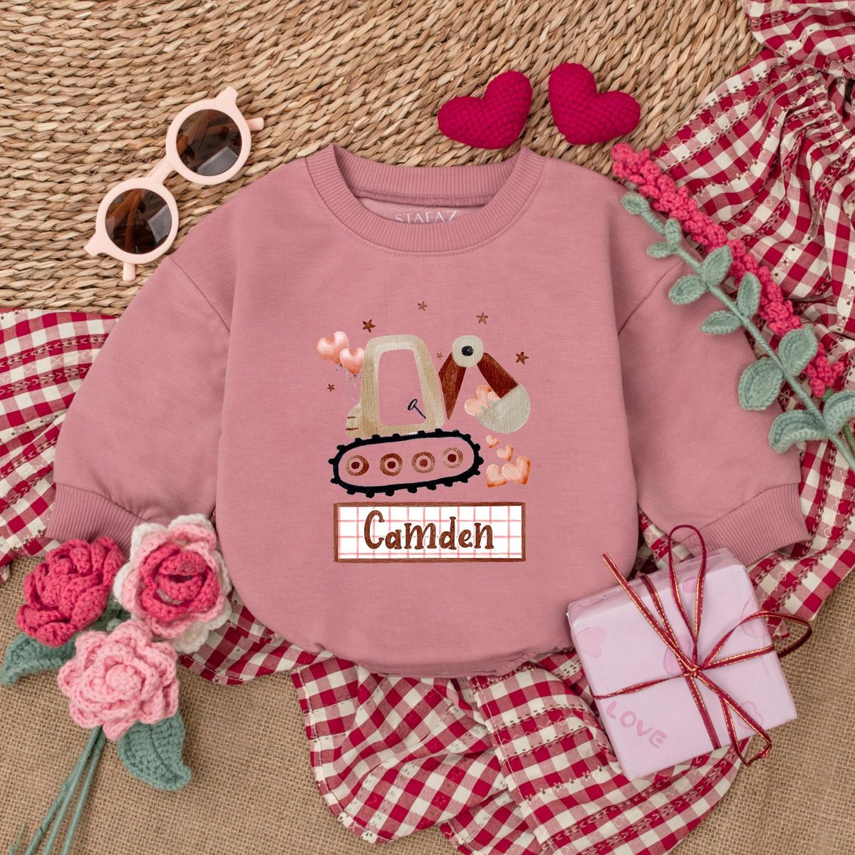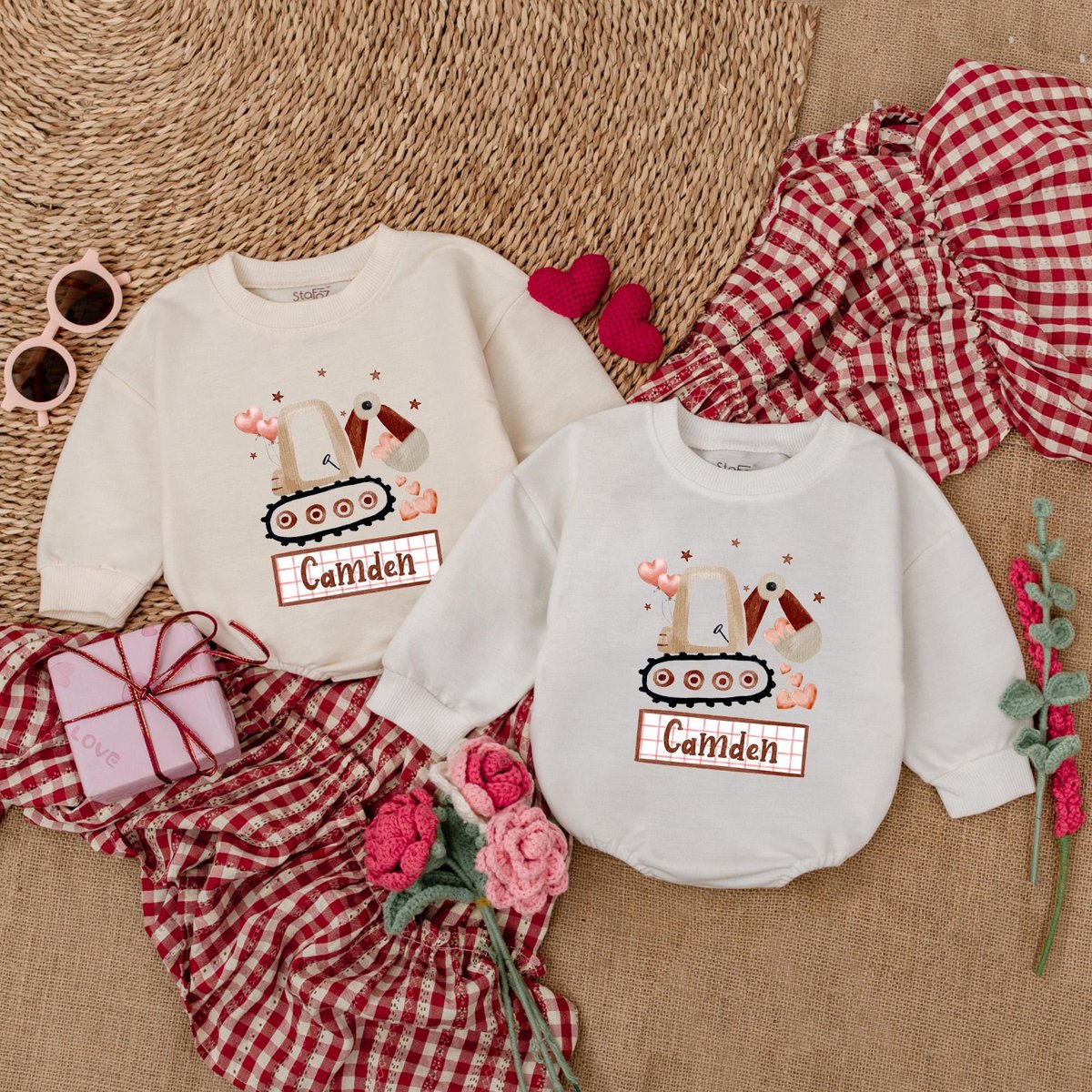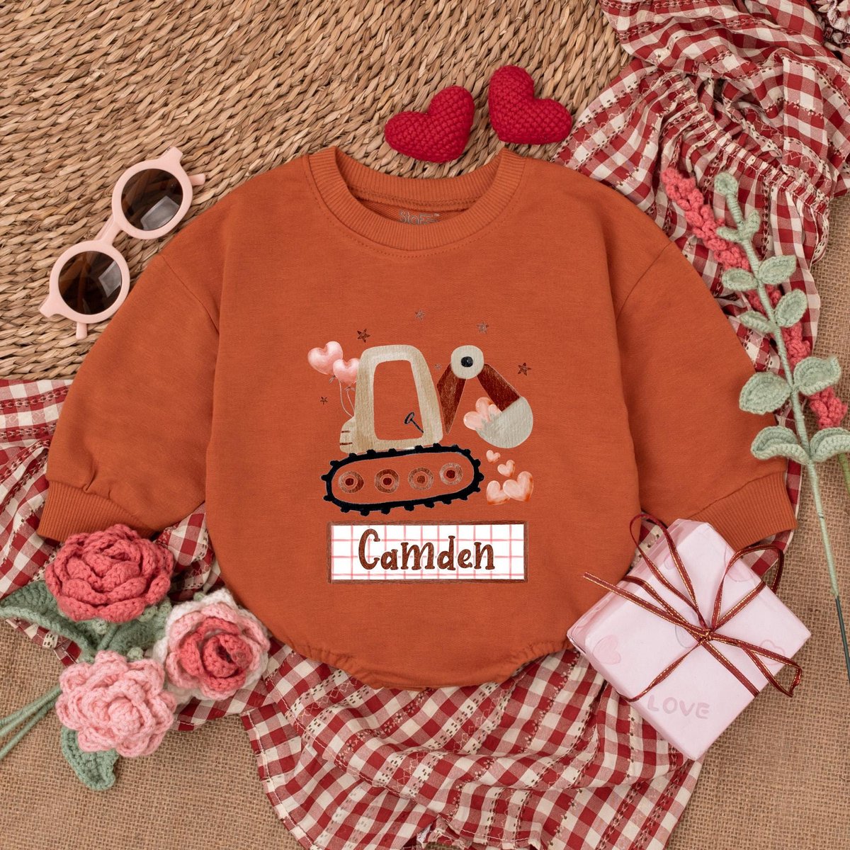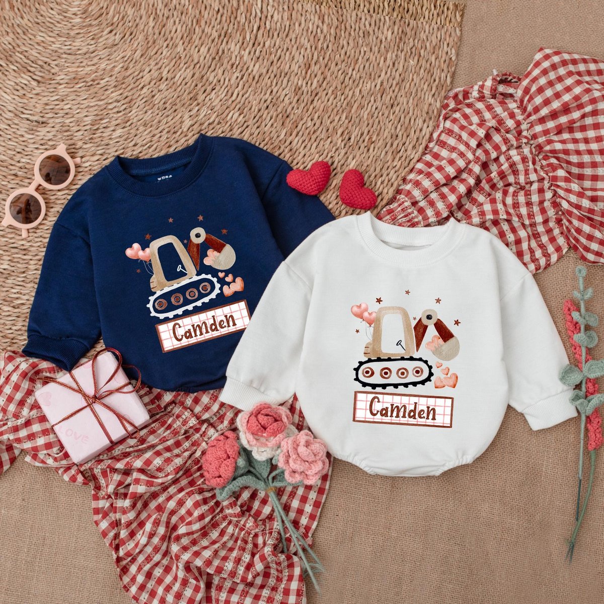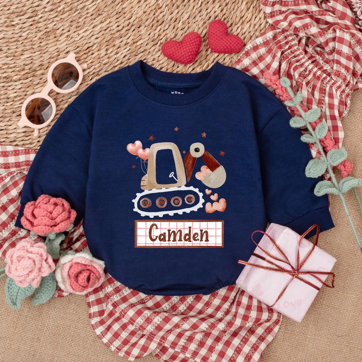 Personalized Valentine Excavator Baby Romper Baby Boy Valentine Bodysuit Custom Name Valentine’s Da 182
