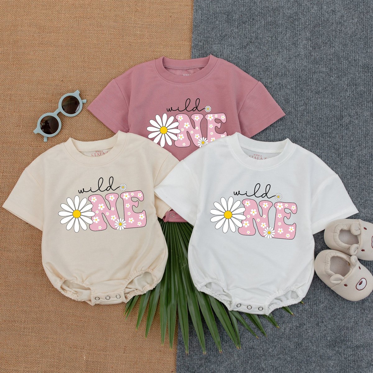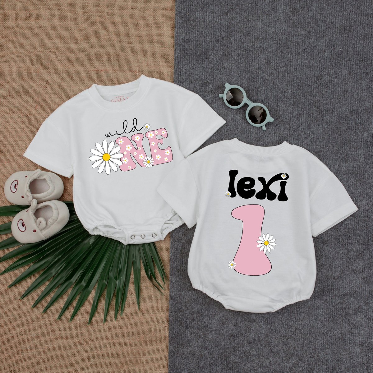 Personalized Wild One Daisy Short Sleeve Romper First Birthday Outfit Pink Theme Birthday Shirt Bu 177