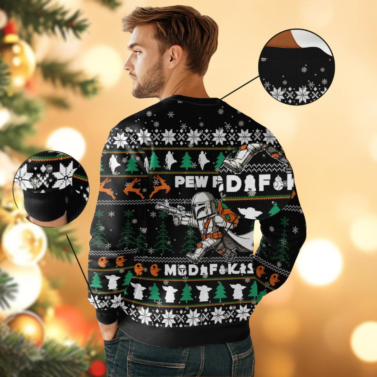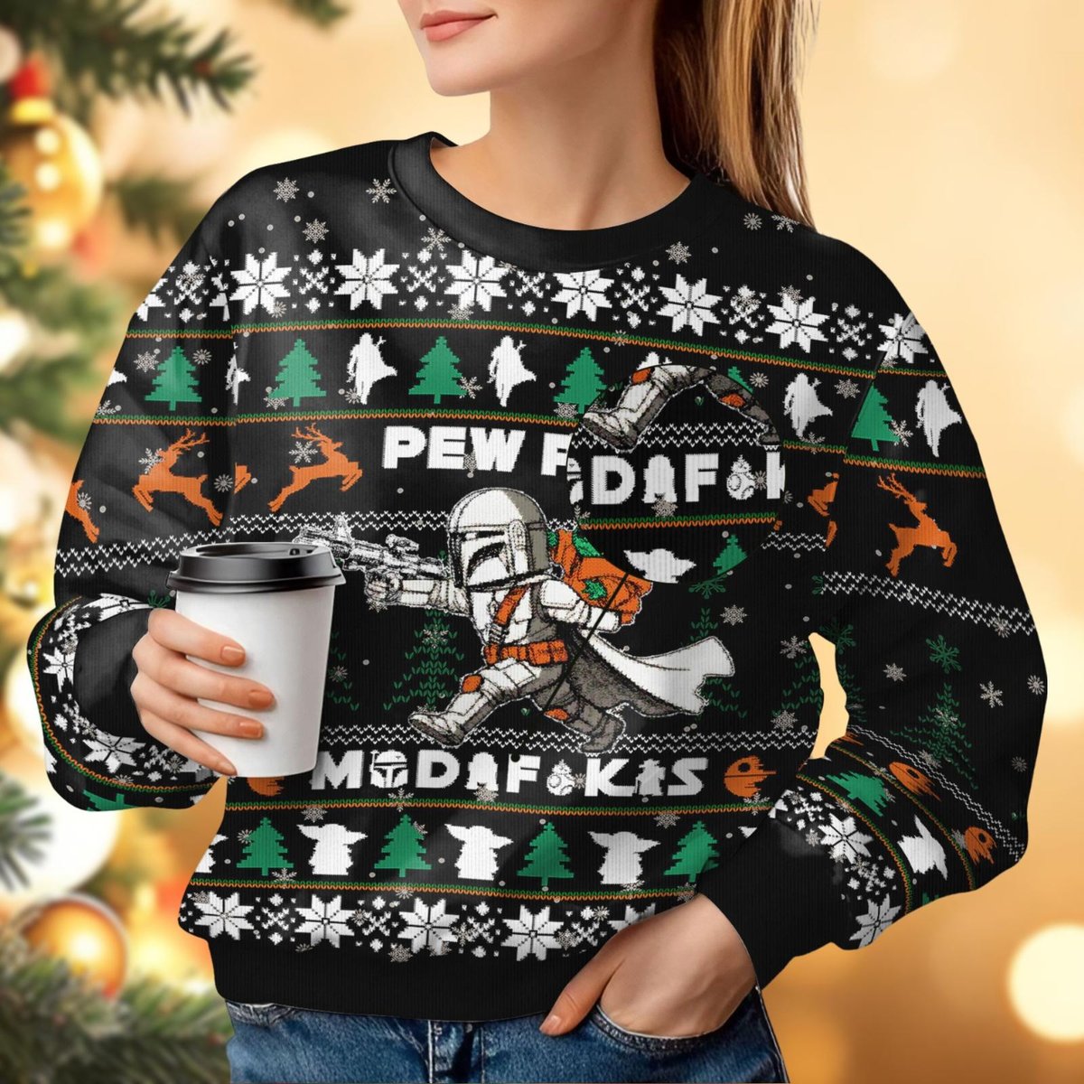 Pew Pew Mandalorian & Grogu Ugly Christmas Sweater, Funny Sci-Fi Holiday Knit