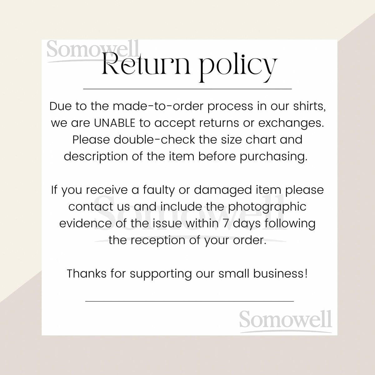 Don’t worry—our packages don’t include return label. Just reach out to support@somowell.com, and we’ll help you place your return or exchange.
