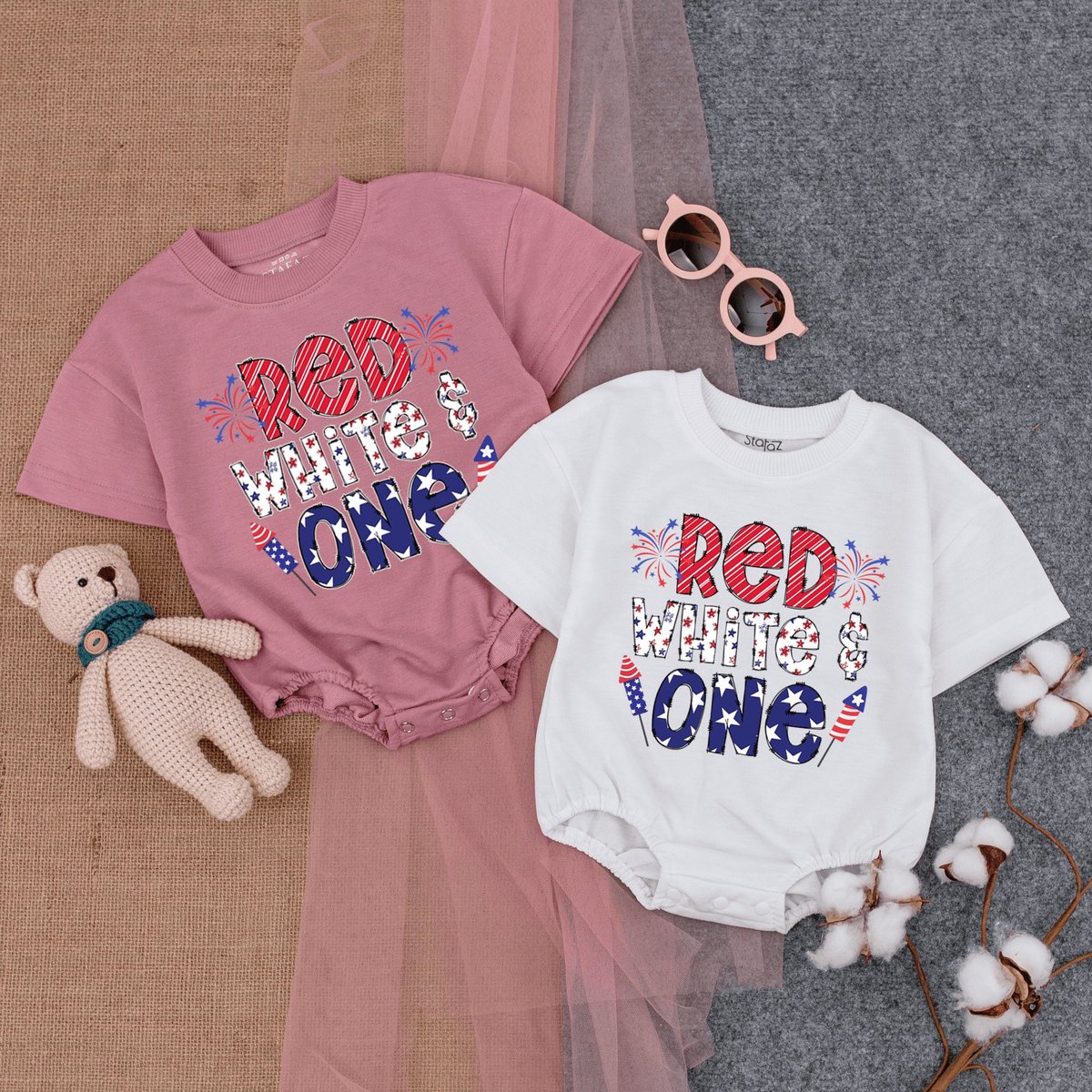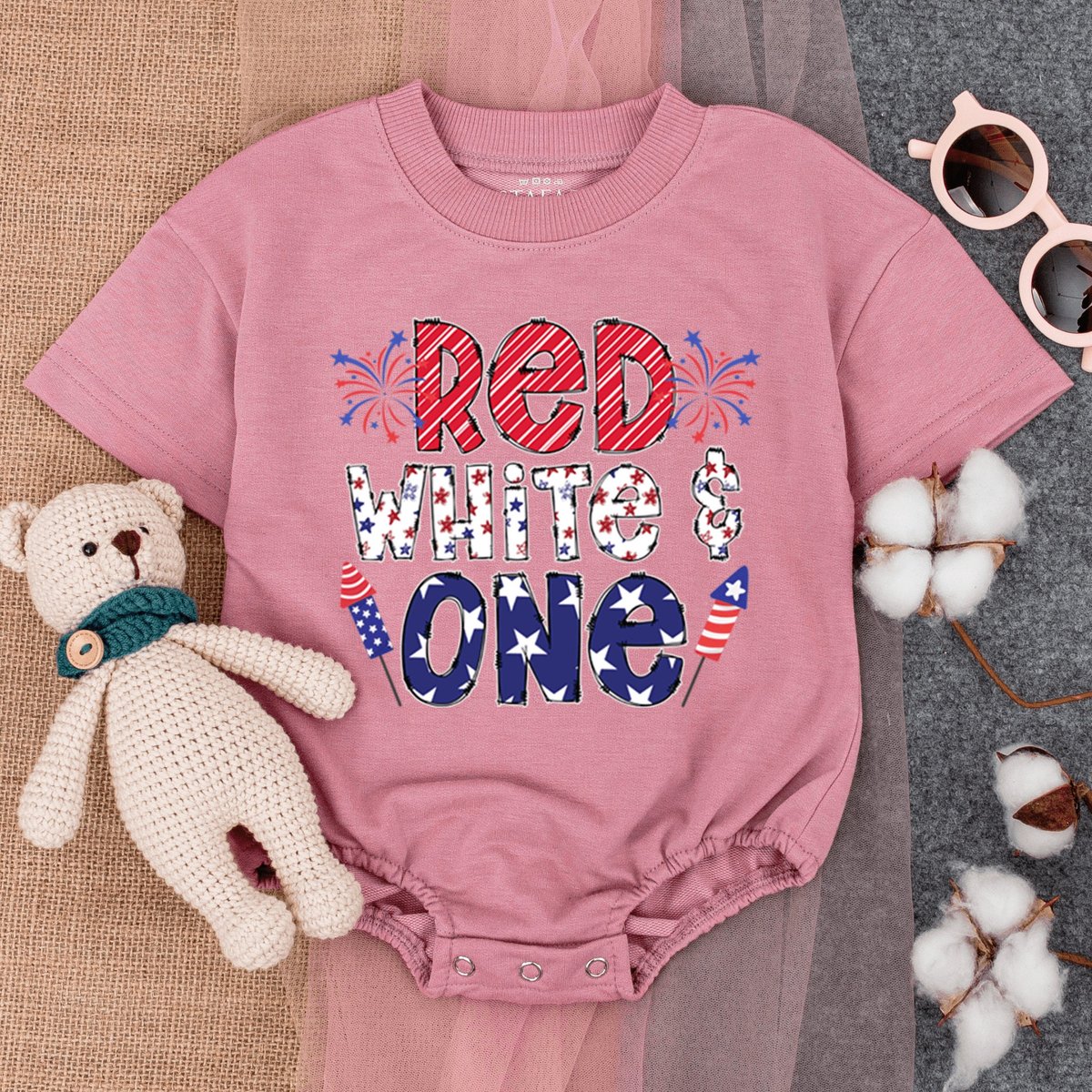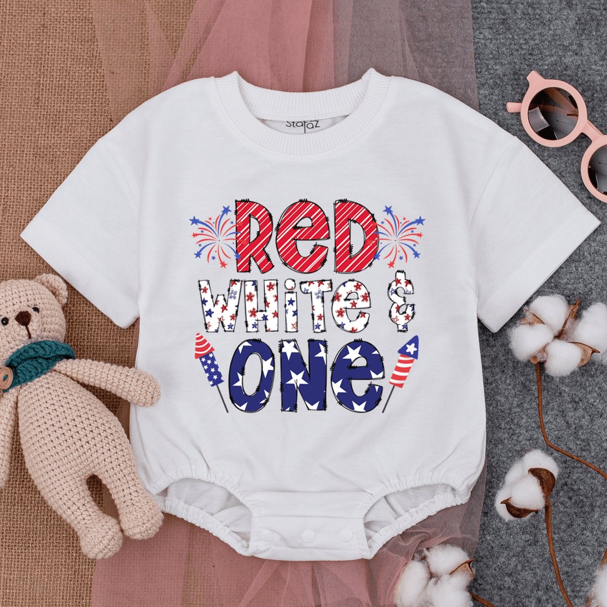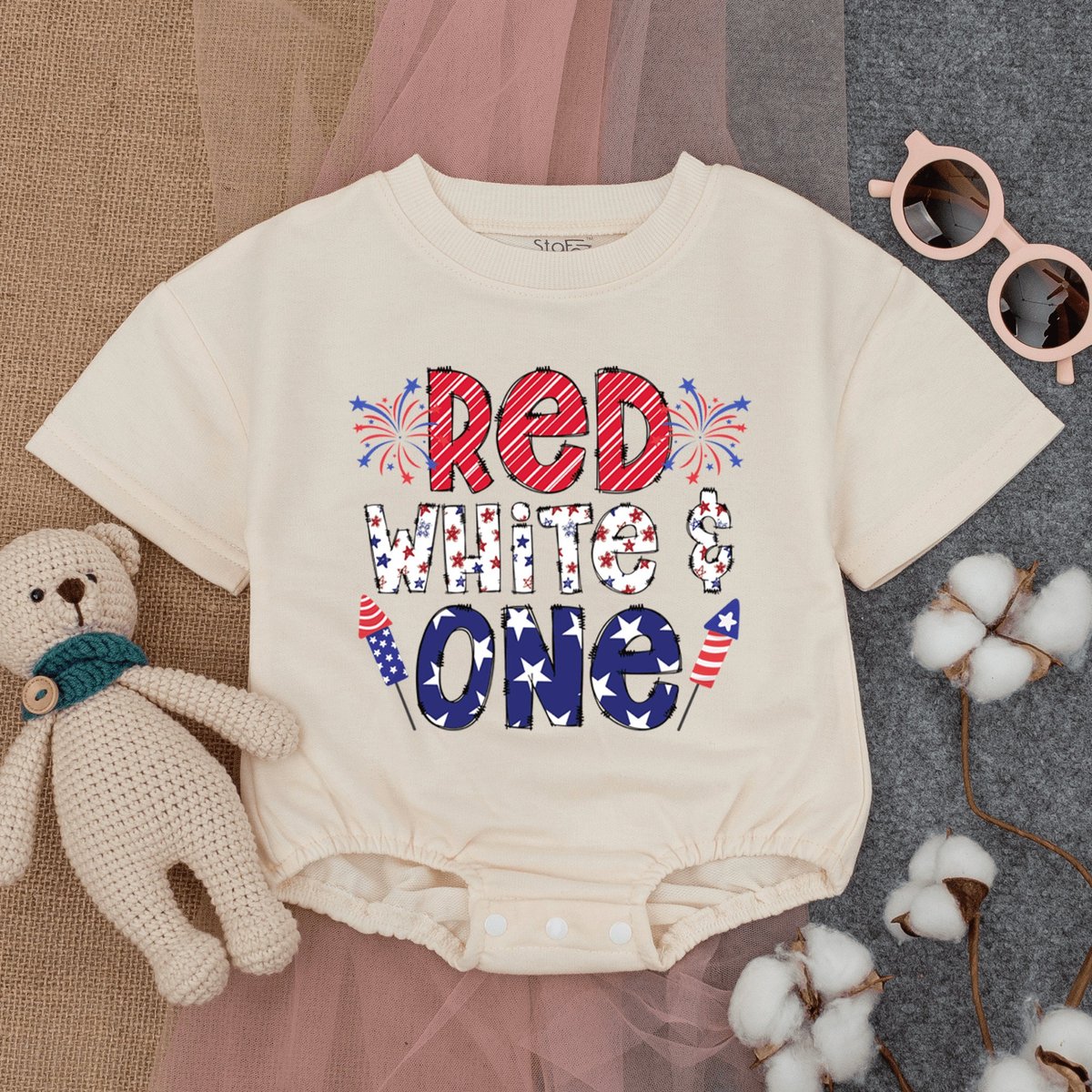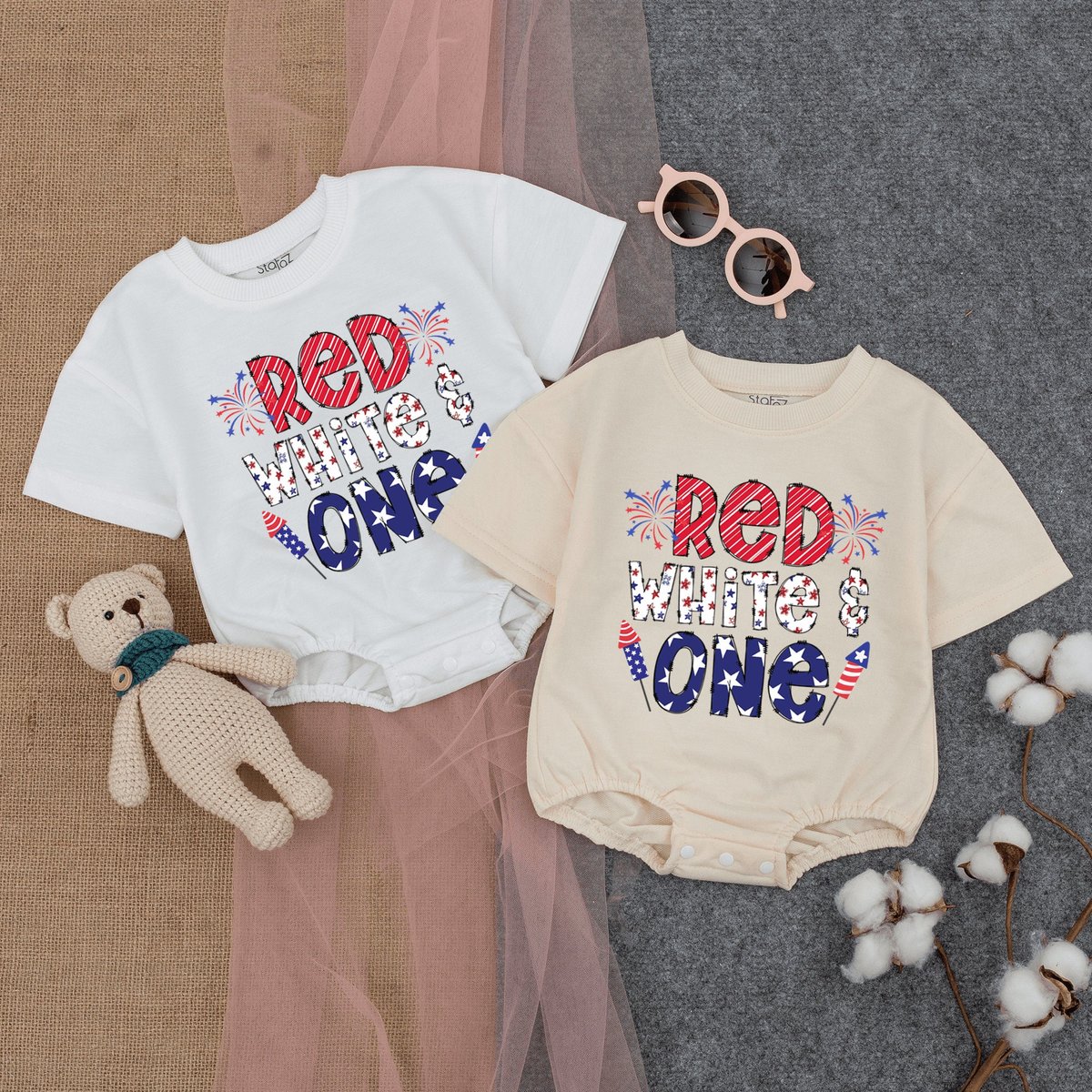 Red White One Bubble Romper Short Sleeve July 4th Birthday 1st Fourth of July 1st 4th Of July Firs 170
