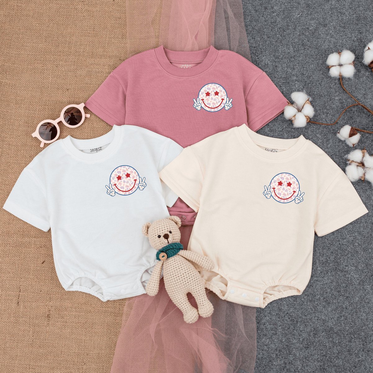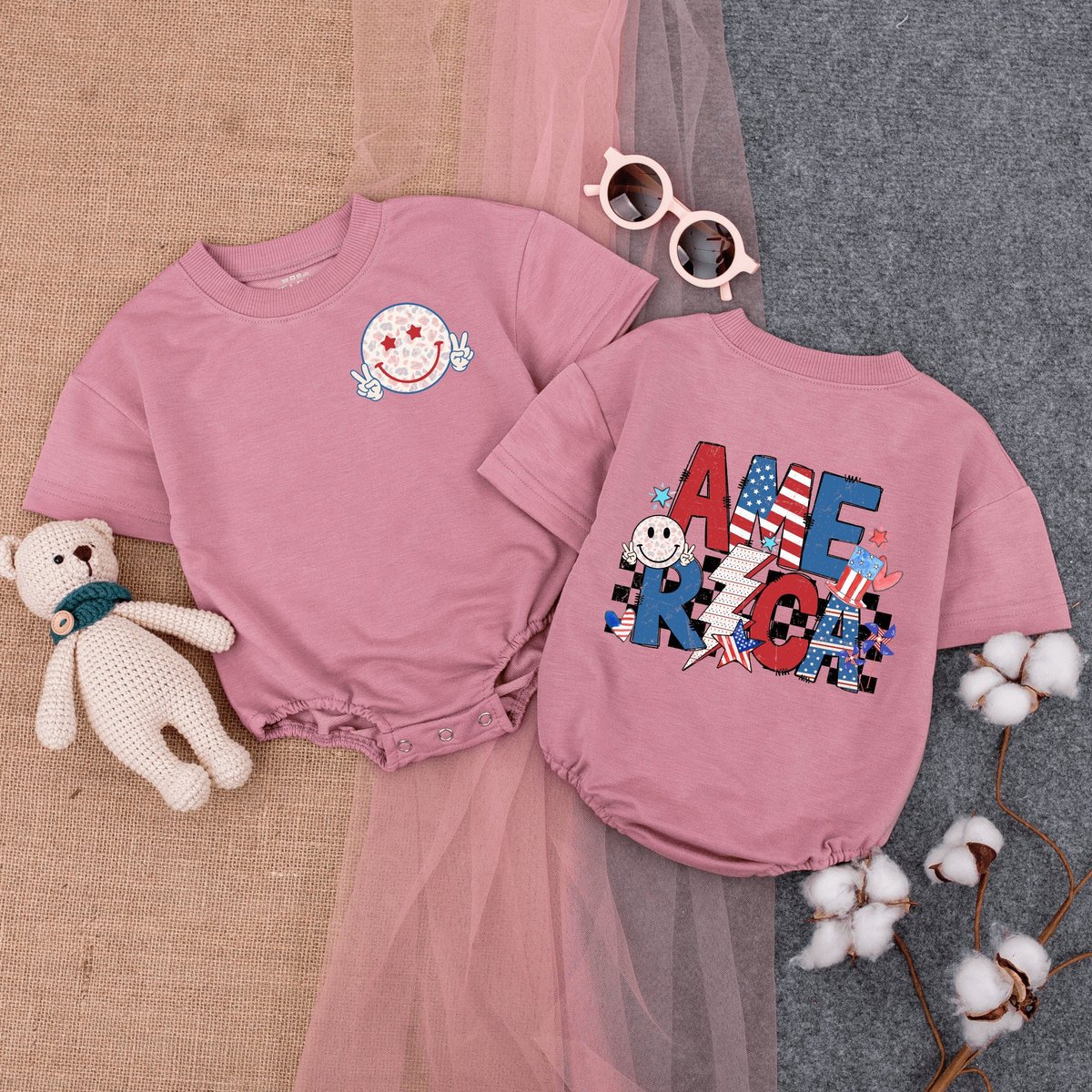 Retro 4th Of July America Smiling Face Romper Short Sleeve Cute Fourth July Baby 1st 4th Of July F 169
