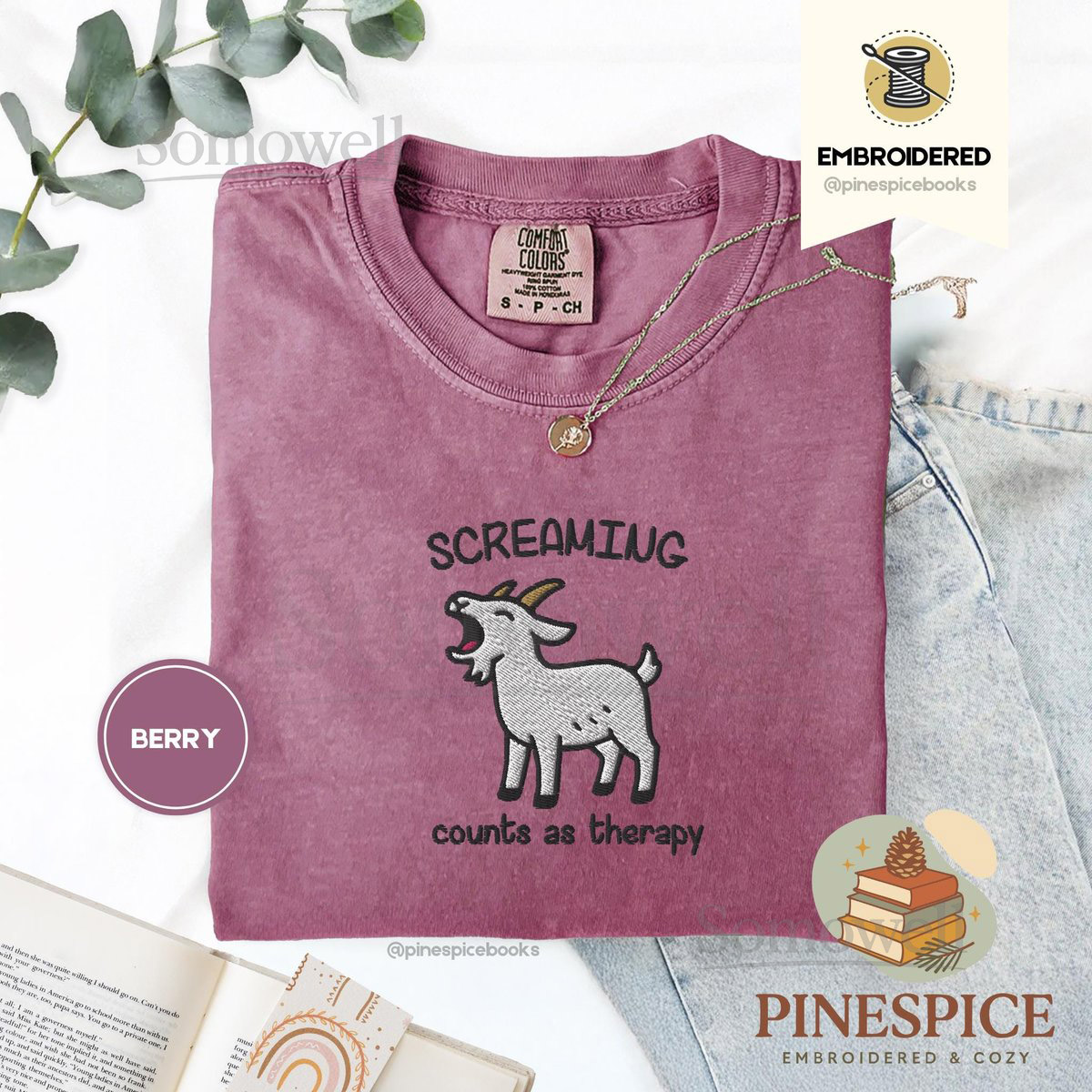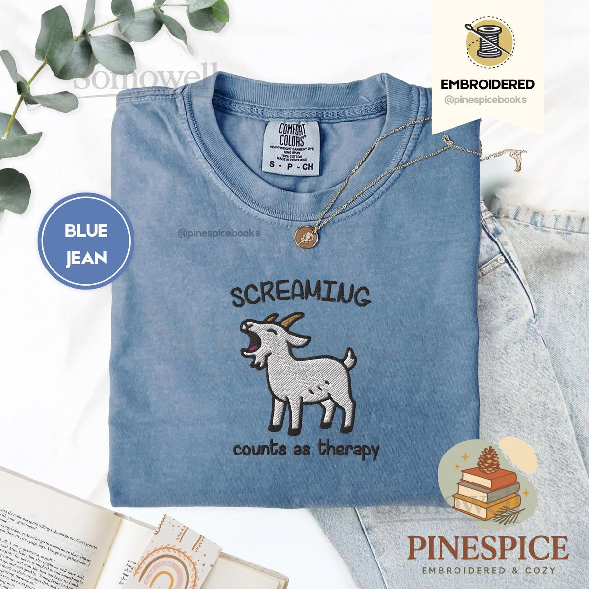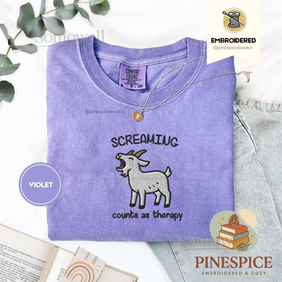 Screaming Counts As Therapy Embroidered Goat T-Shirt Funny Comfort Colors T-Shirt Screaming Goat Tee Mental Health Humor CC 1717_162