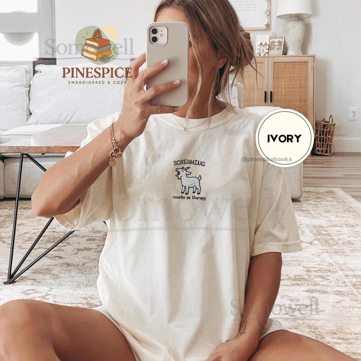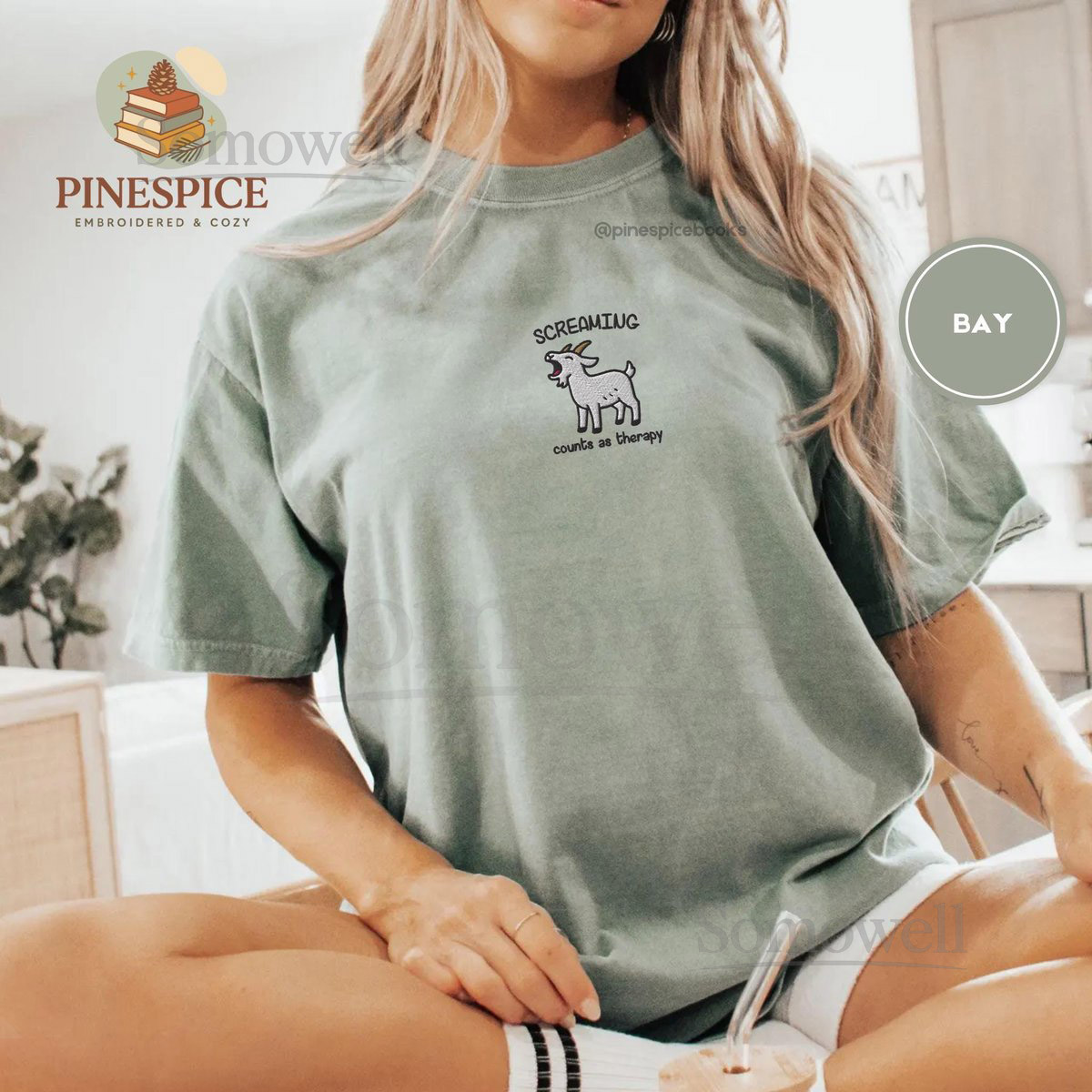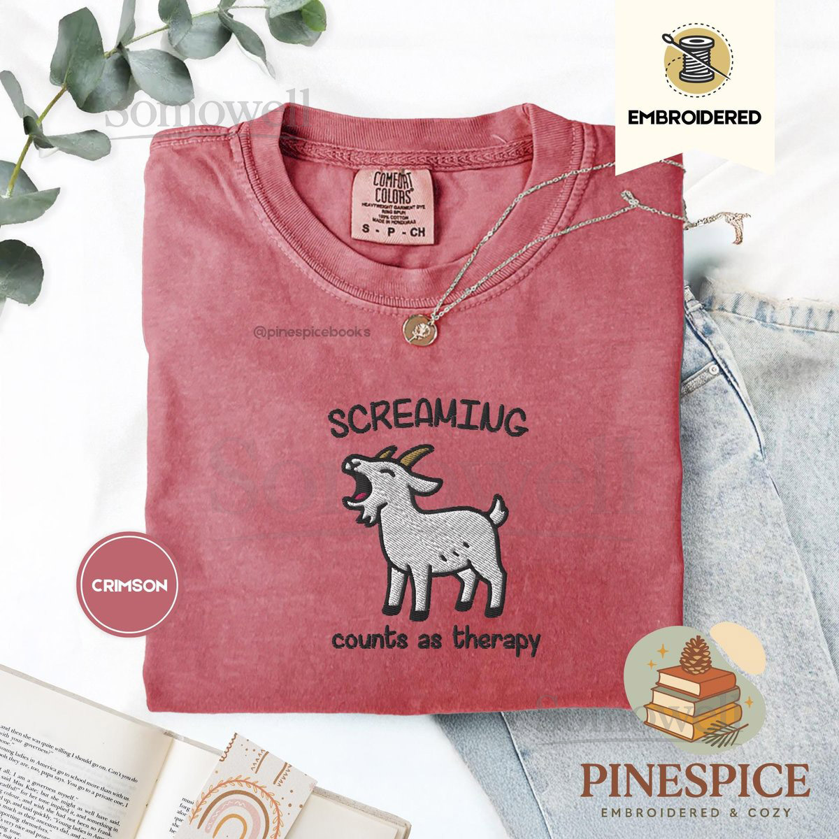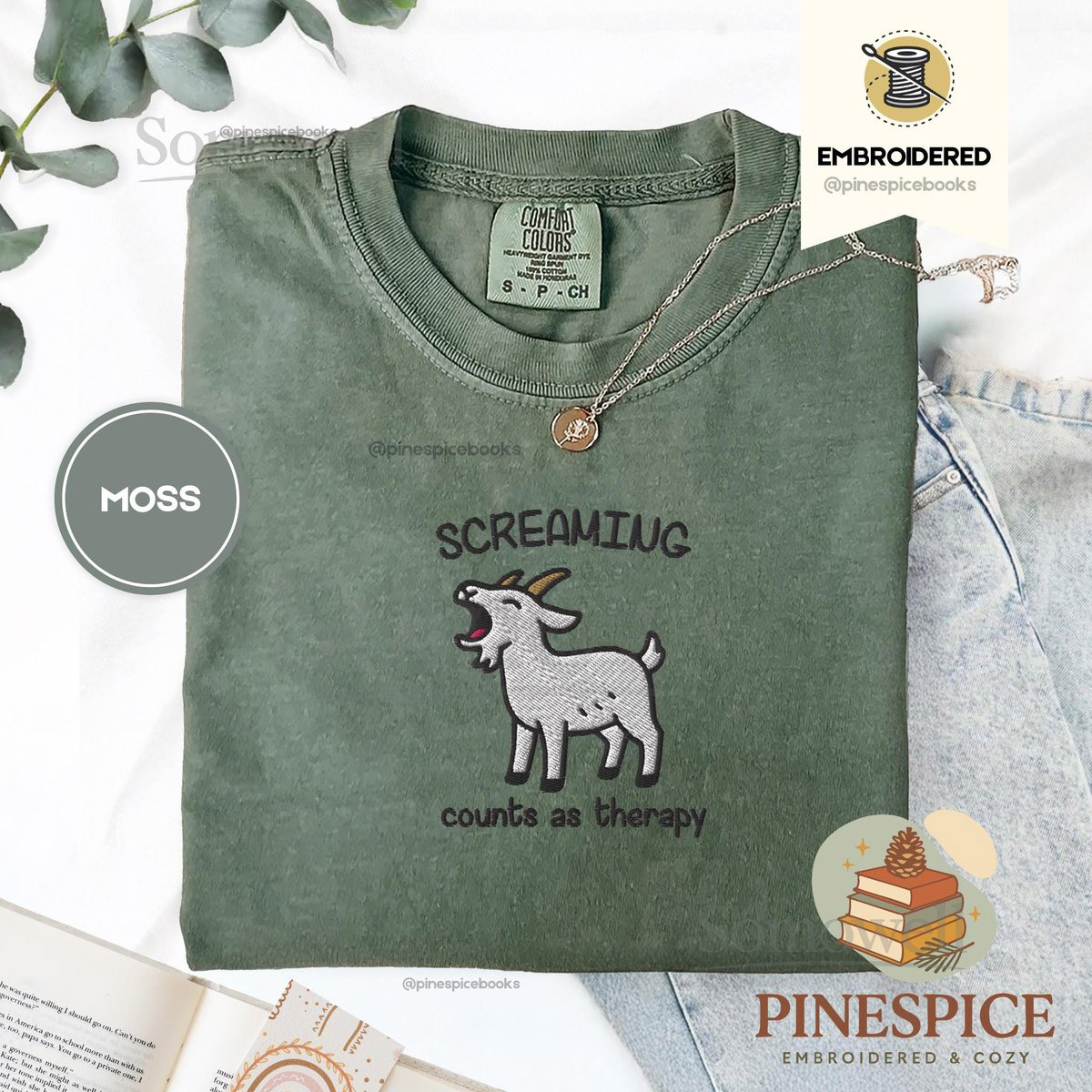 Screaming Counts As Therapy Embroidered Goat T-Shirt Funny Comfort Colors T-Shirt Screaming Goat Tee Mental Health Humor CC 1717_162
