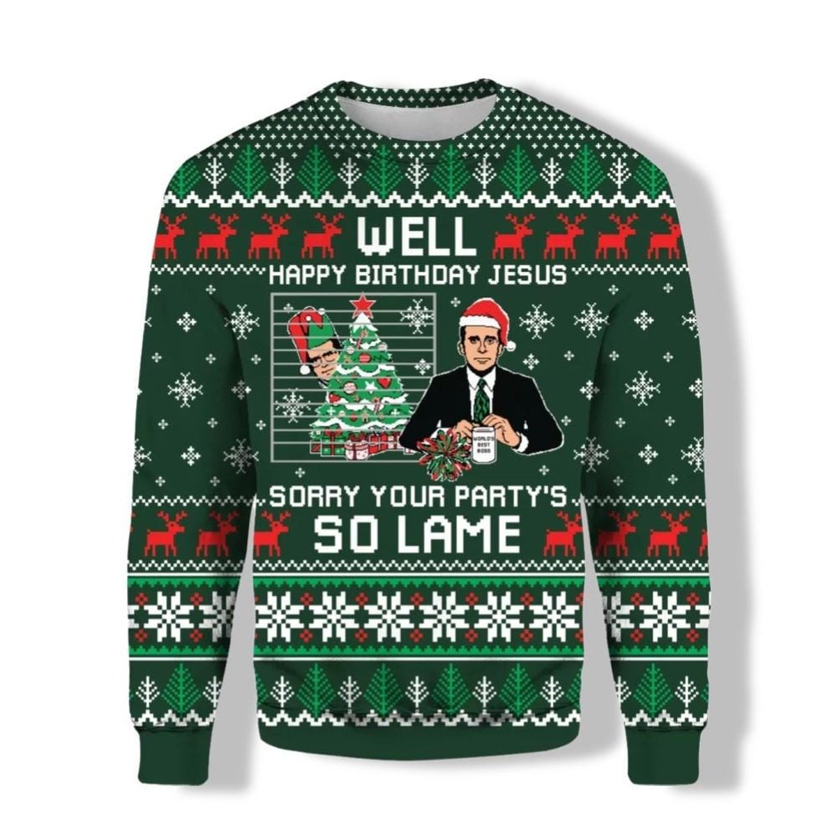 The Office Happy Birthday Jesus Sorry Party So Lame Green Christmas Ugly Sweater Jumper
