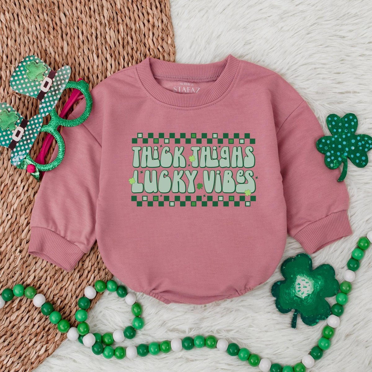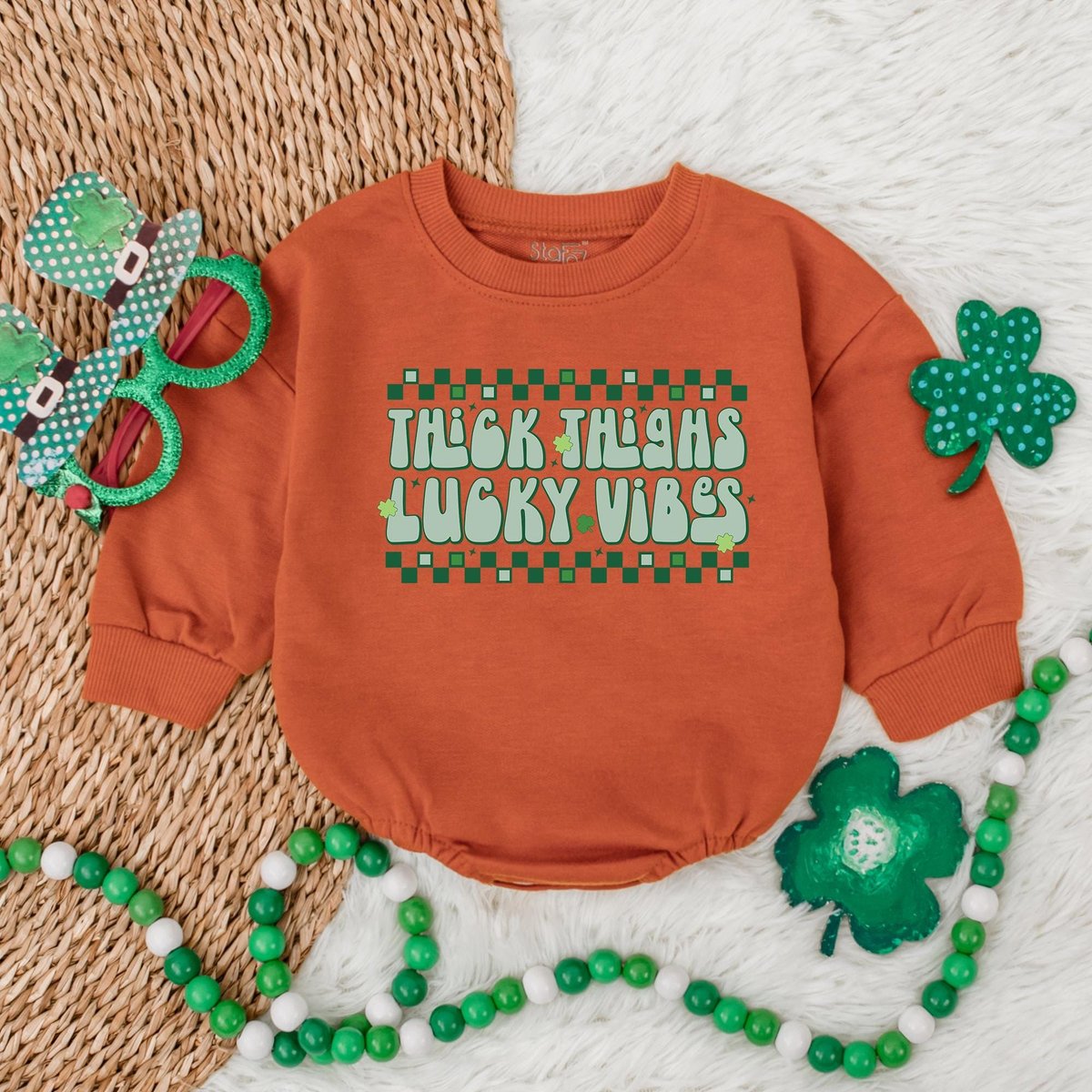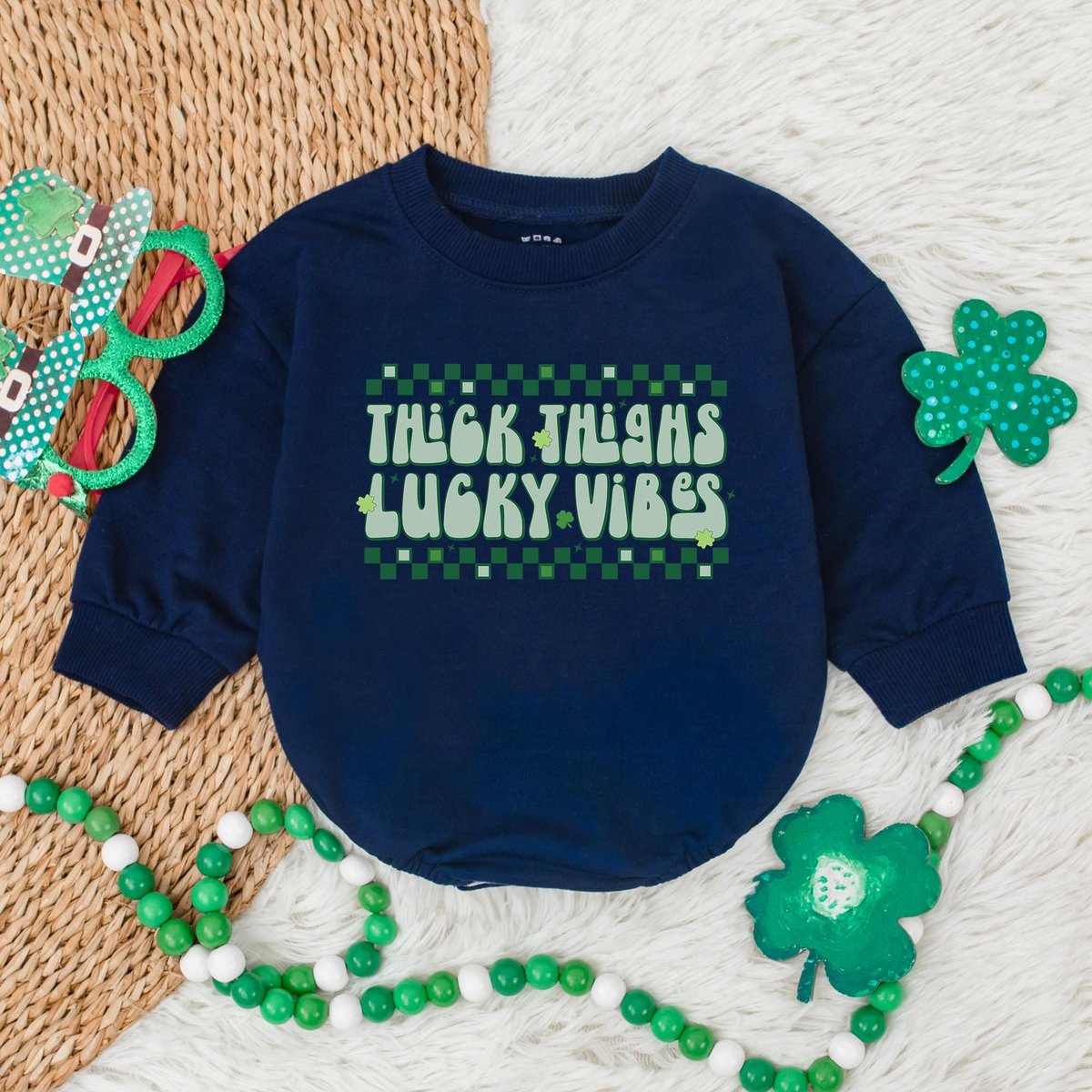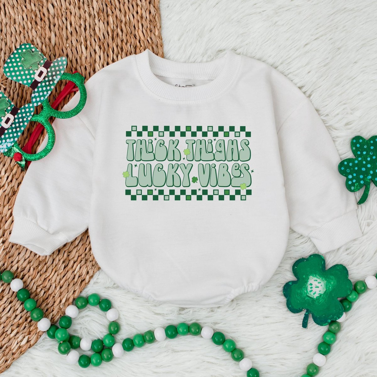 Thick Thighs Lucky Vibes Baby BodysuitLucky Charm St. Patrick’s Day Bubble RomperSt. Patrick’s Day 185