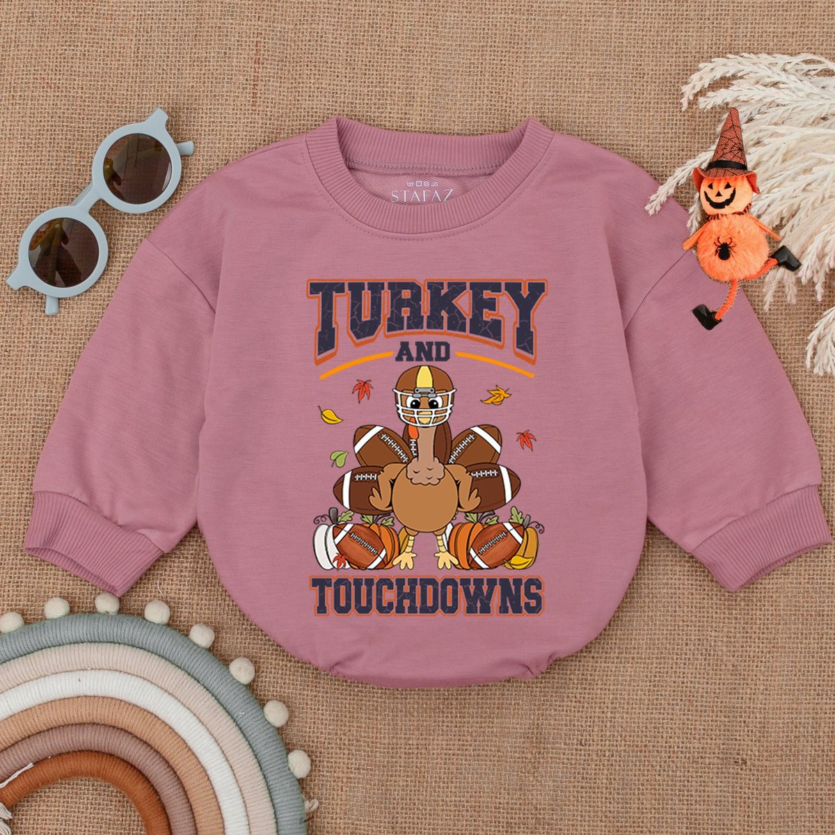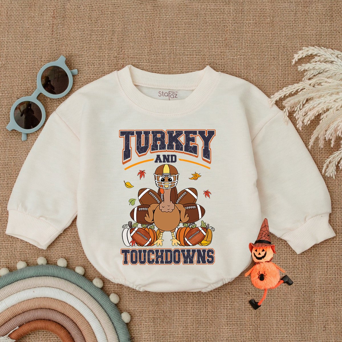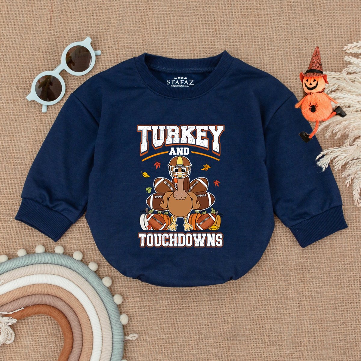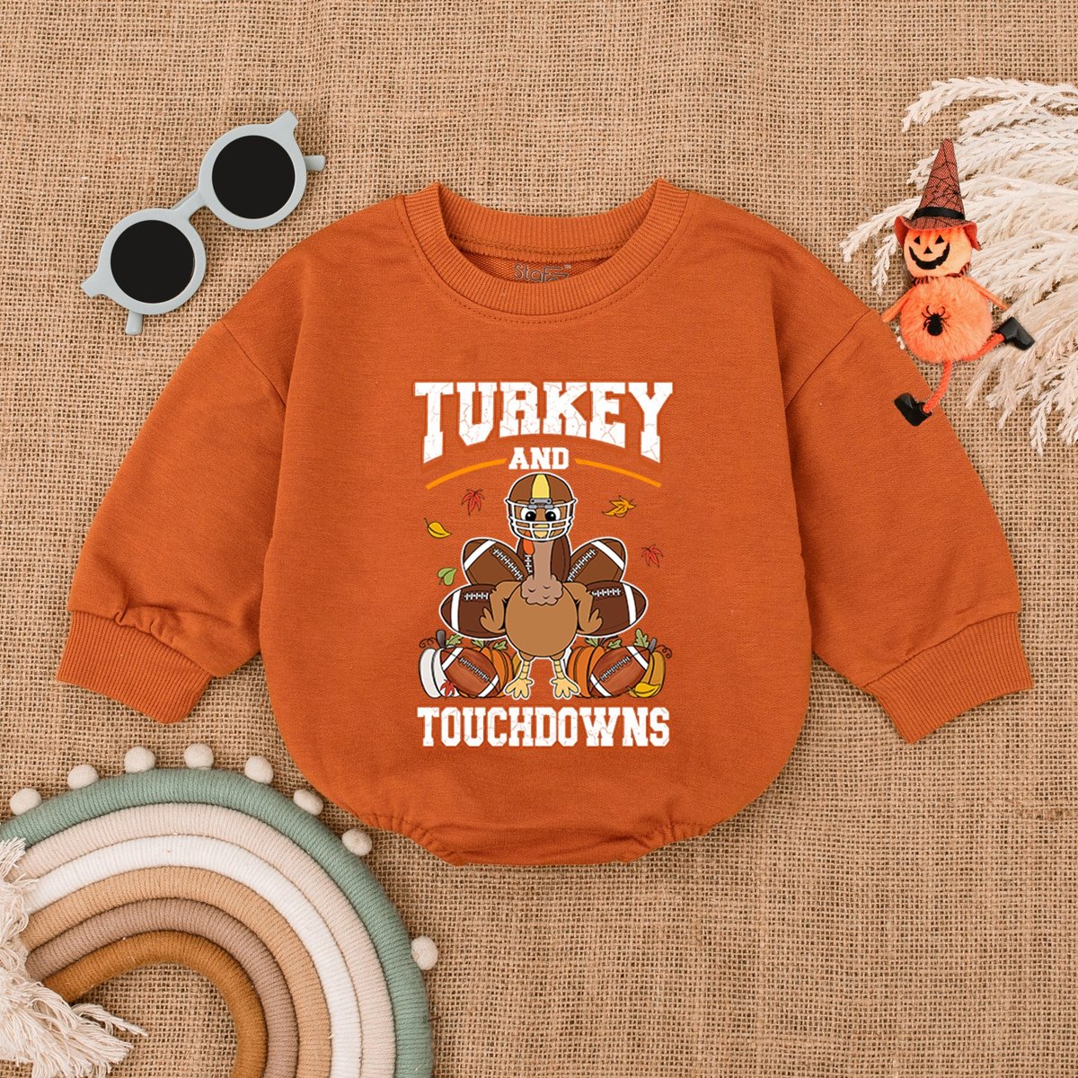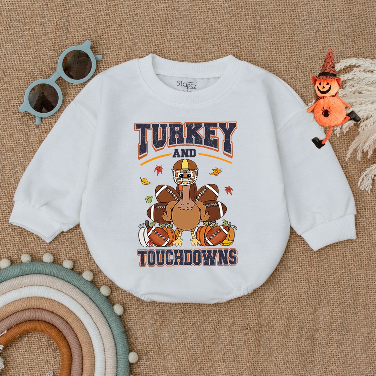 Turkey and Touchdowns Bubble Romper Turkey Football Thanksgiving Baby Outfit Bubble Romper Fall Baby 178