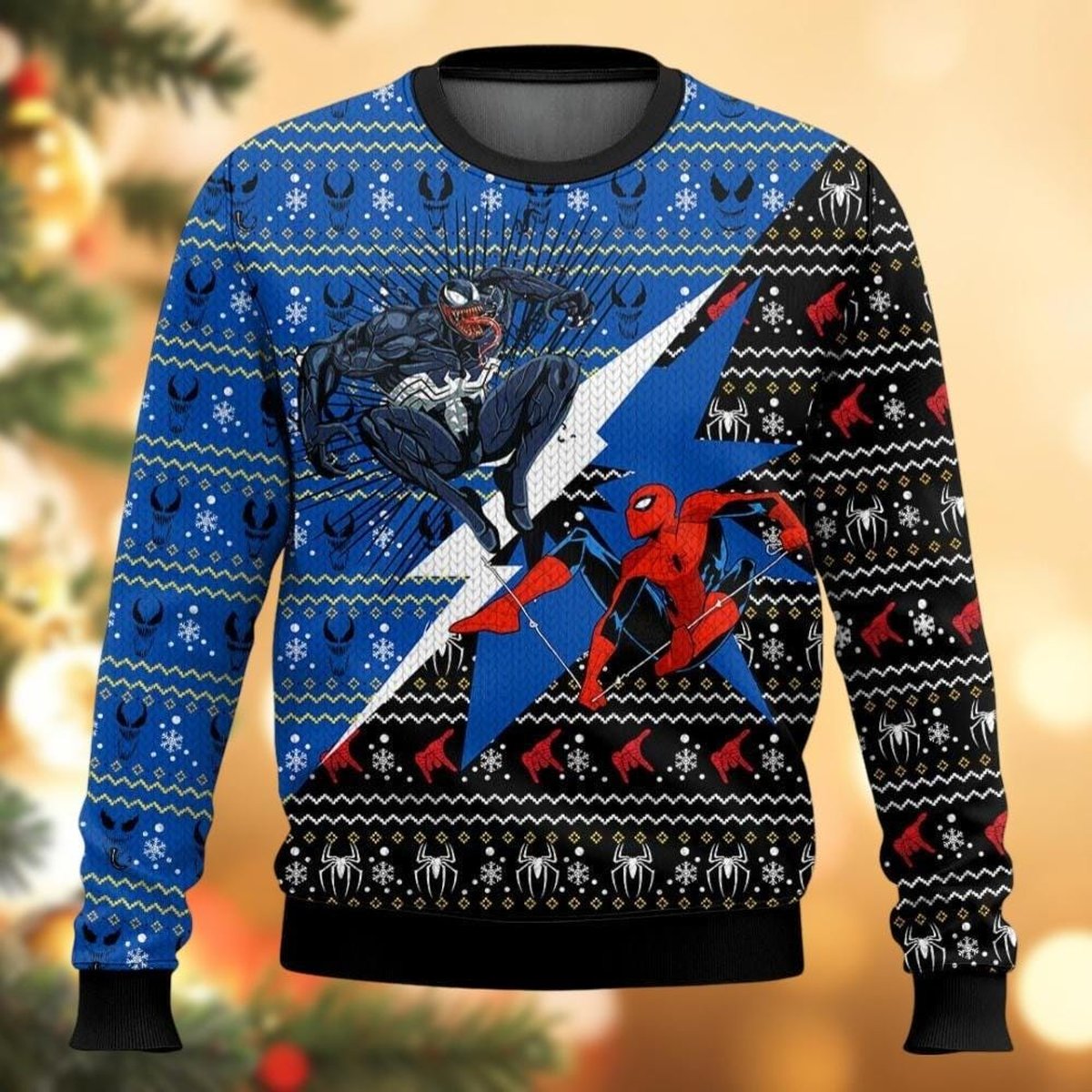 Venom And Spiderman Blue Black Ugly Christmas Sweater Funny Hero Knit Pullover Gift