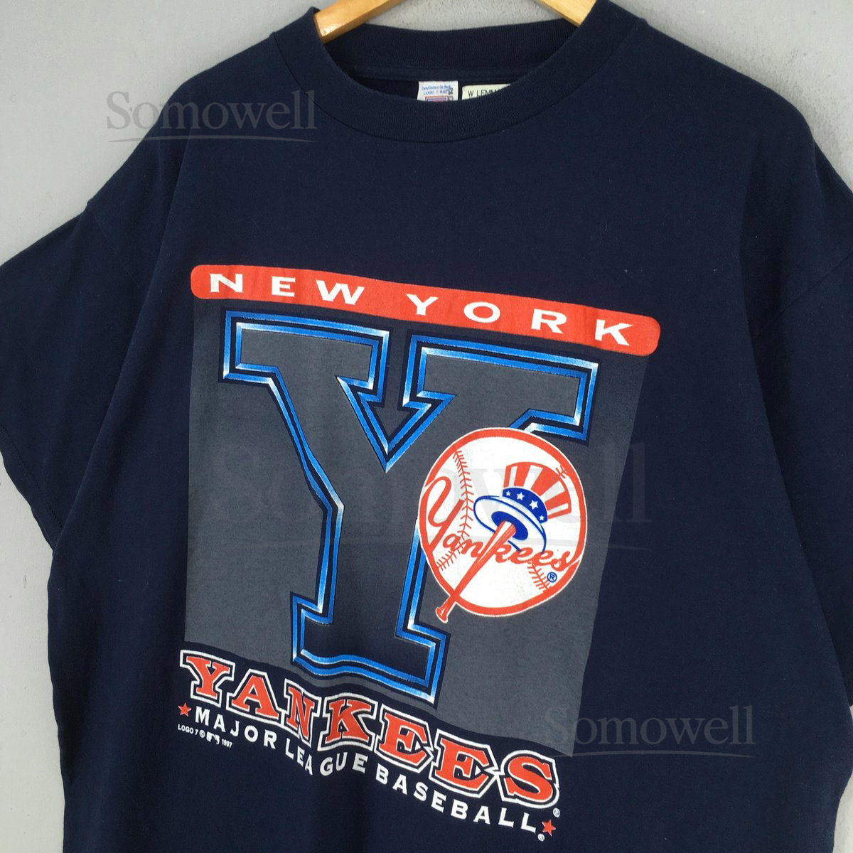 Vintage 90s New York Yankees MLB Blue T shirt XXLarge New York Yankees Printed Spell Out Jersey NY Yankees Baseball World Series Tees XXL_438