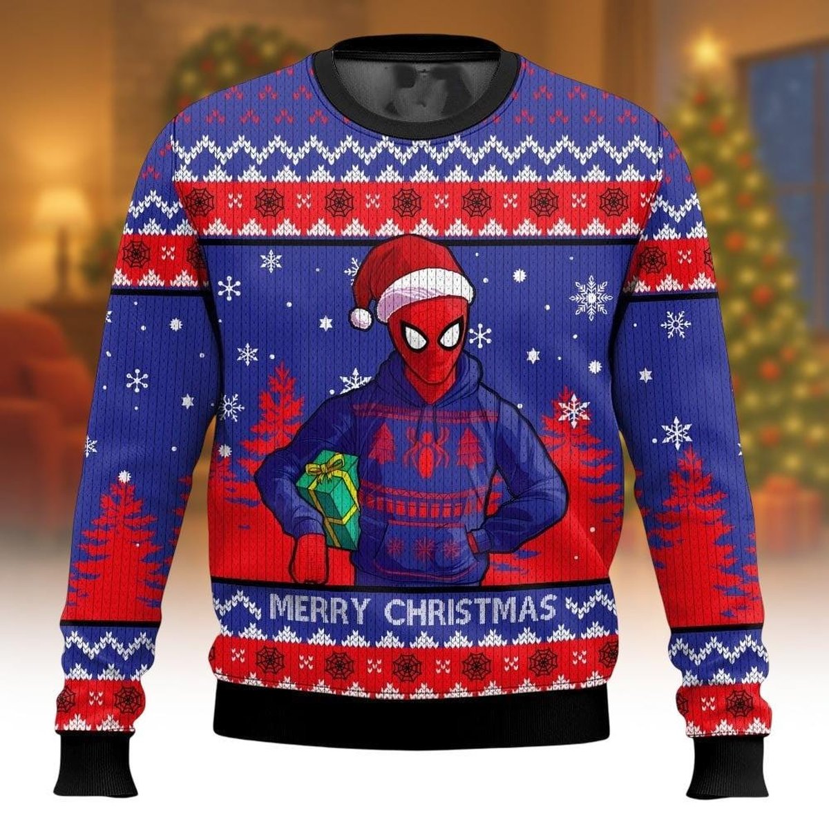 Spider-Man Merry Christmas Blue Ugly Sweater Funny Superhero Holiday Knit Jumper