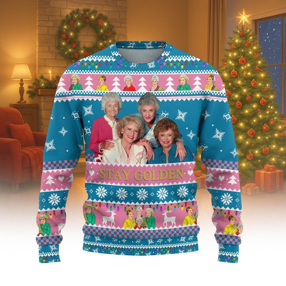The Golden Girls Blue Ugly Christmas Sweater Stay Golden Funny Retro TV Show Knit Jumper
