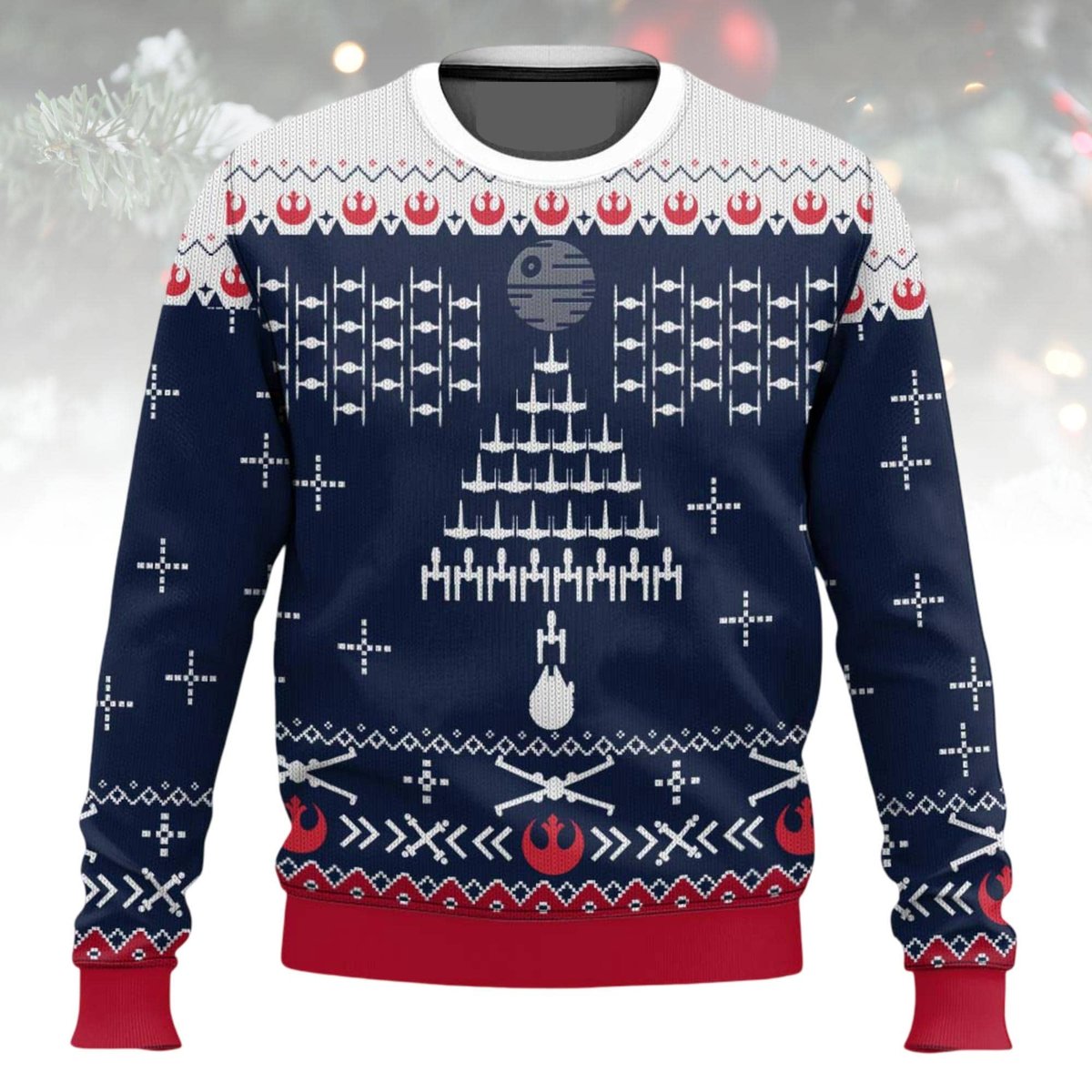 Star Wars Death Star Tree Pattern Ugly Christmas Sweater Navy and White Holiday Knit Jumper