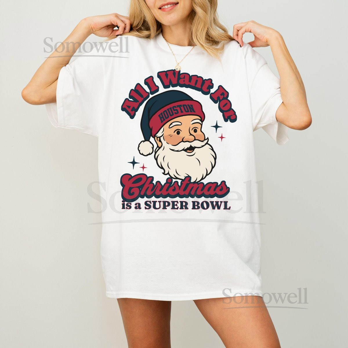 Houston Football All I Want For Christmas Is A Super Bowl T-Shirt Youth Retro Texan Tee Holiday Santa Football Fan Shirt Game D_225