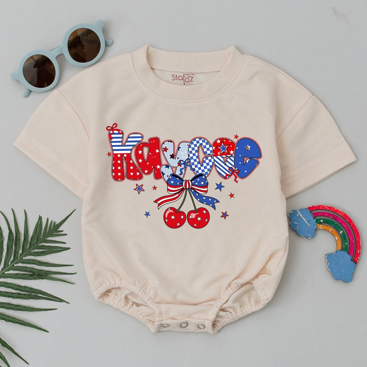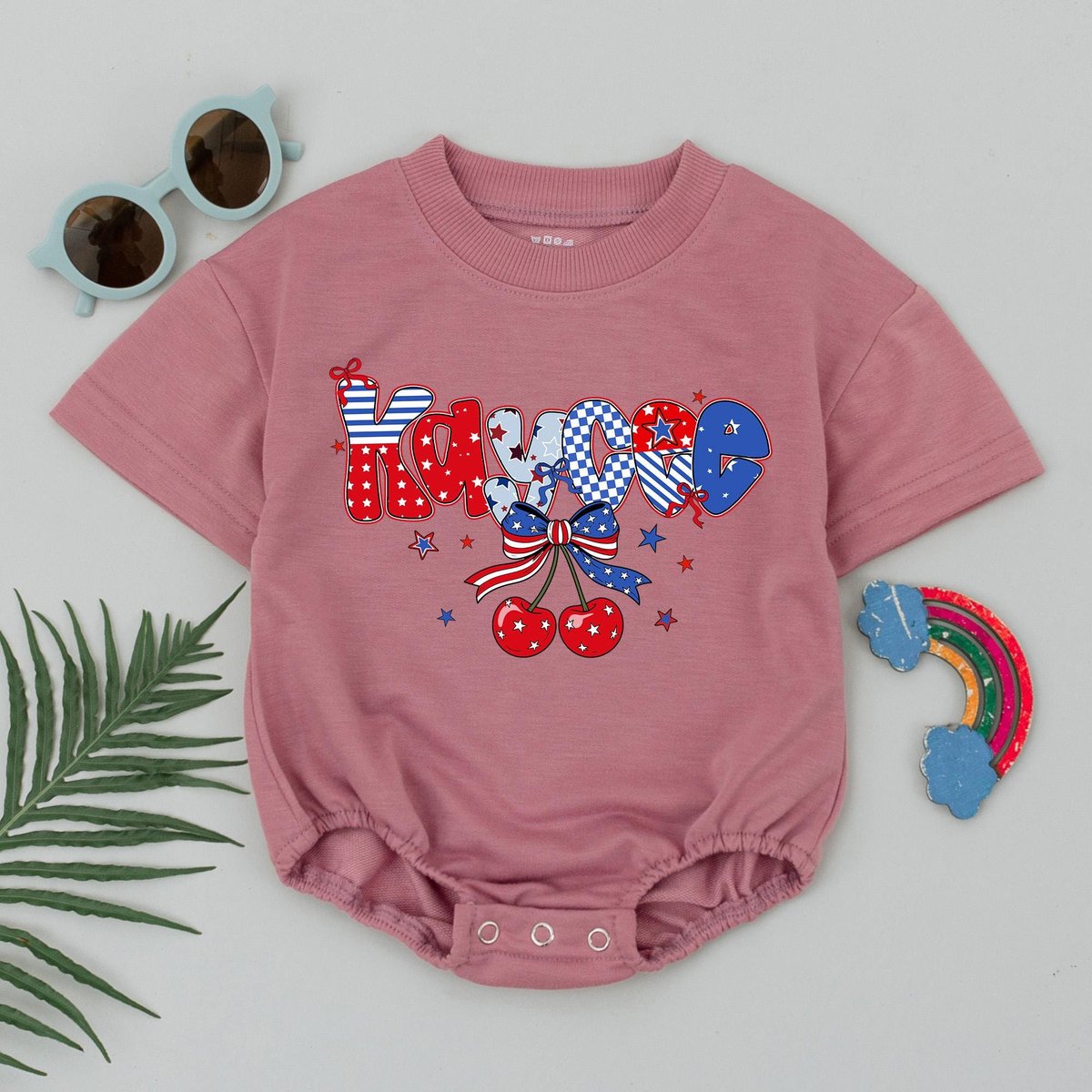 Personalized Baby 4th of July Romper Retro Cherry Bow USA Outfit Custom Name Patriotic Bodysuit Inde