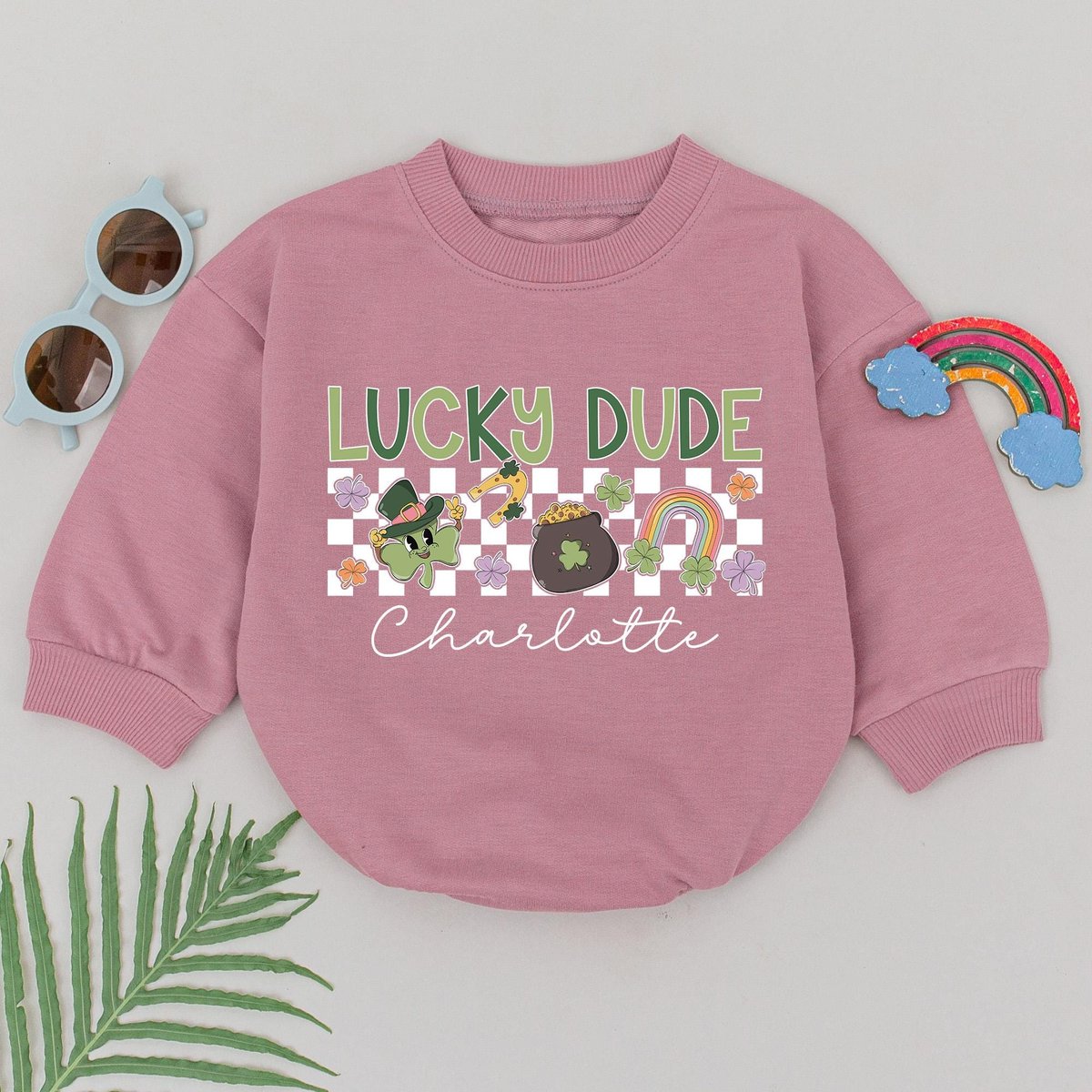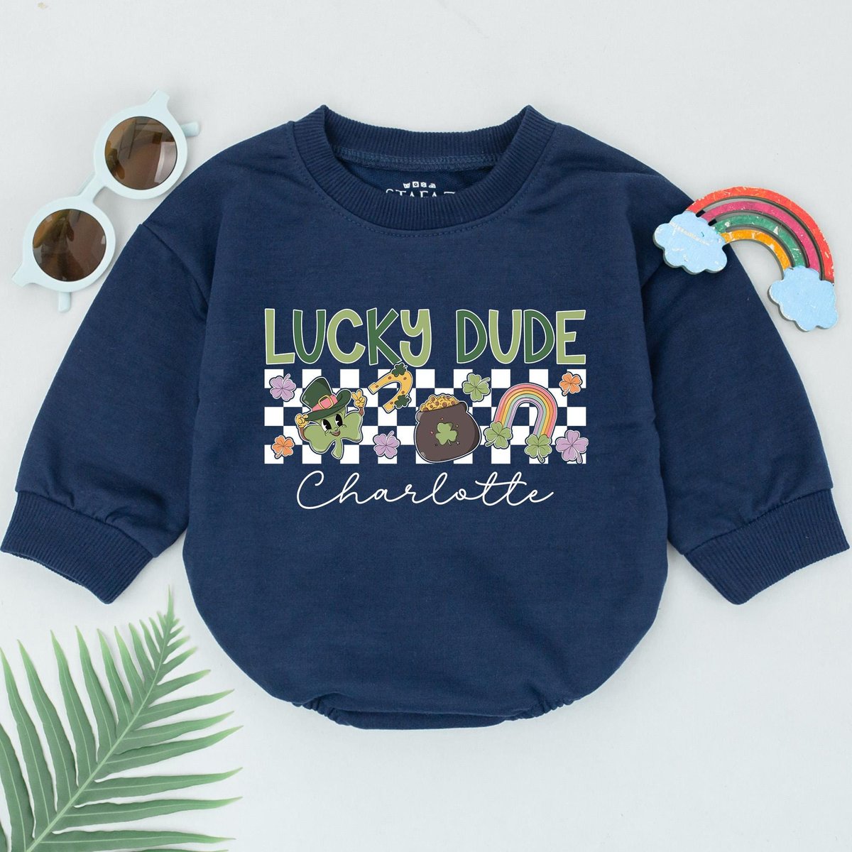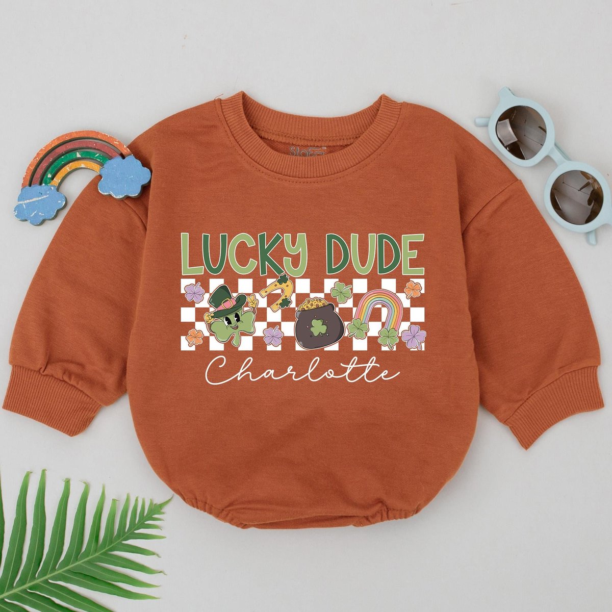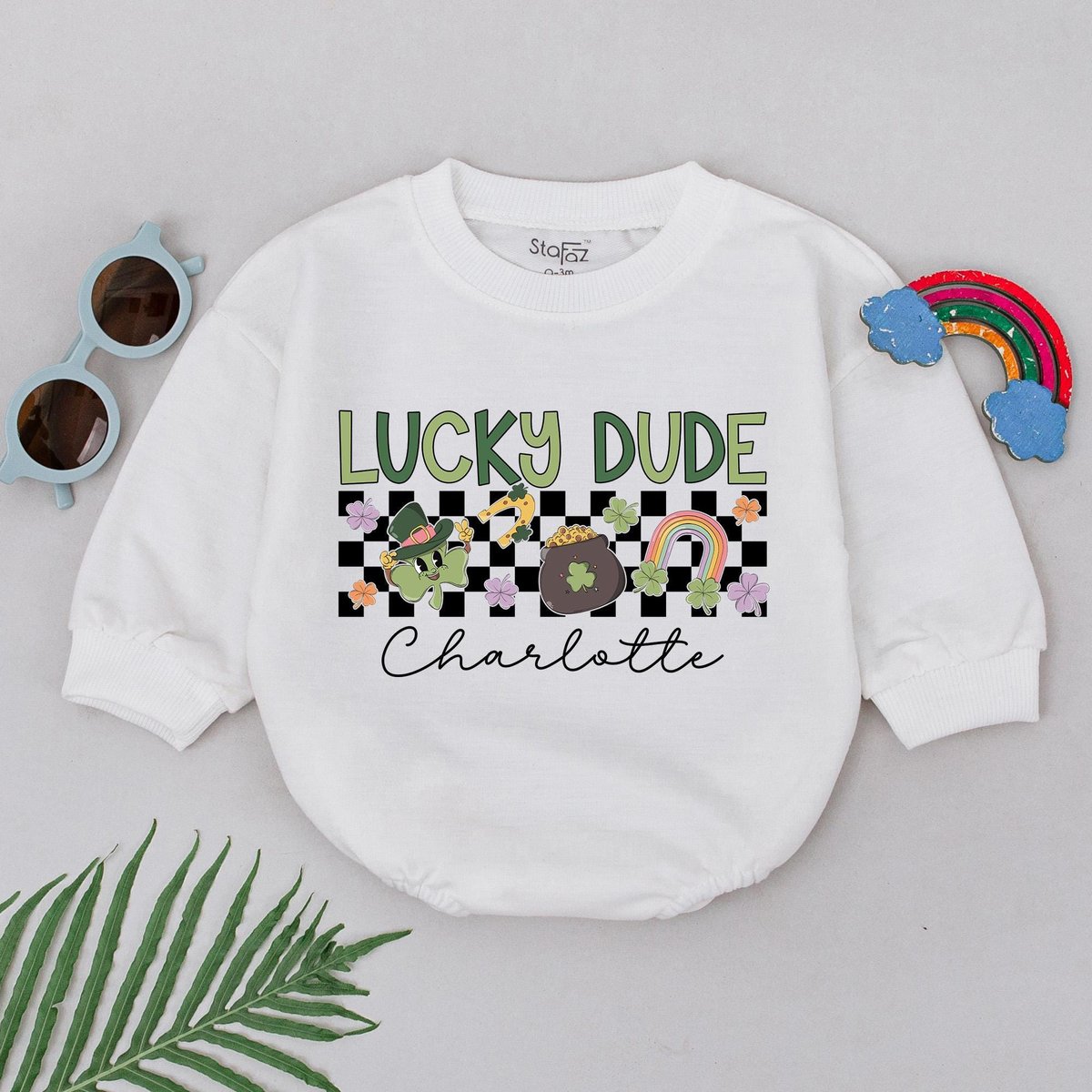 Personalized Lucky Dude Baby Romper Retro Patrick’s Day Romper Natural Baby Shower Gift 1st Patrick