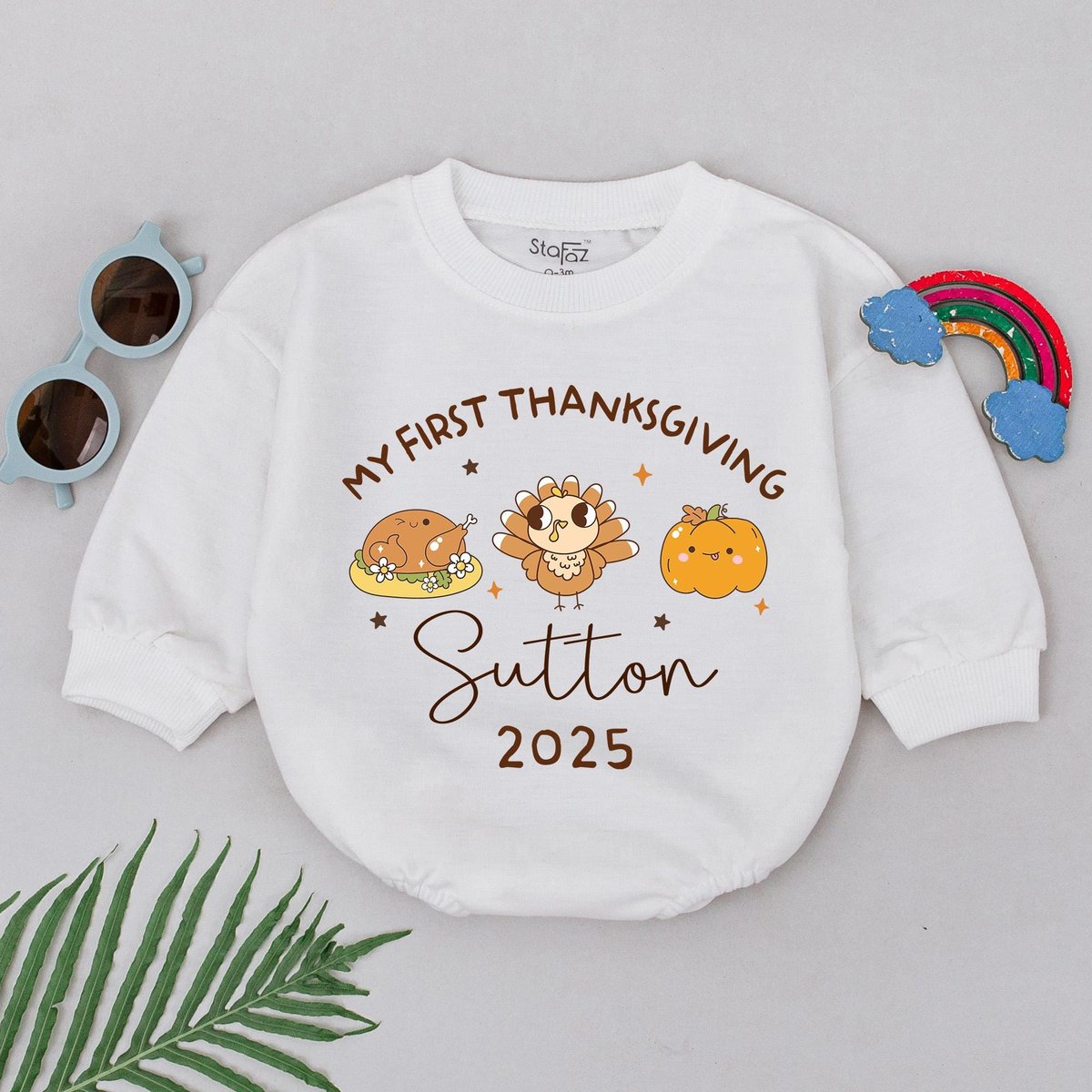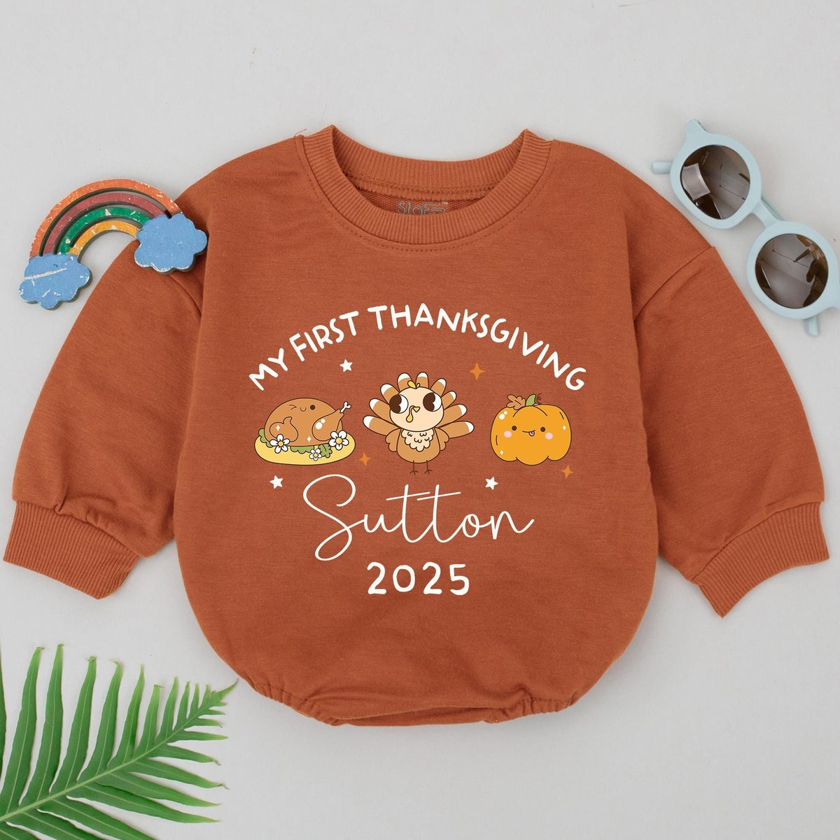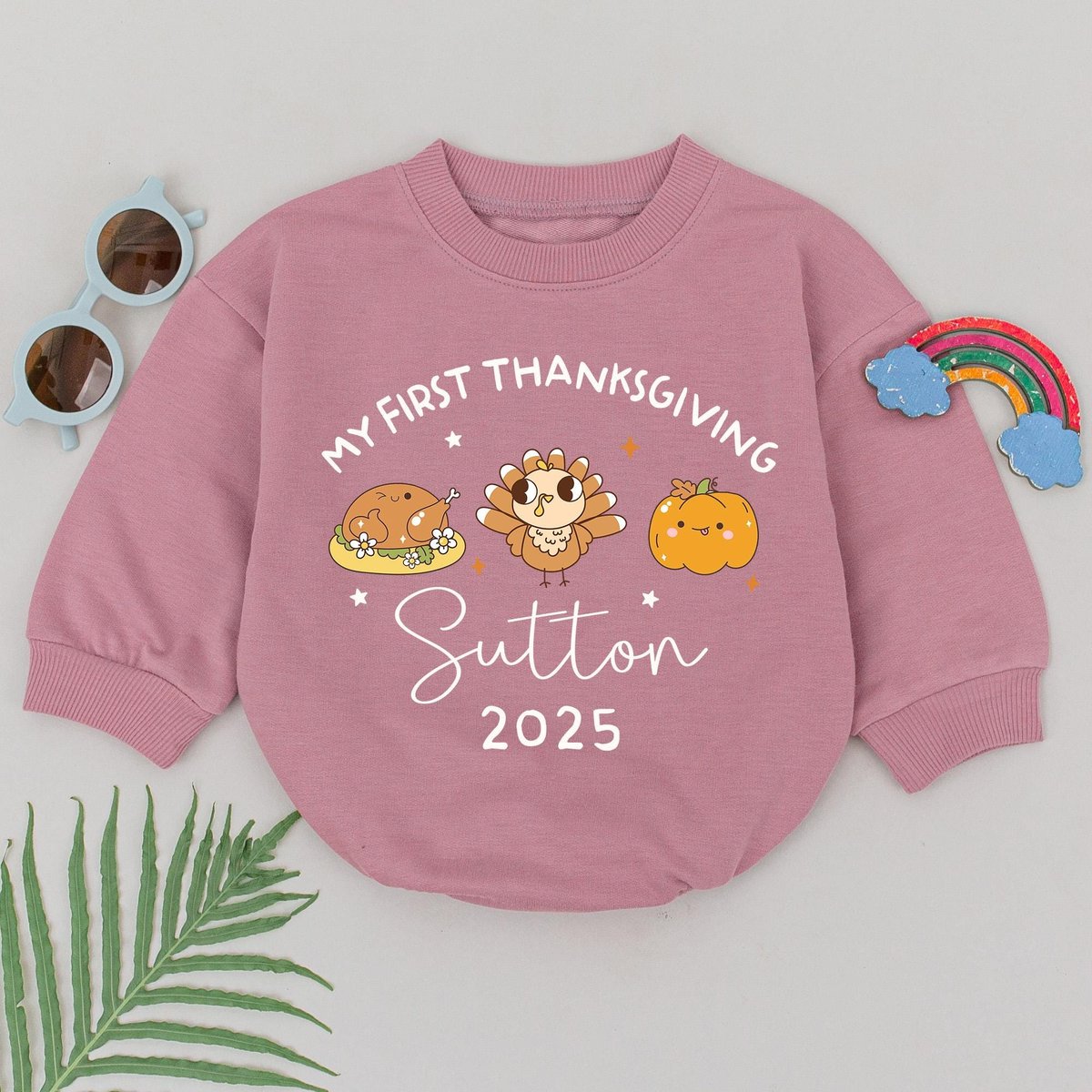 Personalized My First Thanksgiving Romper Custom Name Thanksgiving Bodysuit Turkey Pumpkin Outfit Li