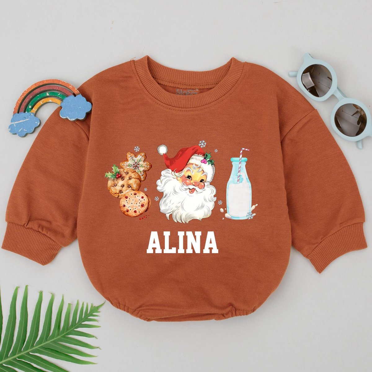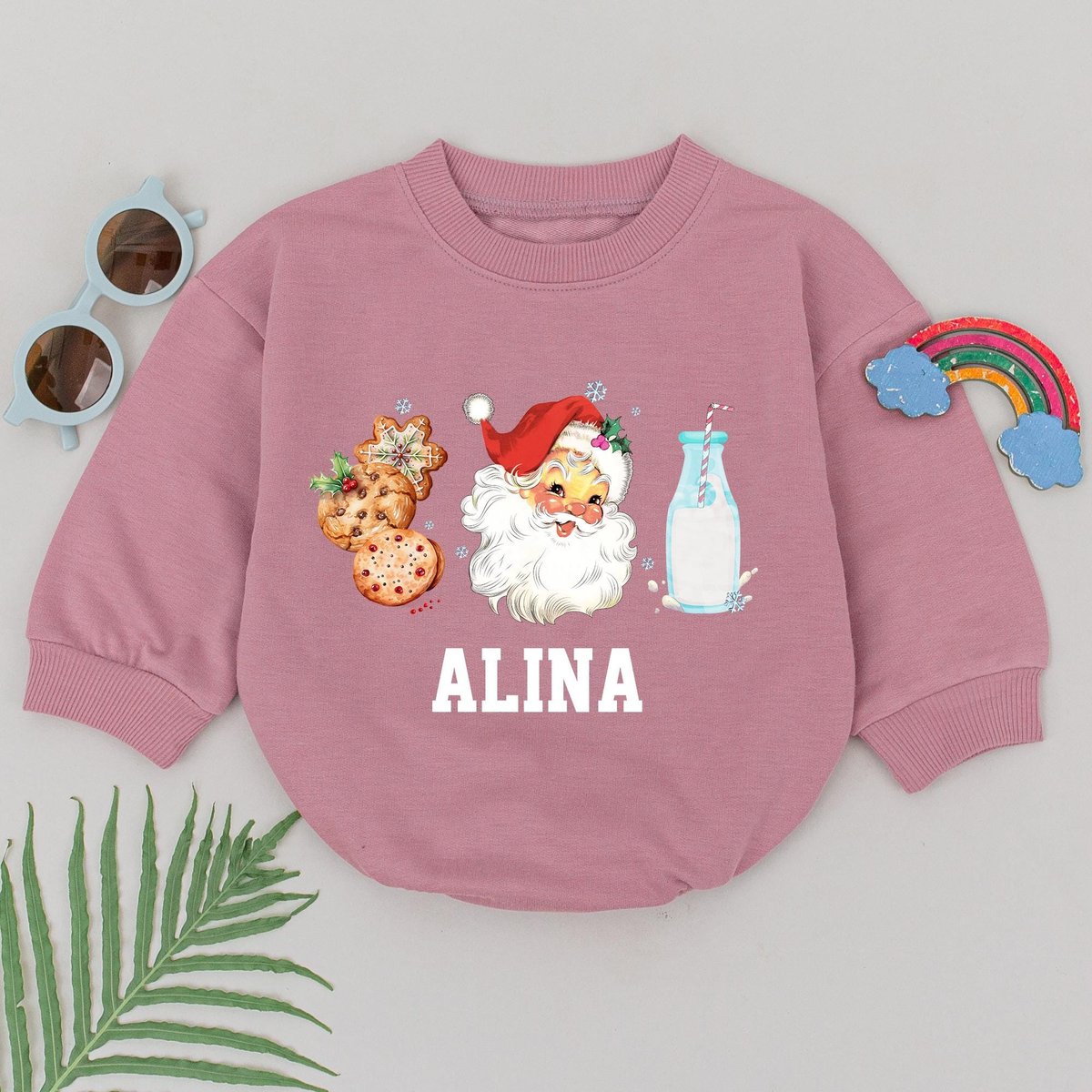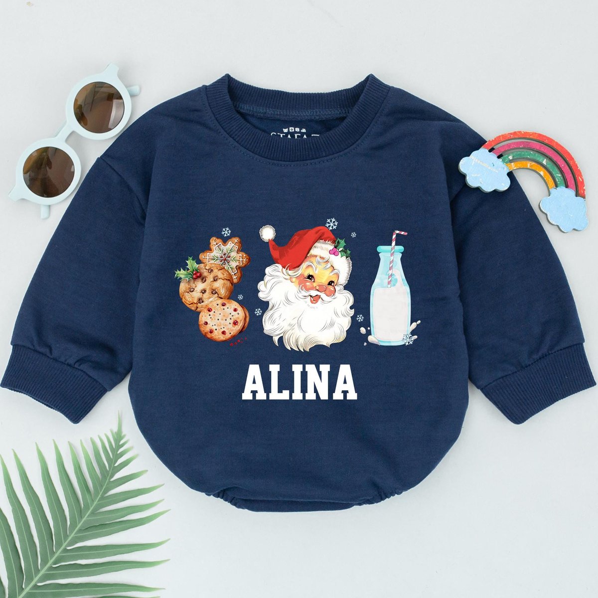 Personalized Name Christmas Romper 1st Christmas Baby Bodysuit Christmas Outfits Santa Milk Cookies