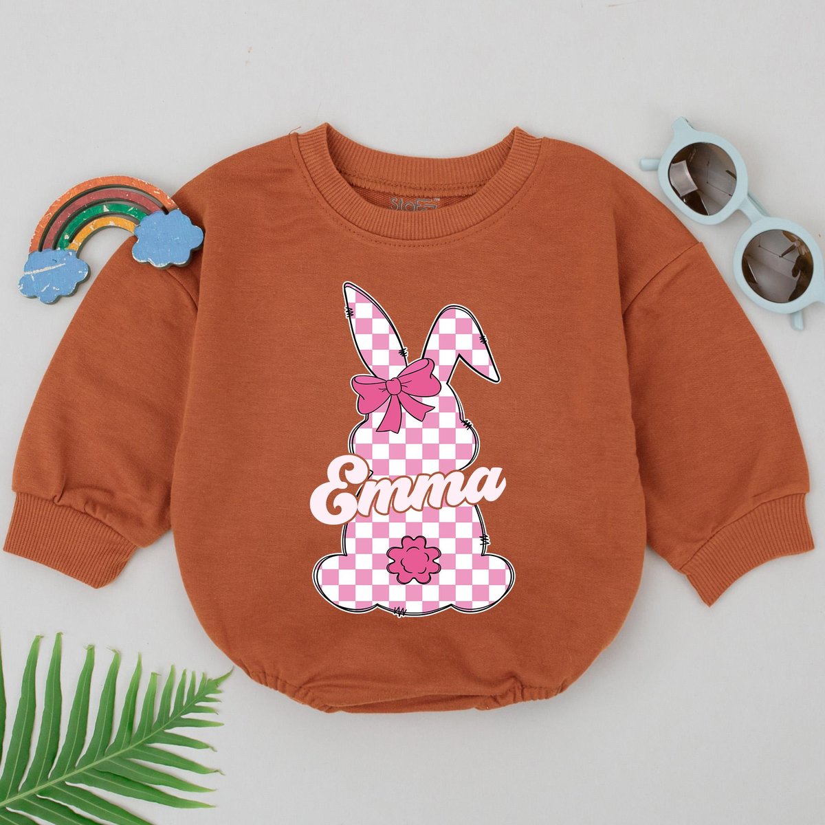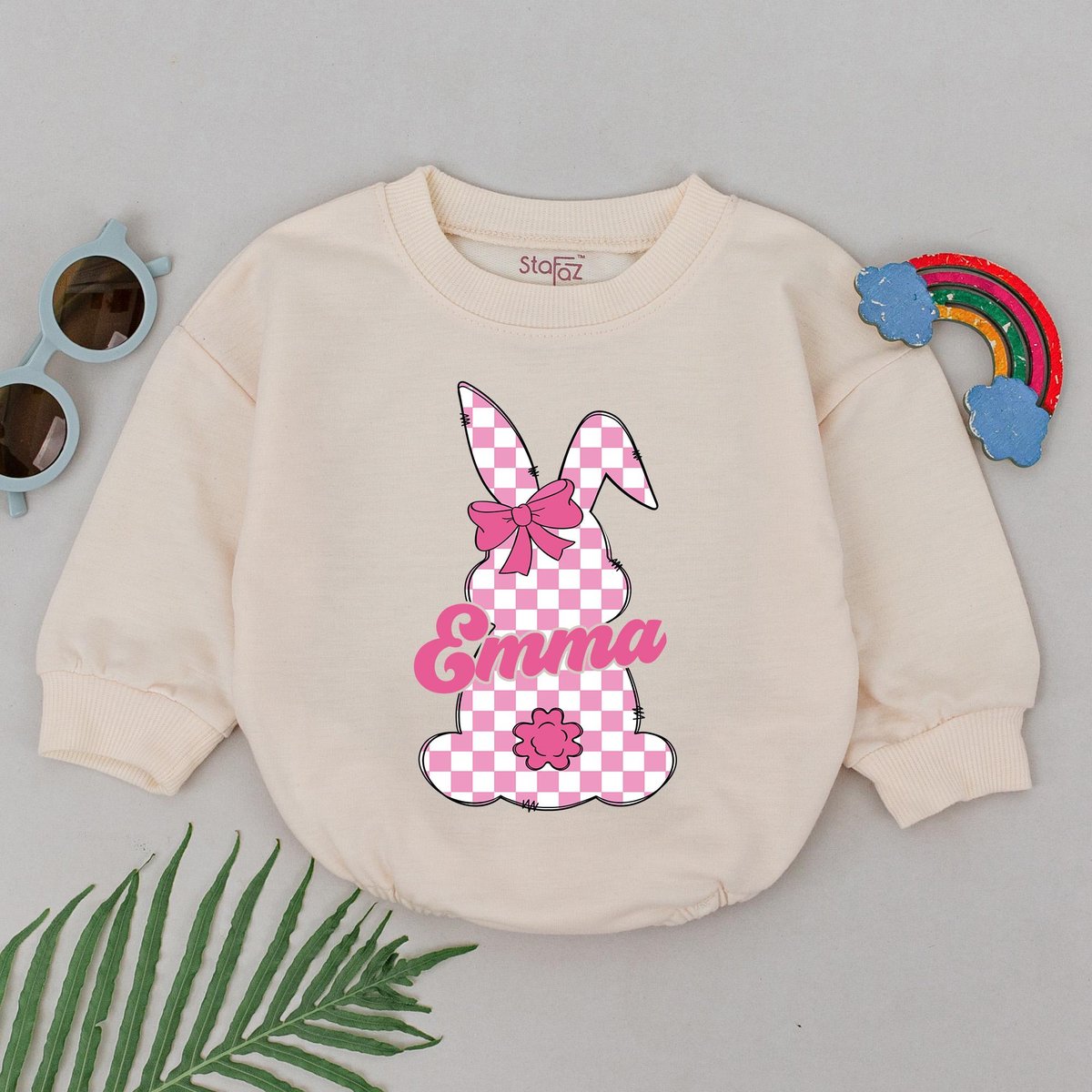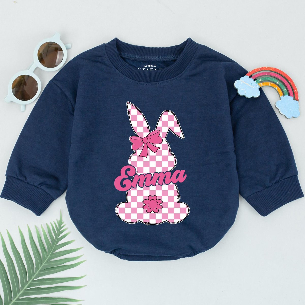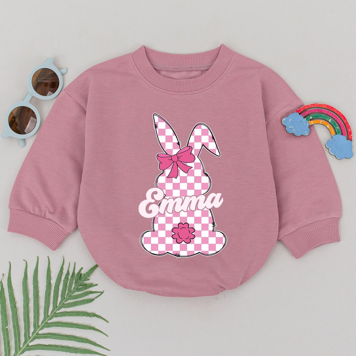Personalized Name Pink Checkered Bunny Romper Retro Easter Day Romper Little Bunny Bodysuit First Ea
