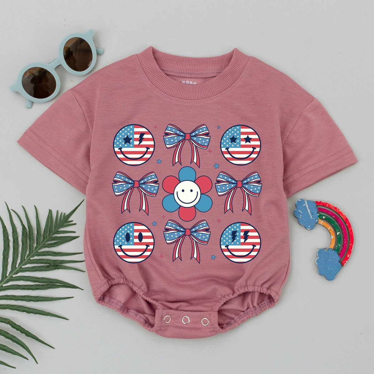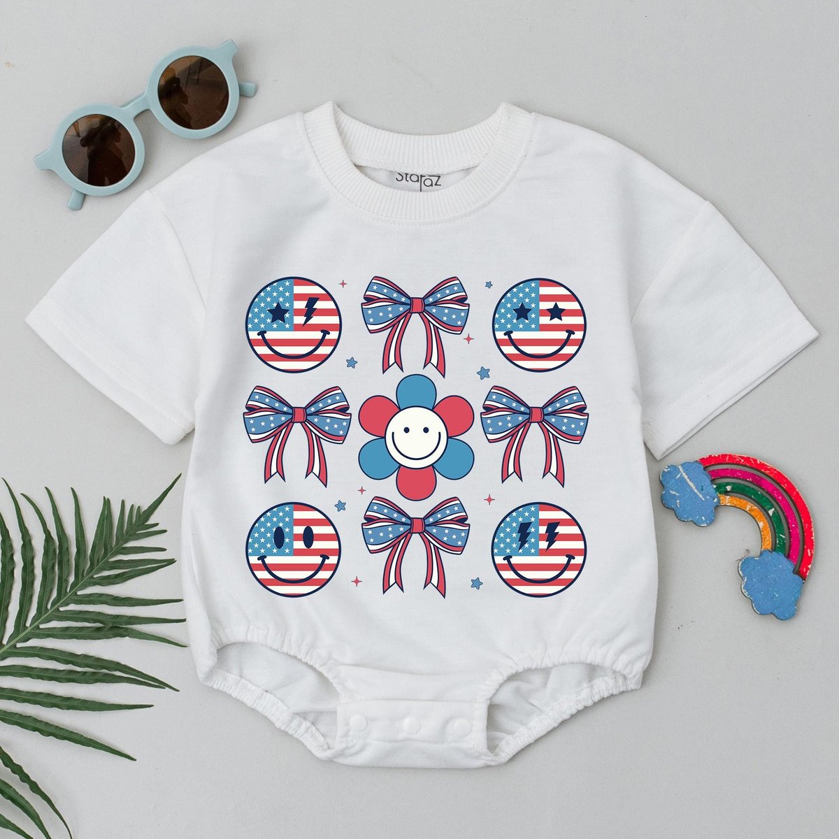 Retro Patriotic Baby Girl Romper USA Flag Bow Bubble Bodysuit Cute Red White Blue Outfit for 4th of