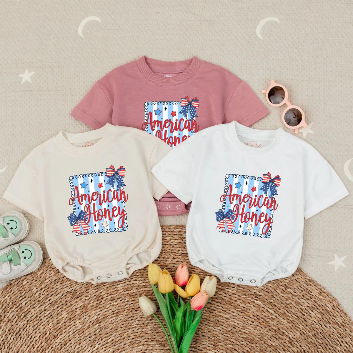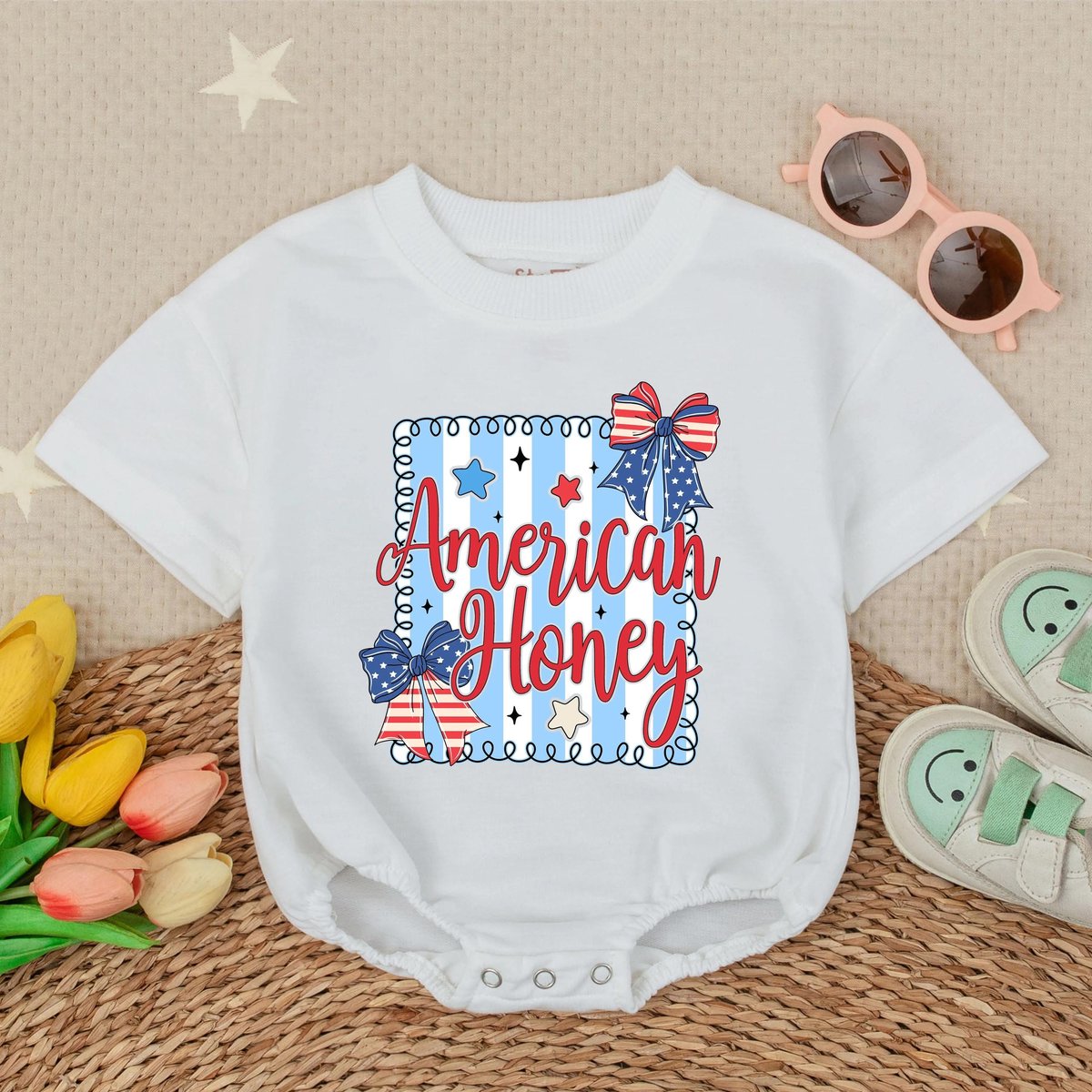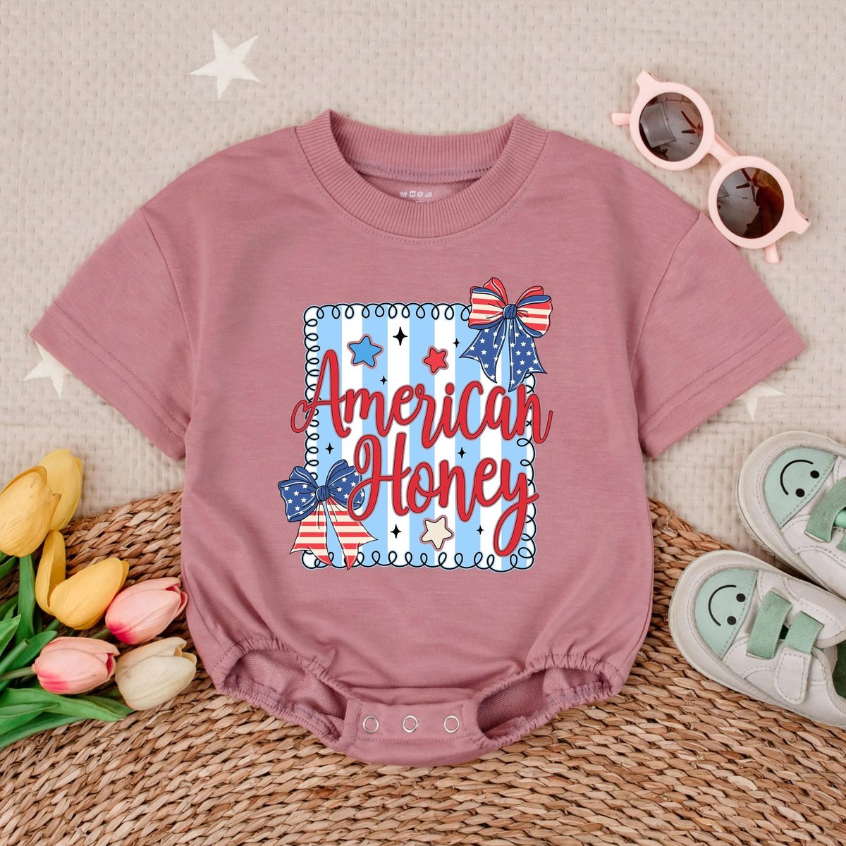 American Honey Bubble Romper Flag Bow Short Sleeve Toddler Outfit Patriotic Kids Clothes 4th of July