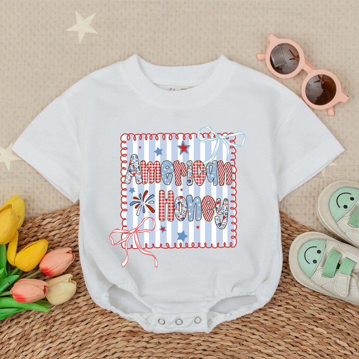 American Honey Short Sleeve Romper American Flag 4th of July Bubble RomperKids USA Shirt USA Baby Clothing
