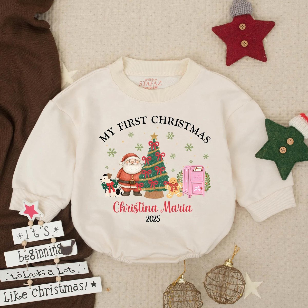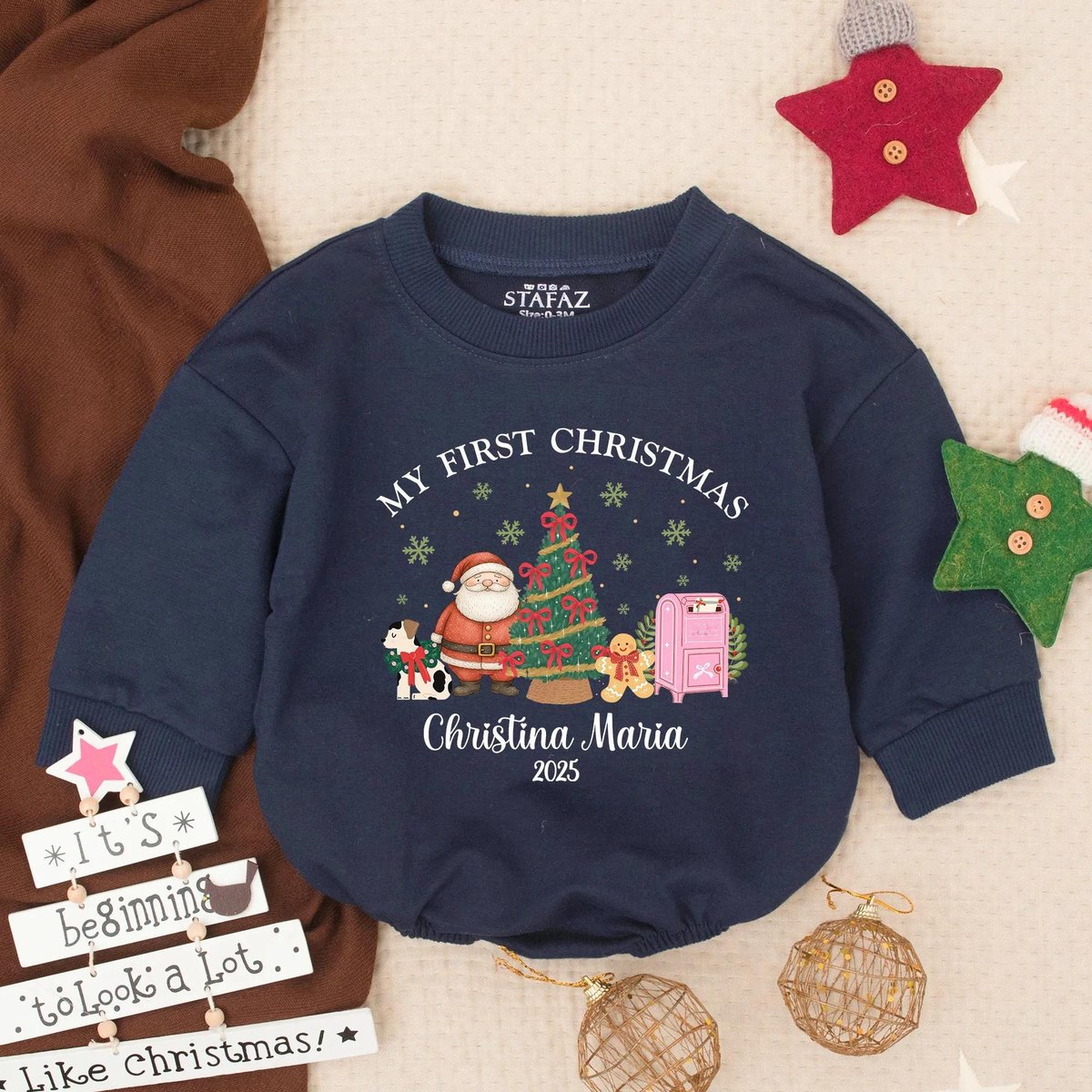 Baby Santa First Birthday Bubble Romper Personalized Christmas Outfit for Baby Holiday Sweatshirt In
