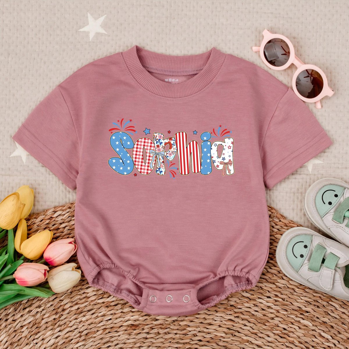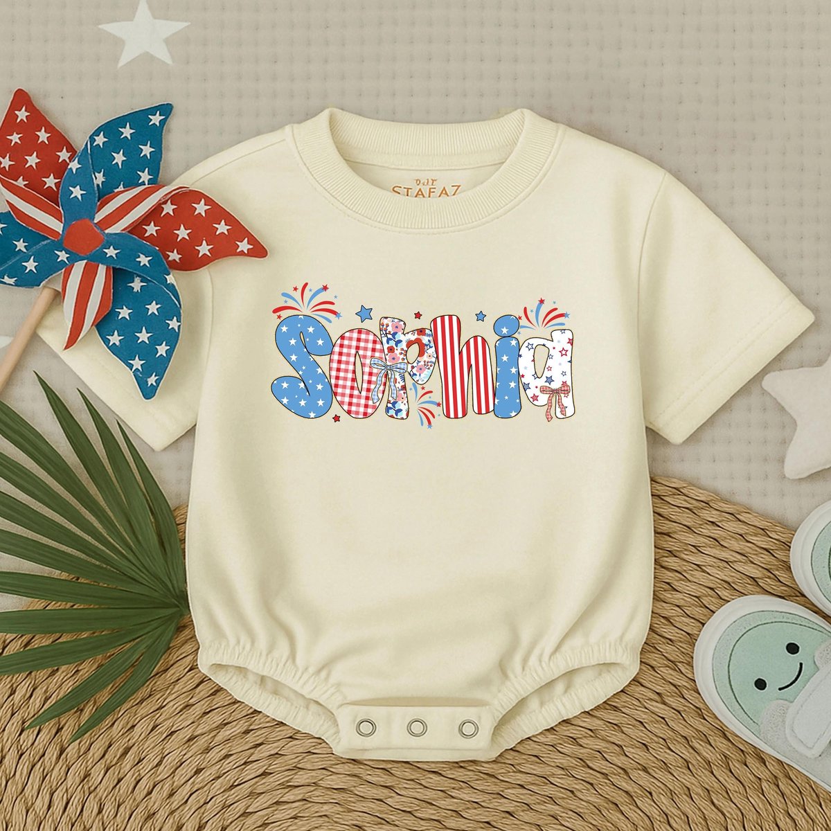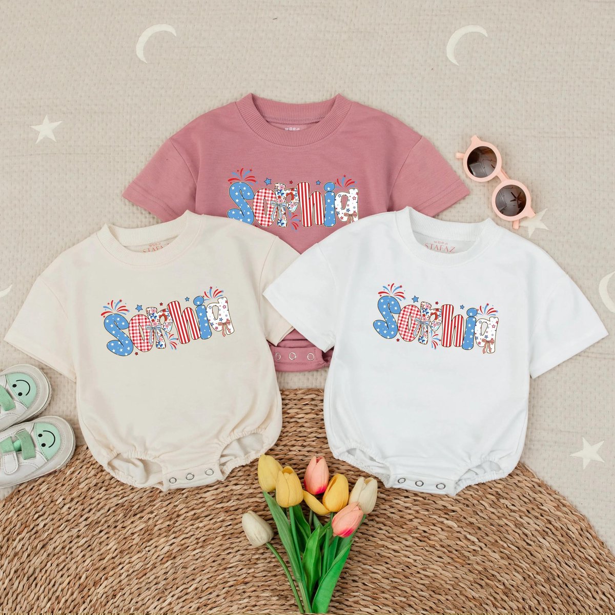 Custom Name 4th of July Baby Bubble Romper Personalized Red White Blue Short Sleeve Outfit USA Indep