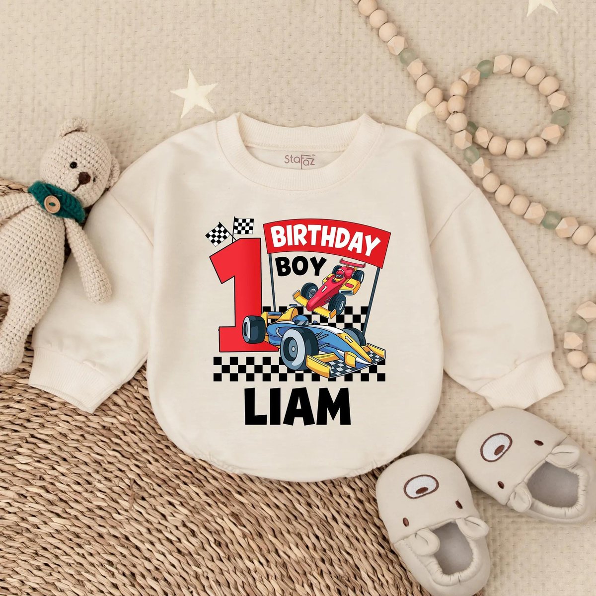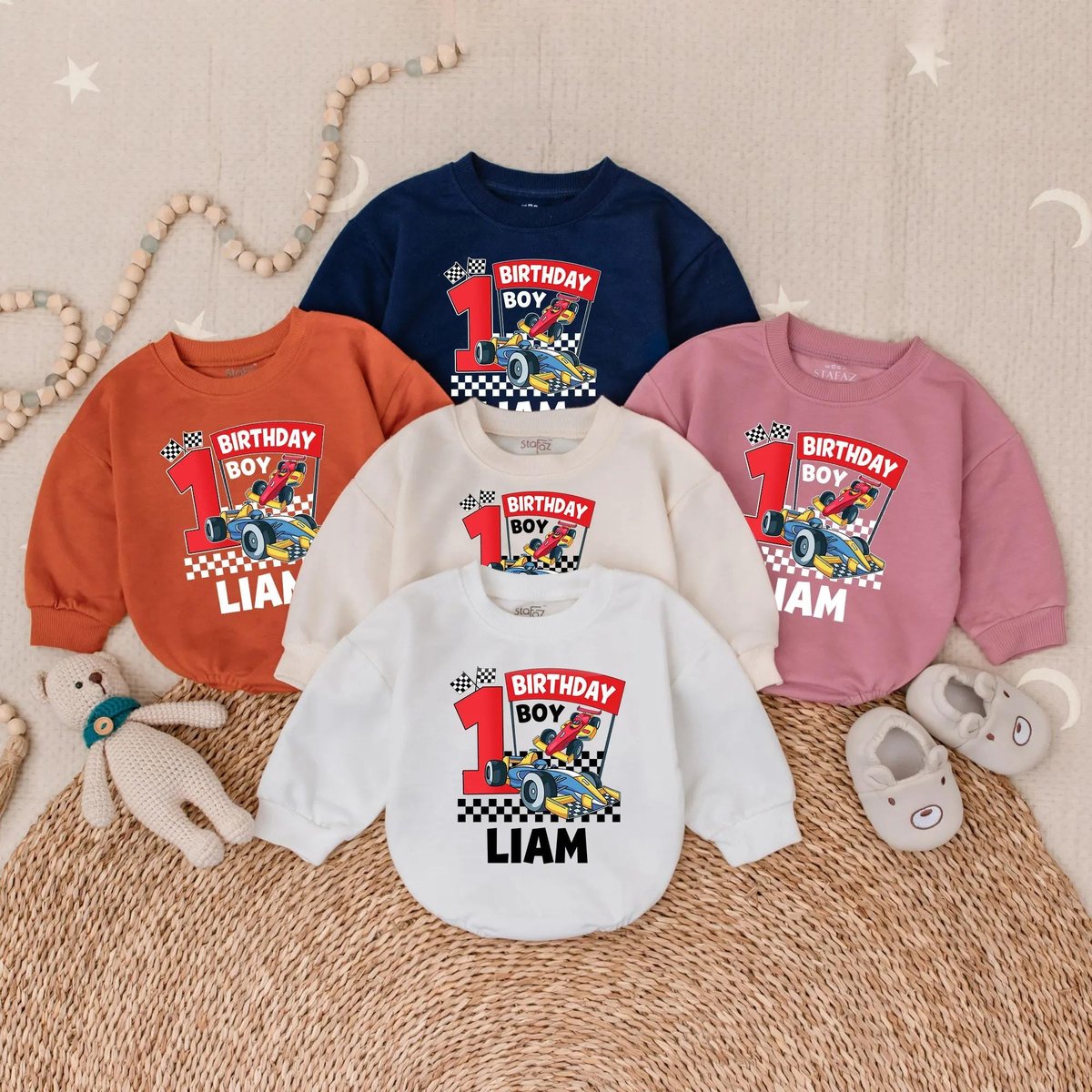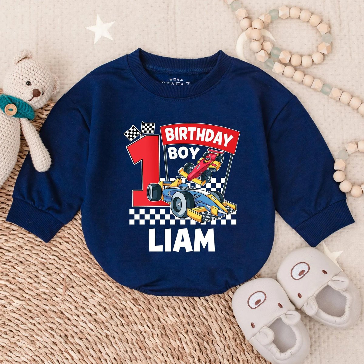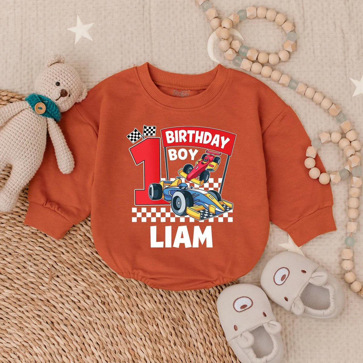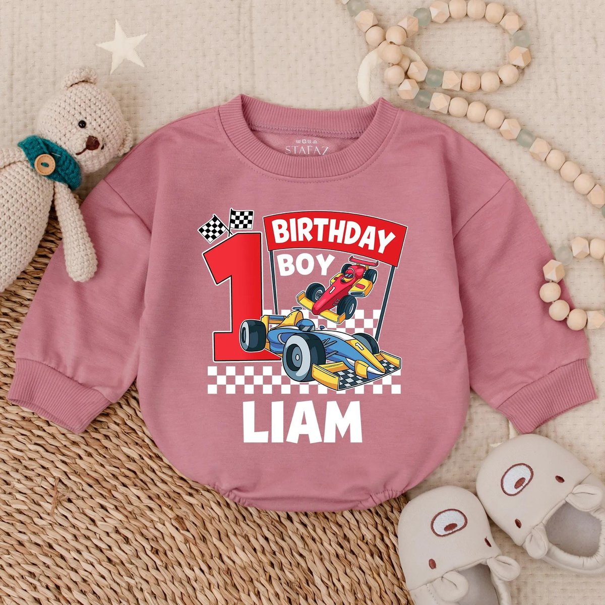 Customized Racing Car Birthday Boy Bubble Romper 1st Birthday Outfit Kids Race Car Graphic Oversize