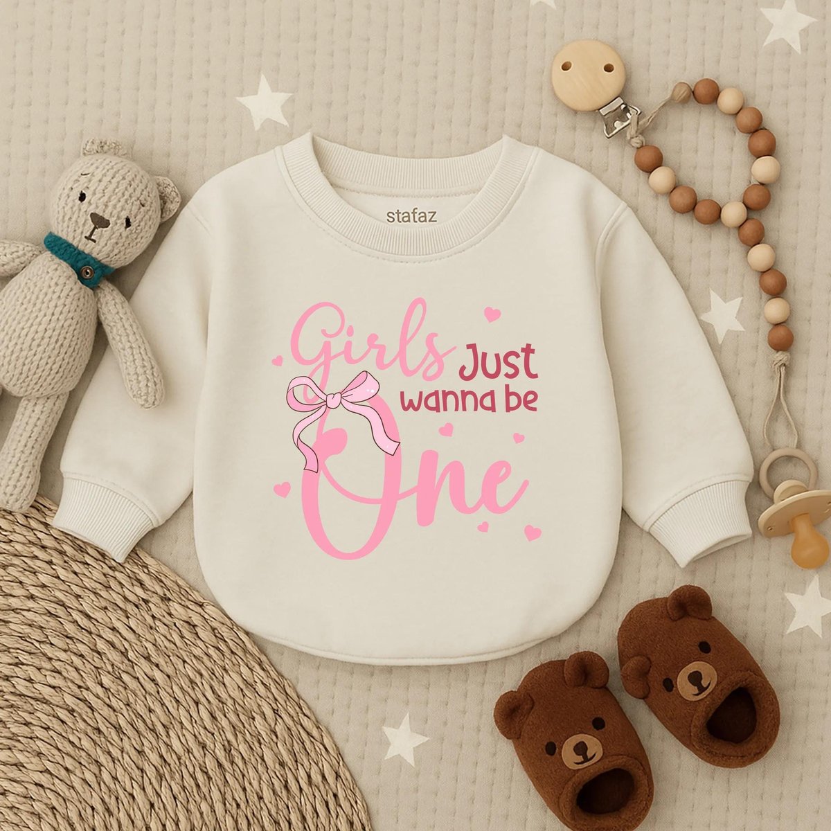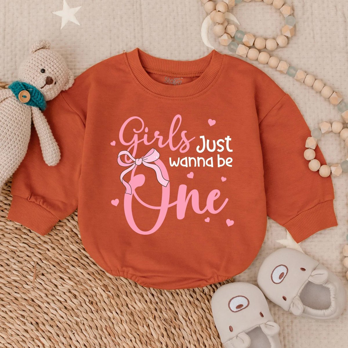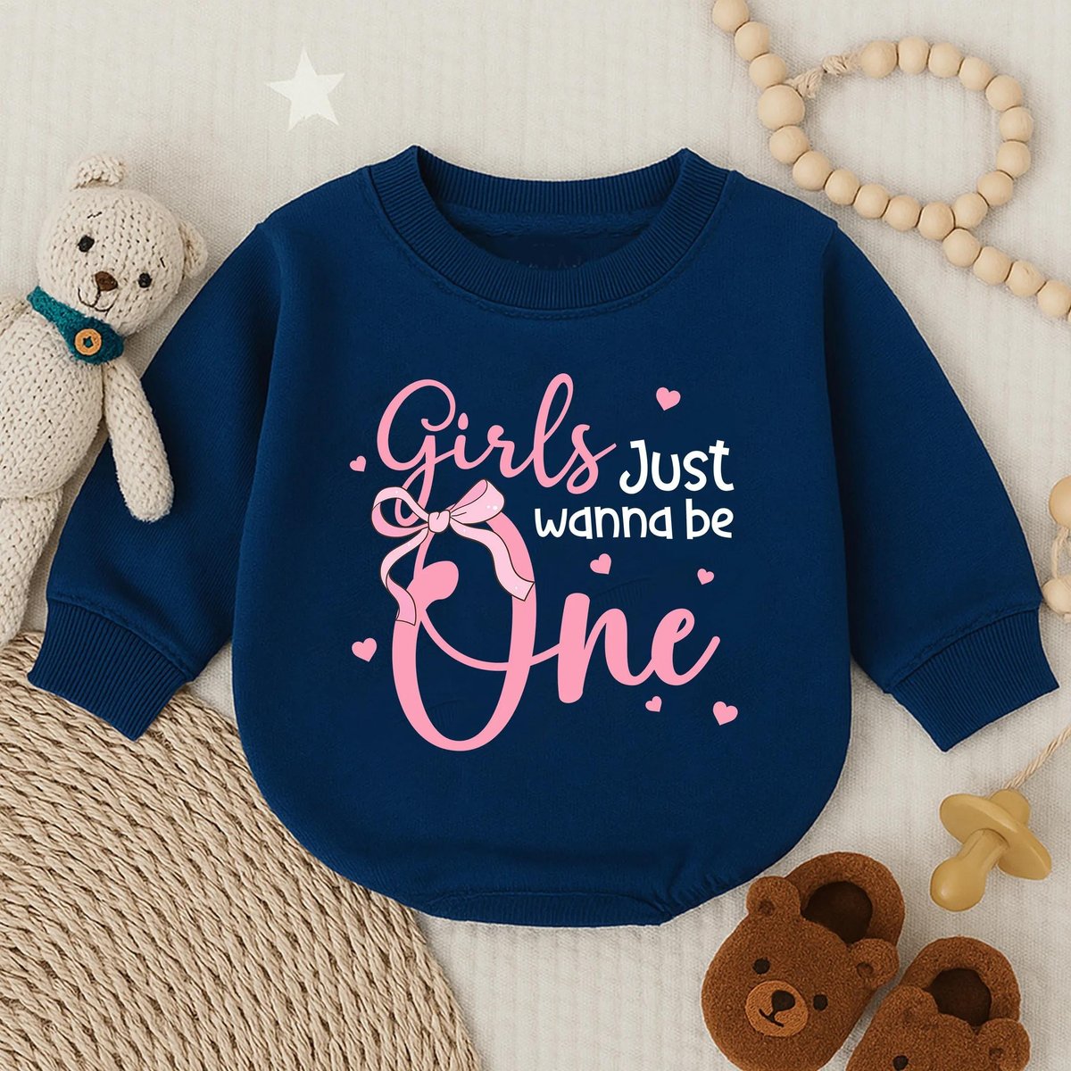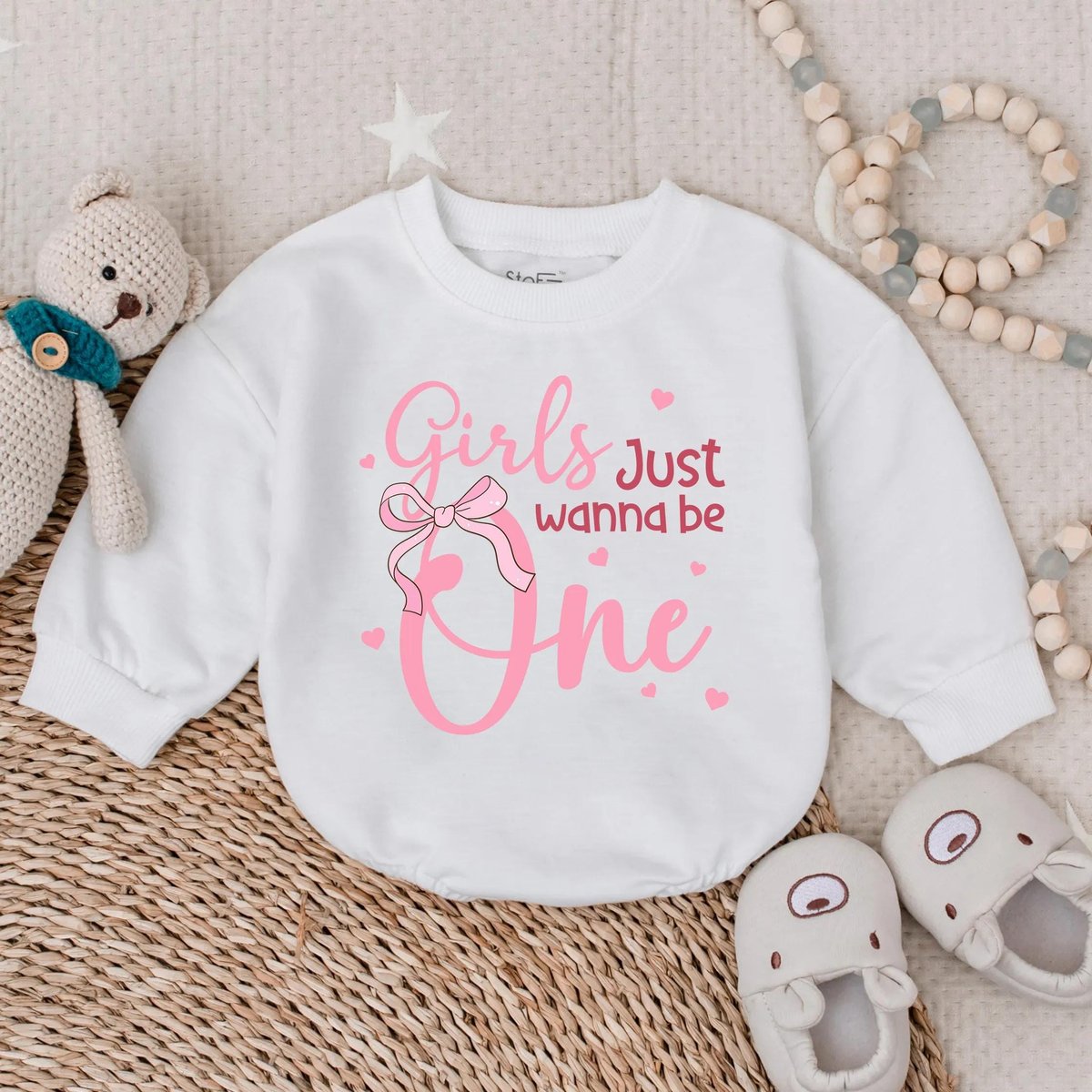 Girls Just Wanna Be One Romper First Birthday Baby Girl Outfit Pink Long Sleeve Bubble Romper Toddle