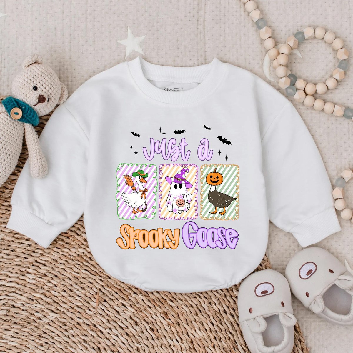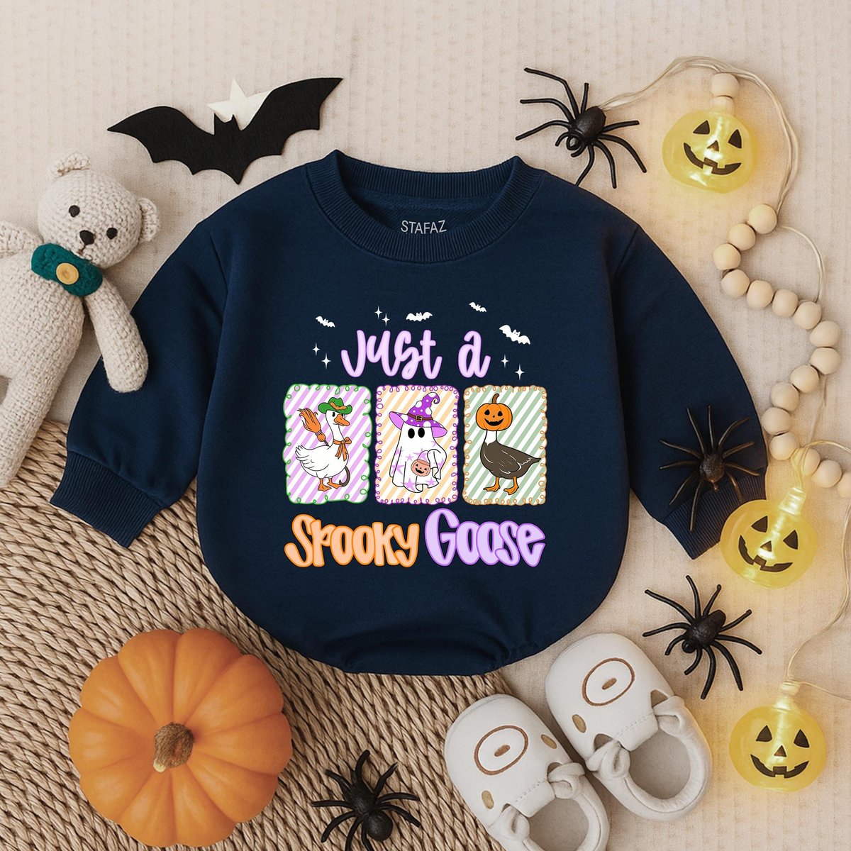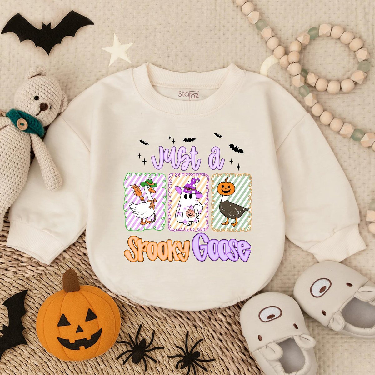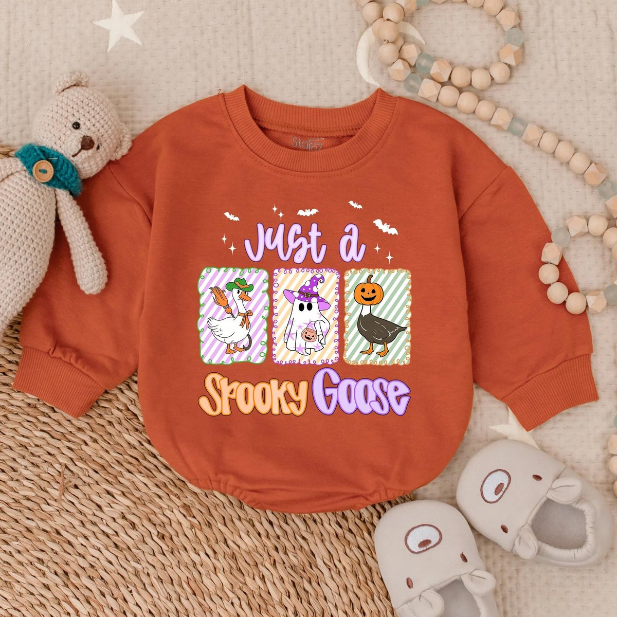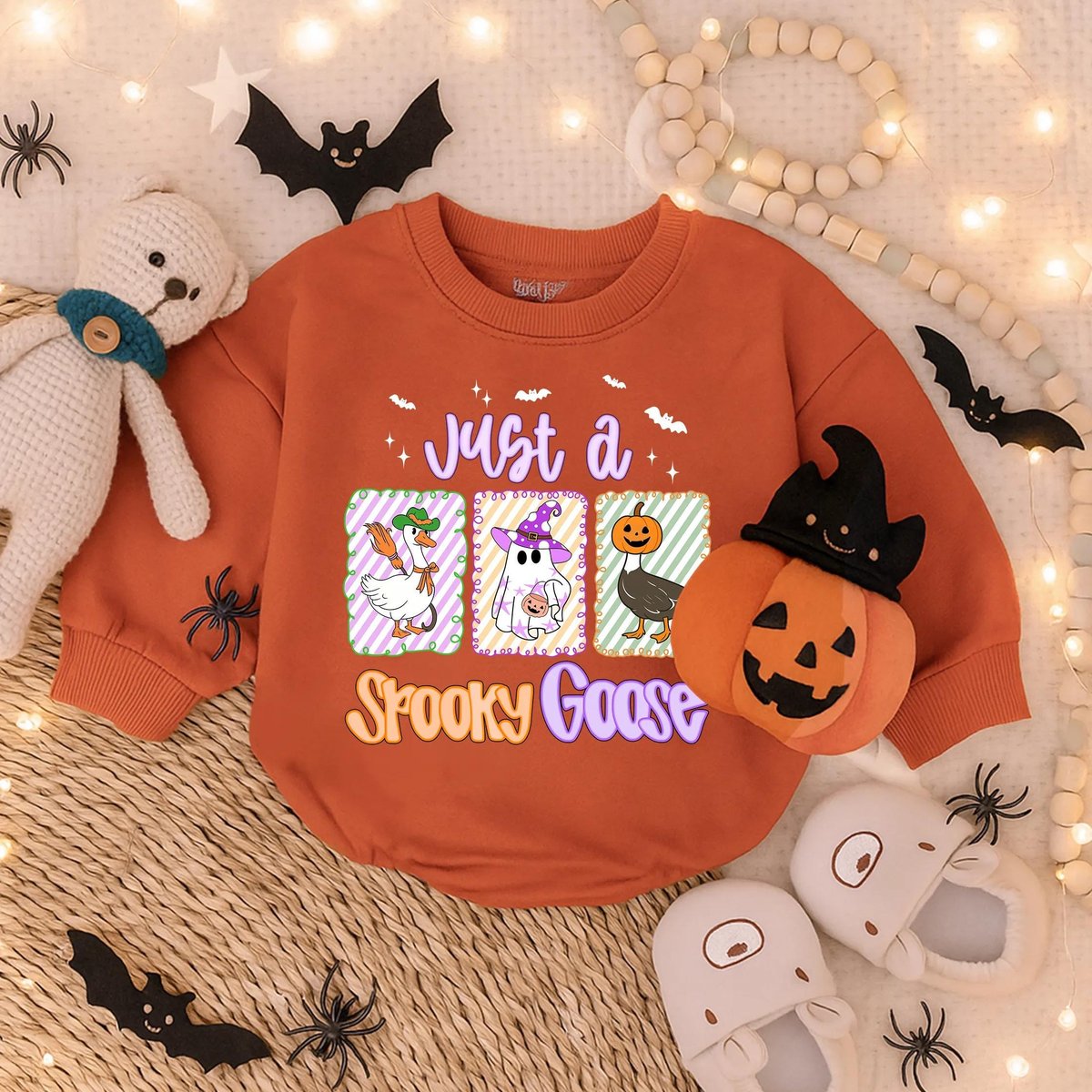 Just A Spooky Goose Pumpkin Baby Romper Funny Halloween Infant Outfit Cute Fall Bubble Bodysuit Goo