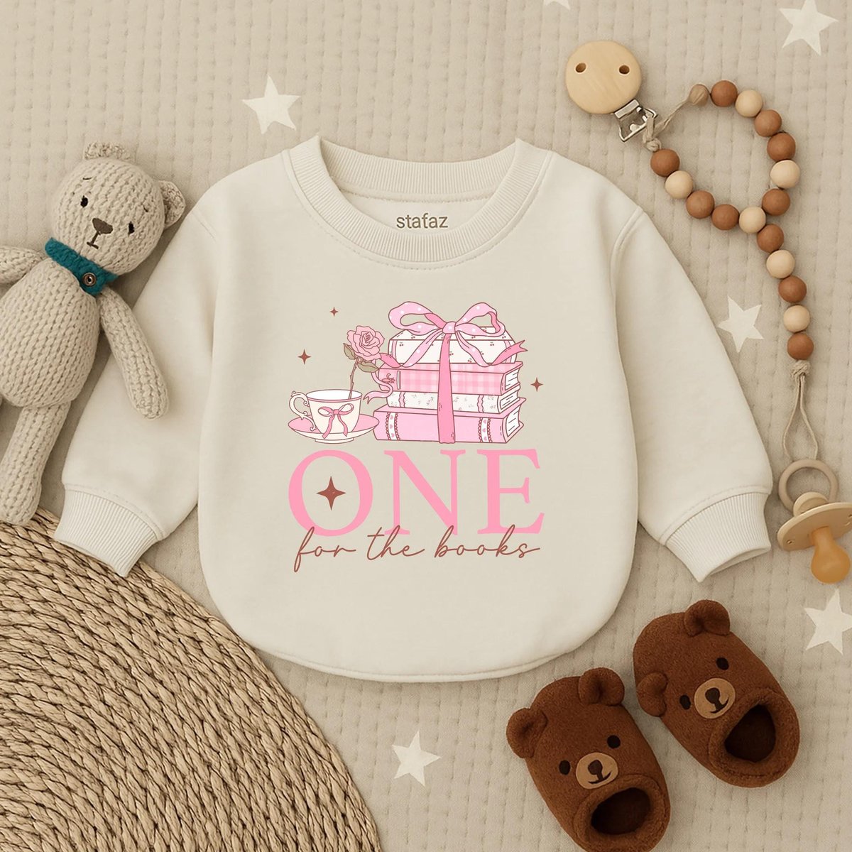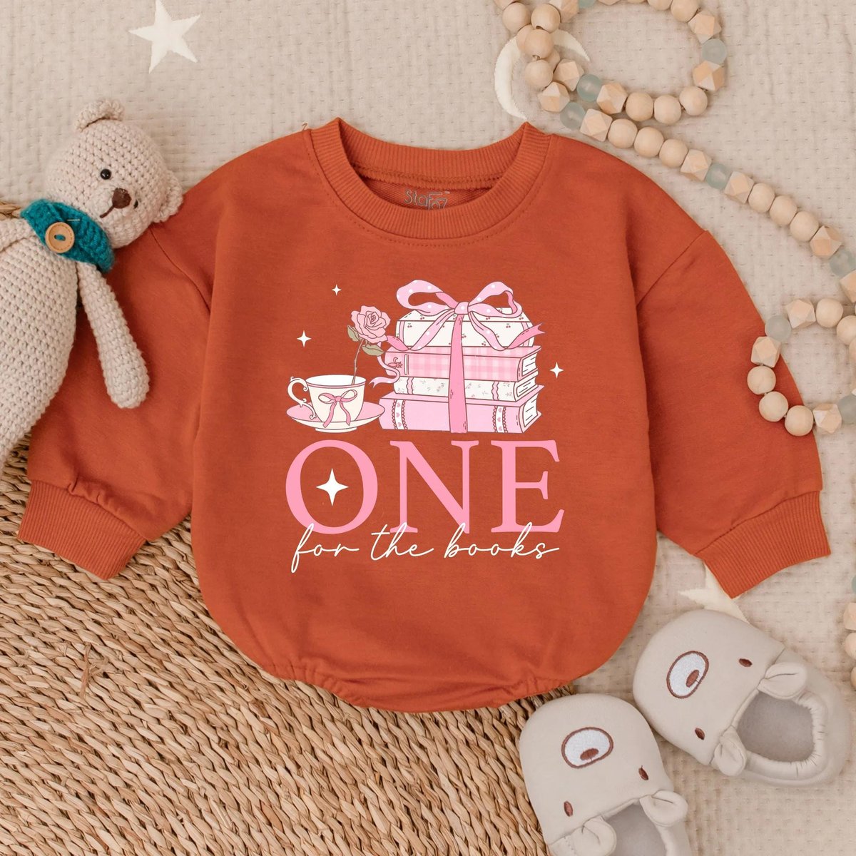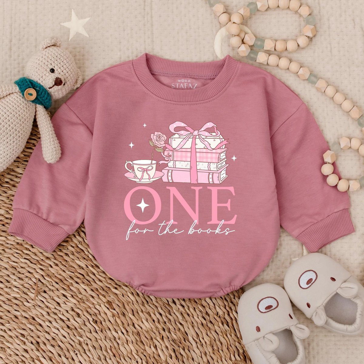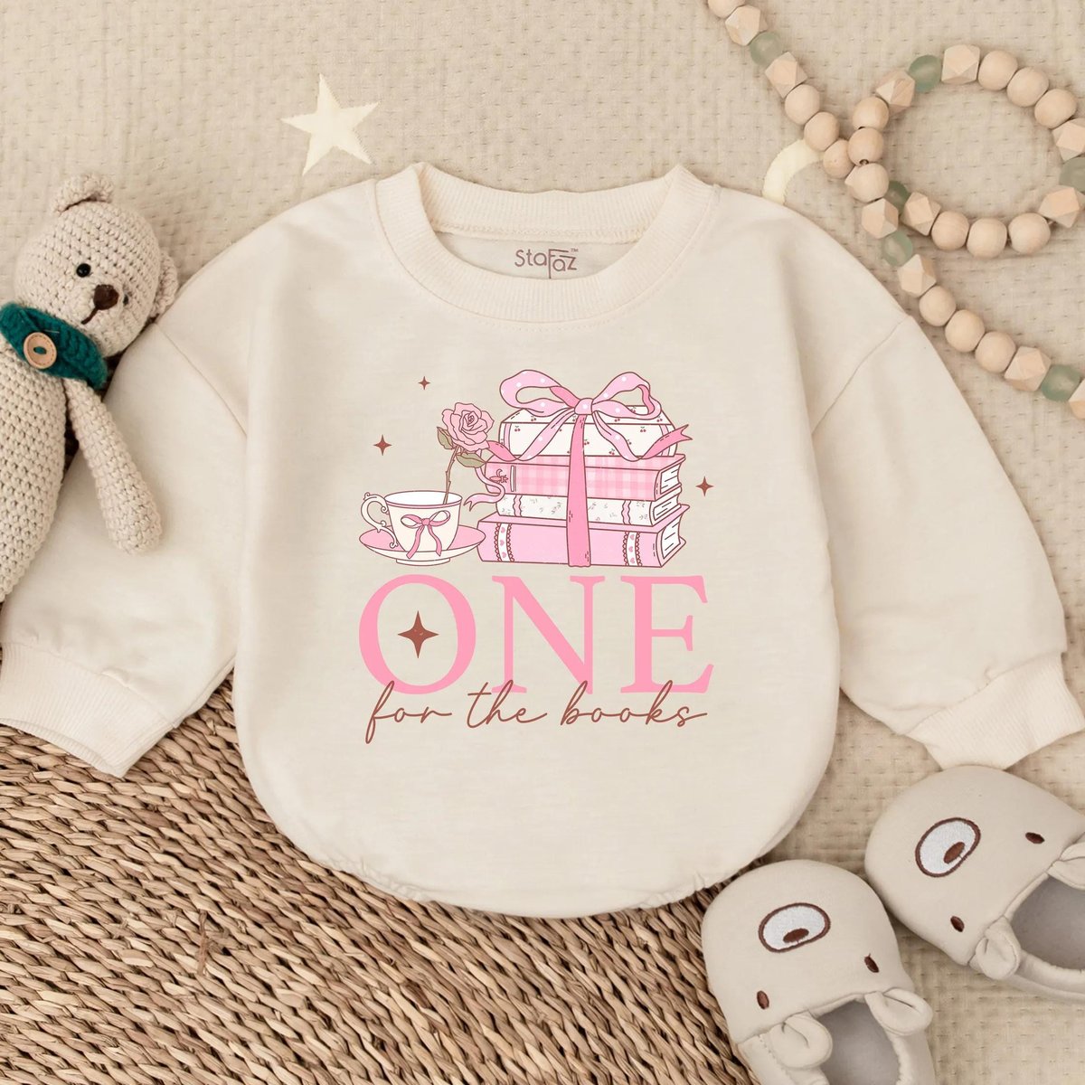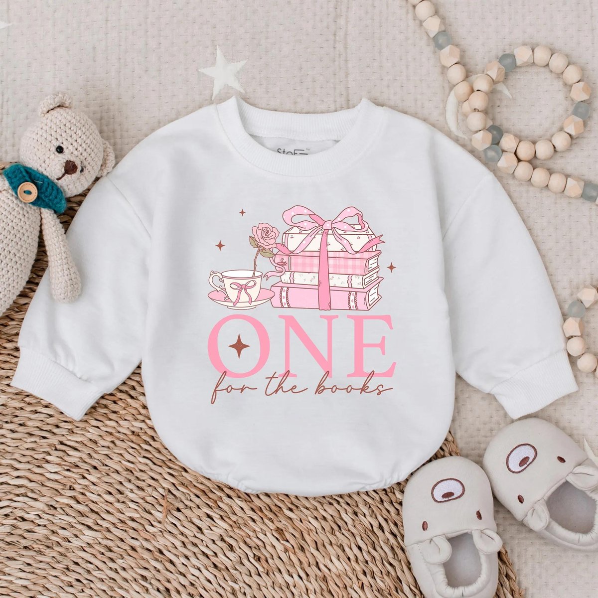 One for the Book Baby Girl Bubble Romper First Birthday Baby Kid Pink Books Floral Outfit Long Sleev