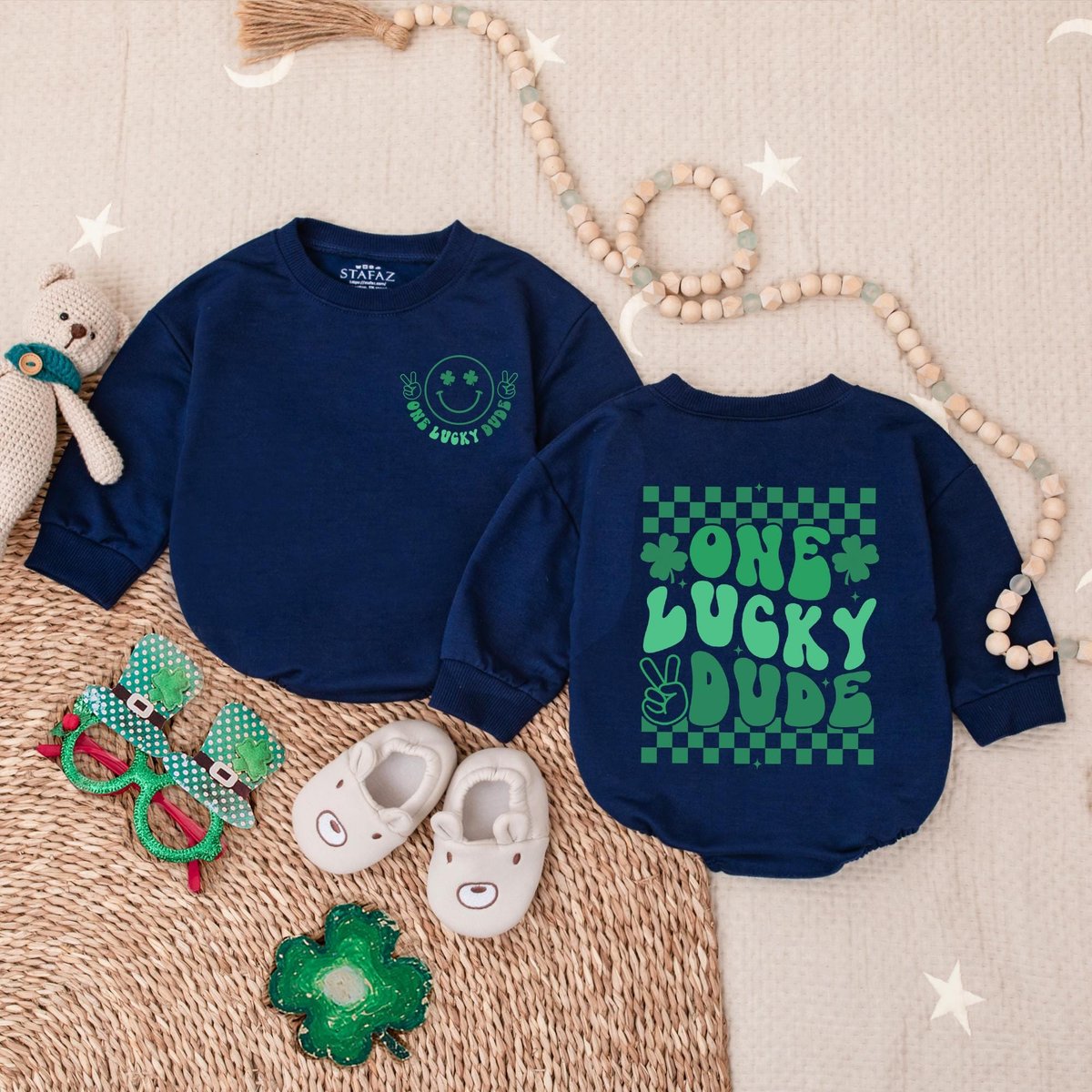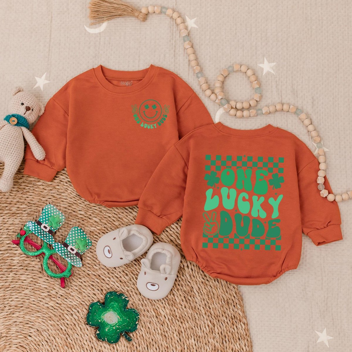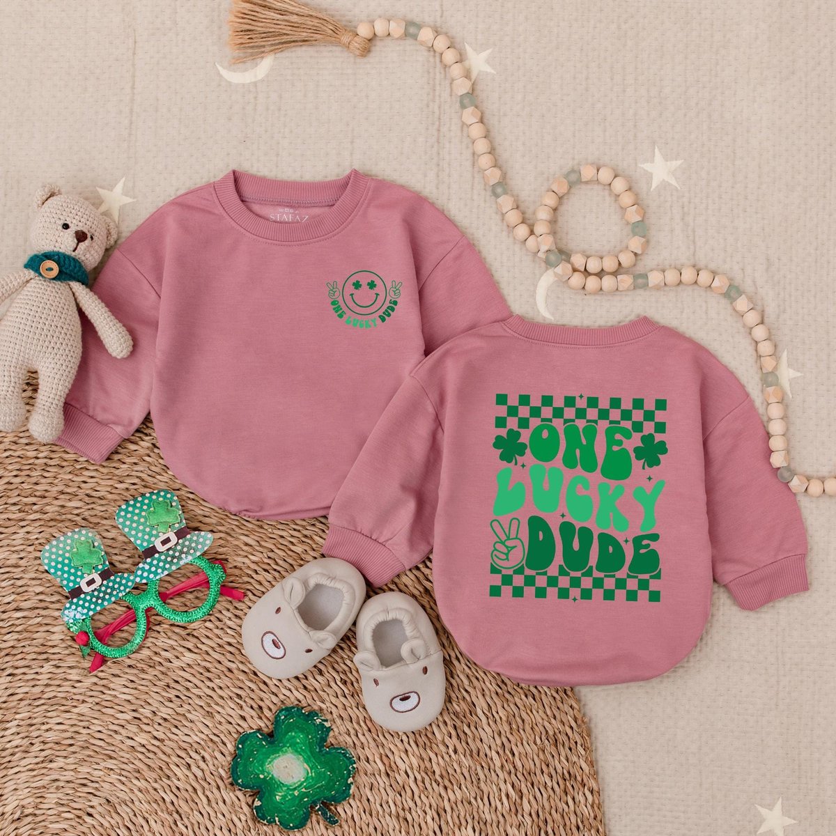One Lucky Dude Baby Bubble Romper St Patrick’s Day Bodysuit Irish Baby Outfit Light Mauve
